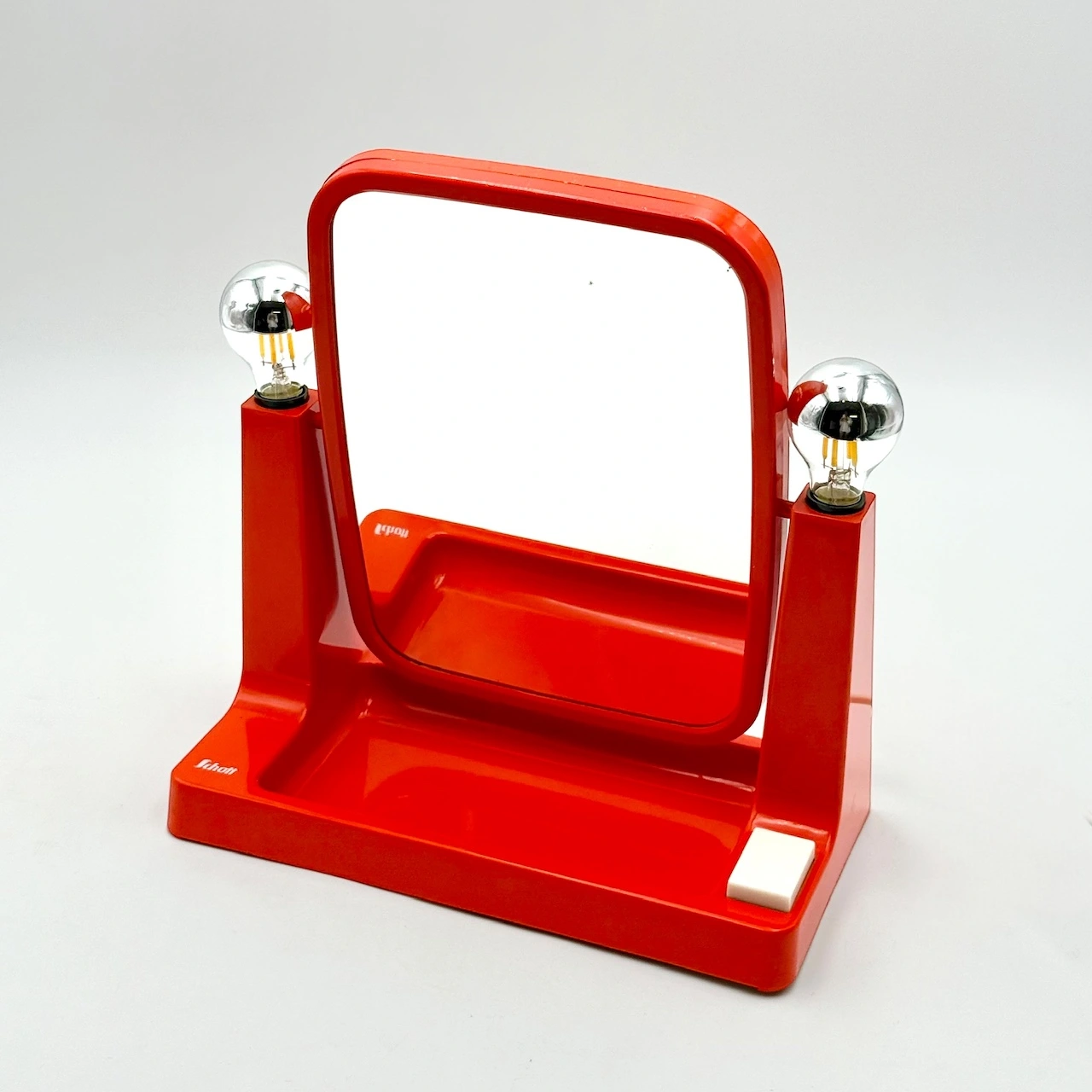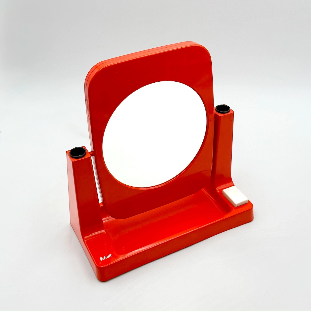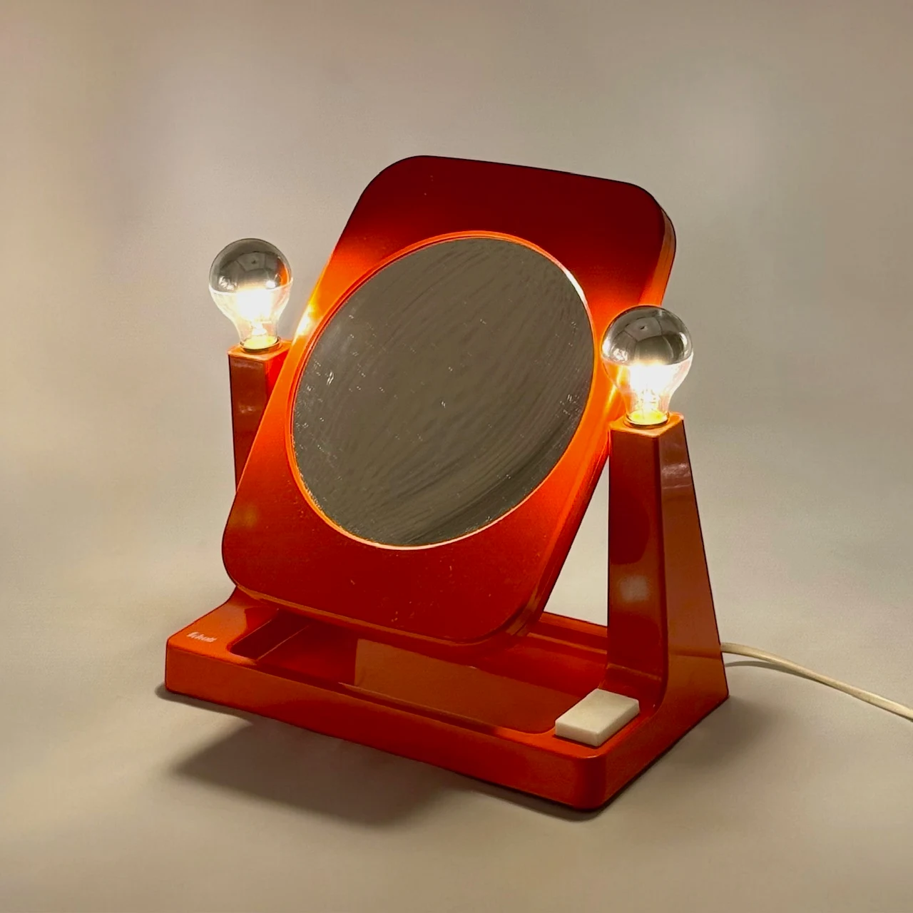 Charming space age makeup mirror with integrated lights and switch produced by Schott in the 70s. Vibrant orange finish and iconic retro modern shape.