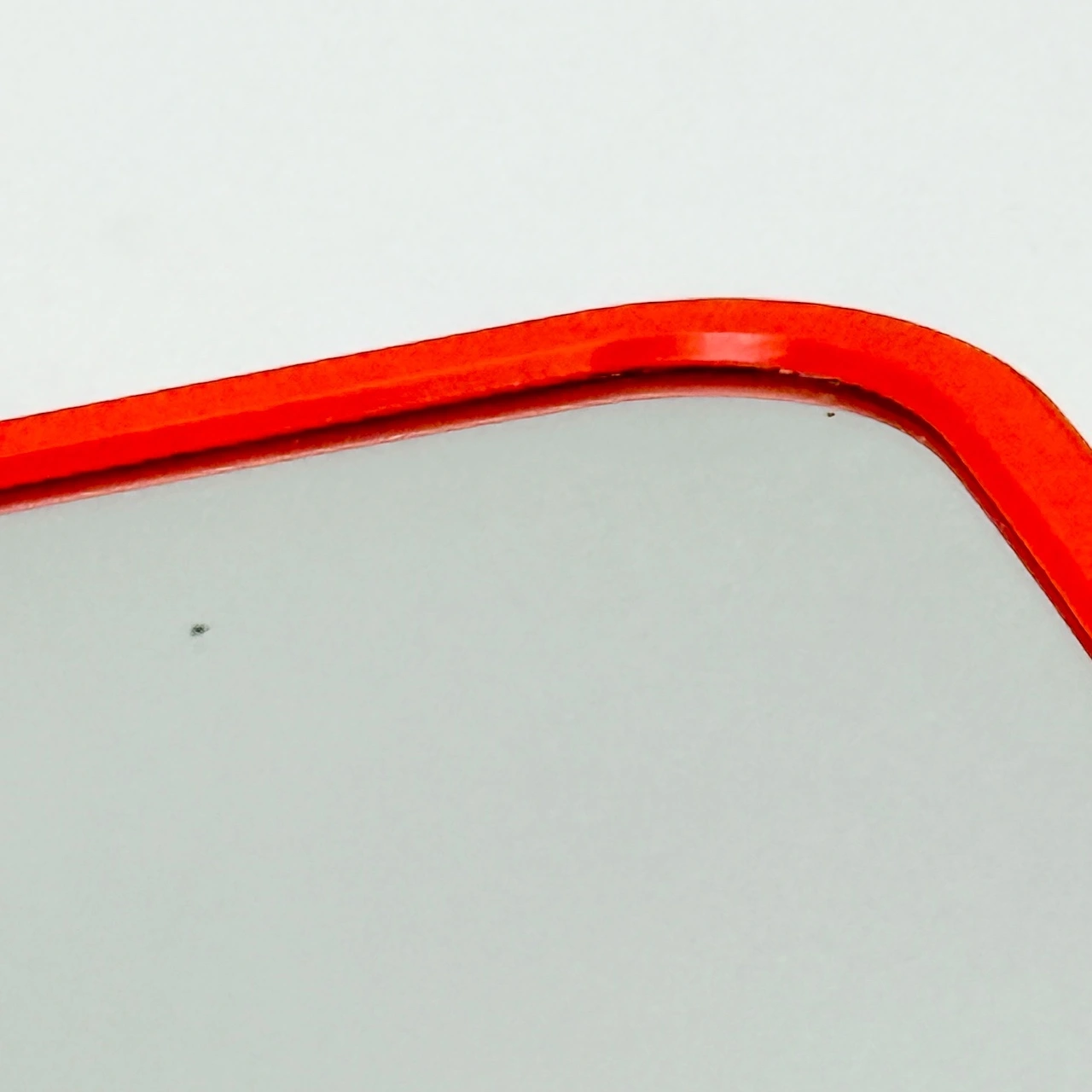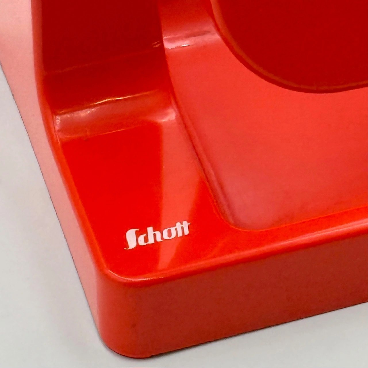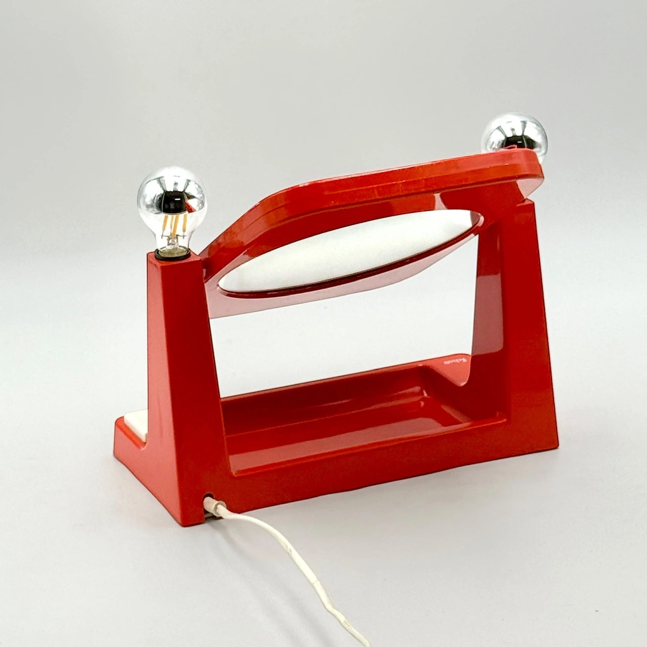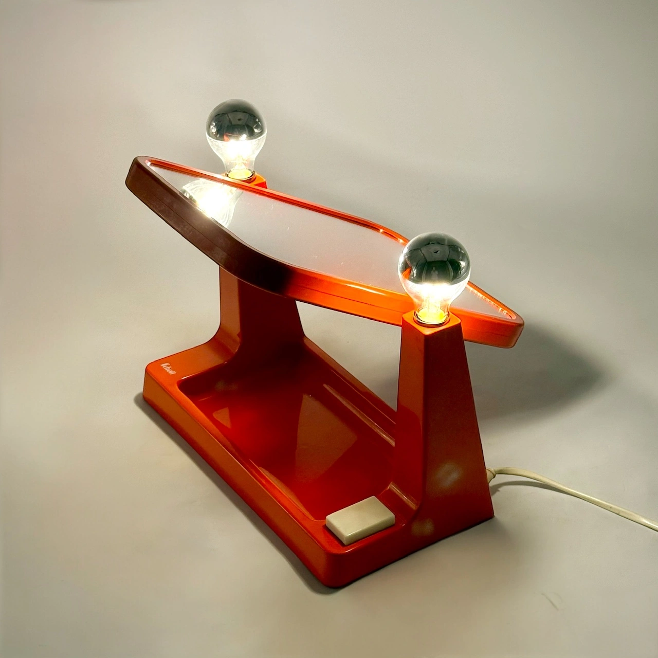 Charming space age makeup mirror with integrated lights and switch produced by Schott in the 70s. Vibrant orange finish and iconic retro modern shape.