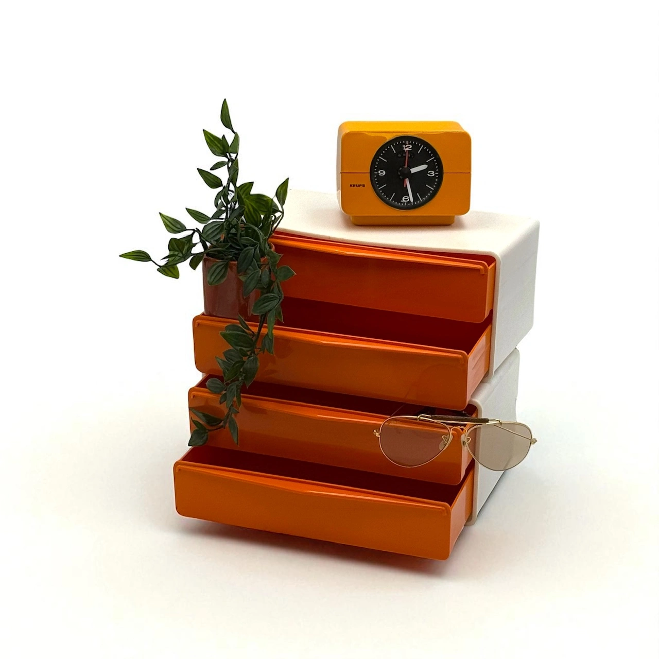 Each unit contains two pull-out drawers, perfect for organizing sunglasses, cables, stationery, or everyday bits and pieces. Their clean lines, recessed handles, and curved edges reflect the playful, future-forward ethos of 1970s European design.