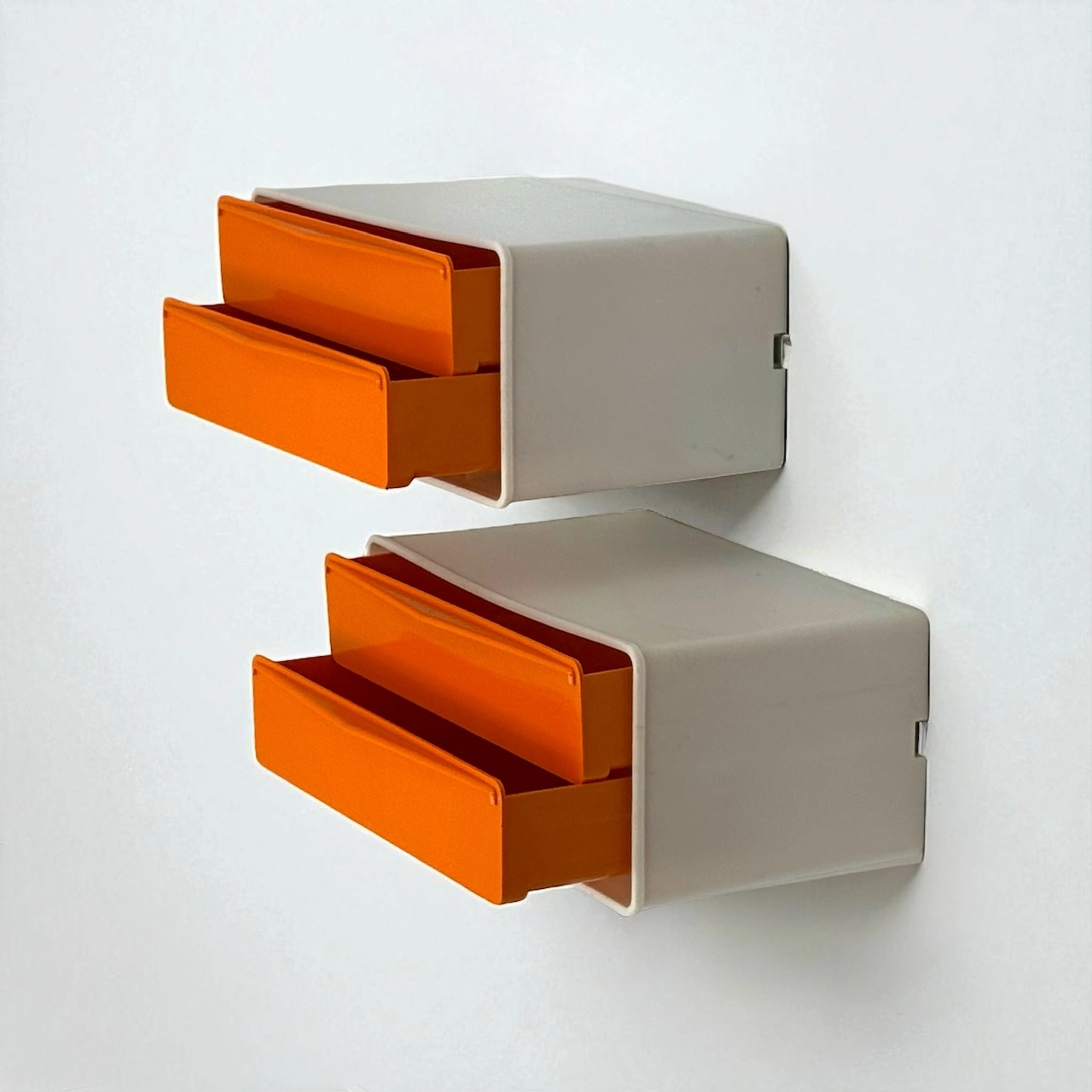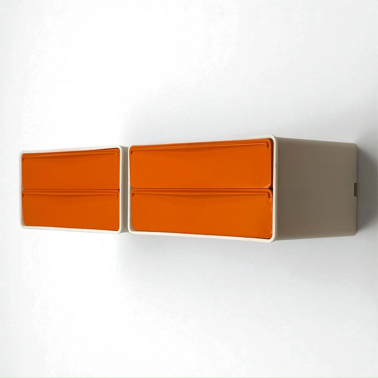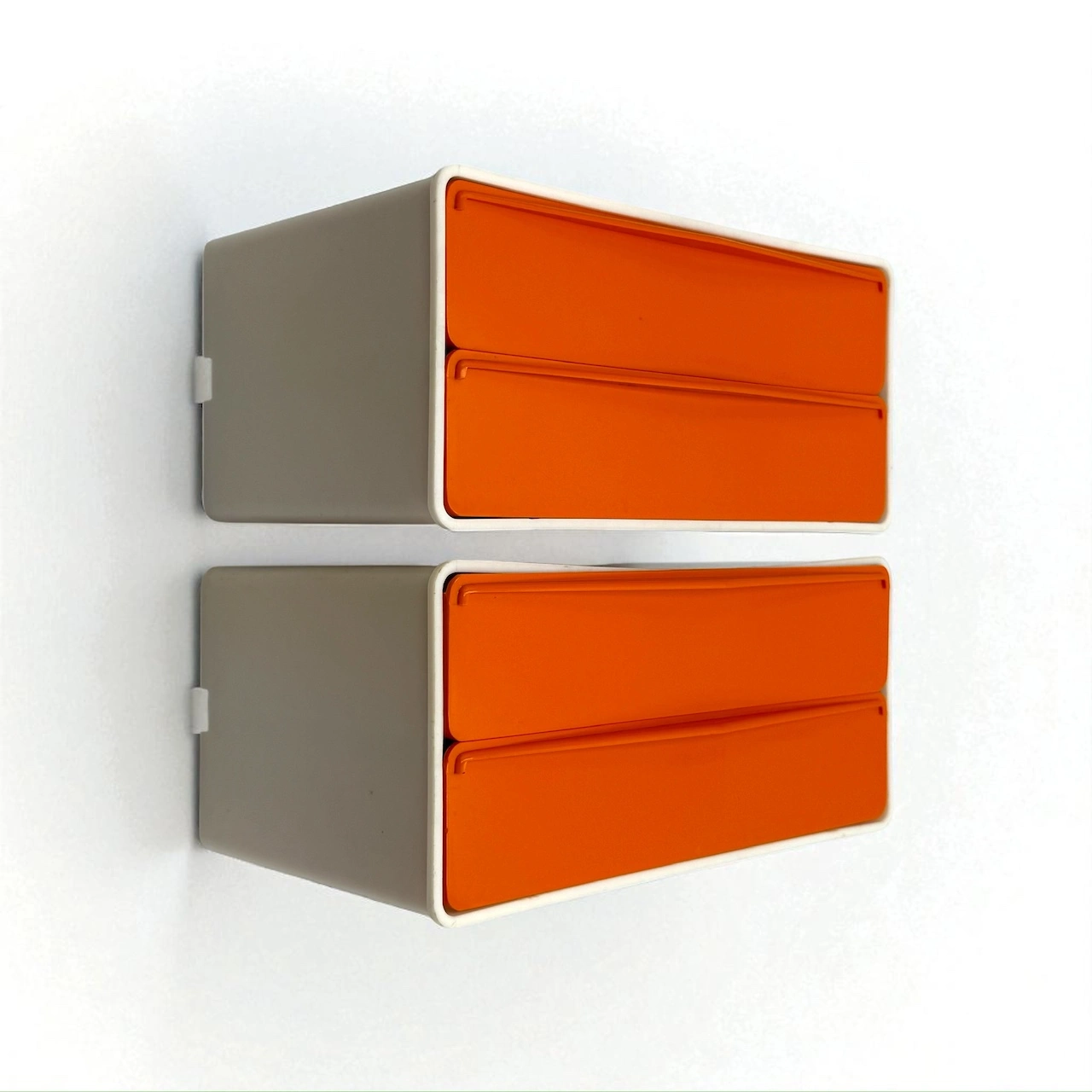 Two-tone wall-mounted drawers made by Flair, Holland in the 1970s in rare bright orange. A Space Age modular unit with bold visual impact—both decorative and functional. Stackable, lightweight, and pure 70s attitude.