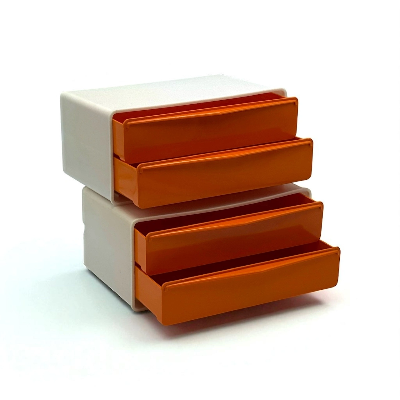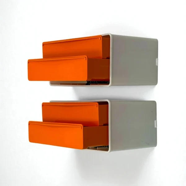 These orange wall drawers made by Flair in the 1970s are a vibrant example of modular Space Age design. With a bold two-tone look—glossy orange drawers and cream-beige casing—they bring color and graphic clarity to any wall. The lightweight plastic units are stackable and wall-mountable, offering flexible use in entryways, studios, bedrooms or kitchens.