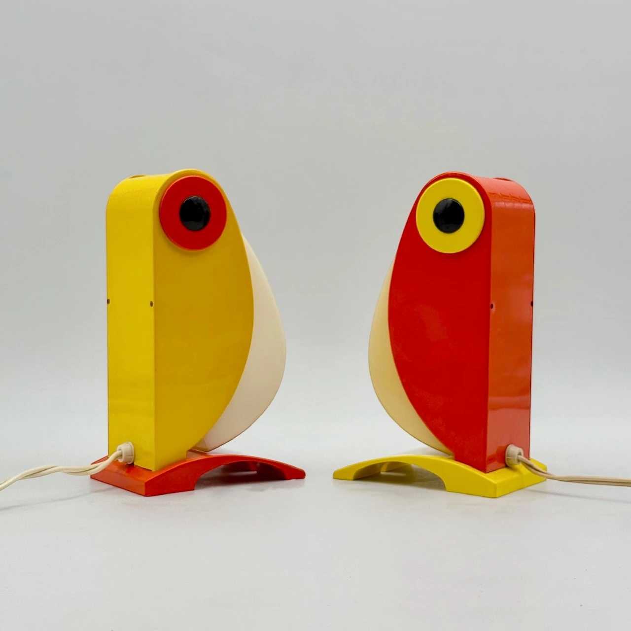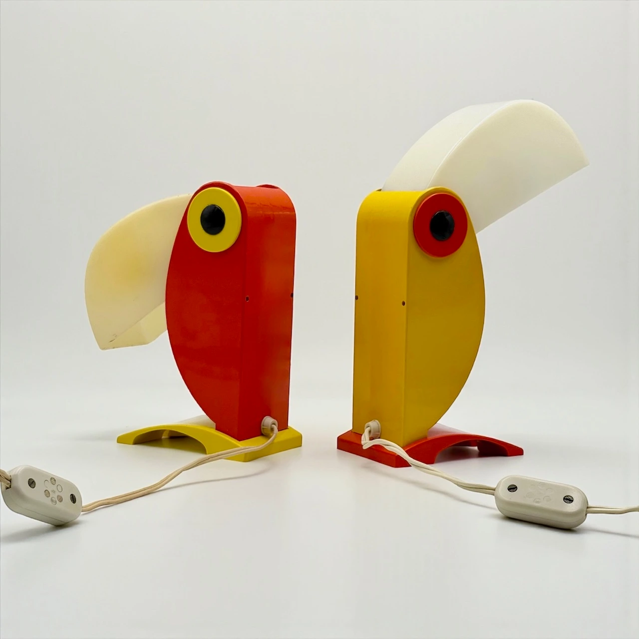 Rare pair of 1970s Toucan lamps by Enea Ferrari for Old Timer Ferrari. Iconic Italian Space Age design in contrasting red and yellow palettes. Excellent vintage condition. A highly collectible and visually striking design duo.