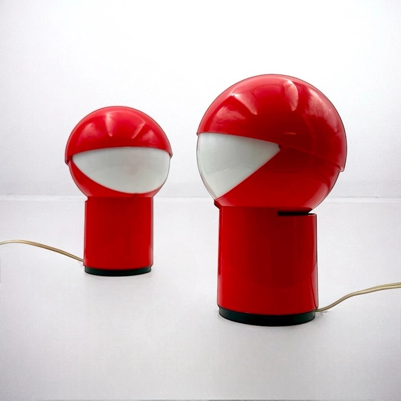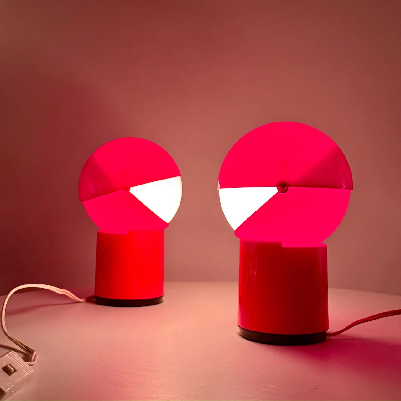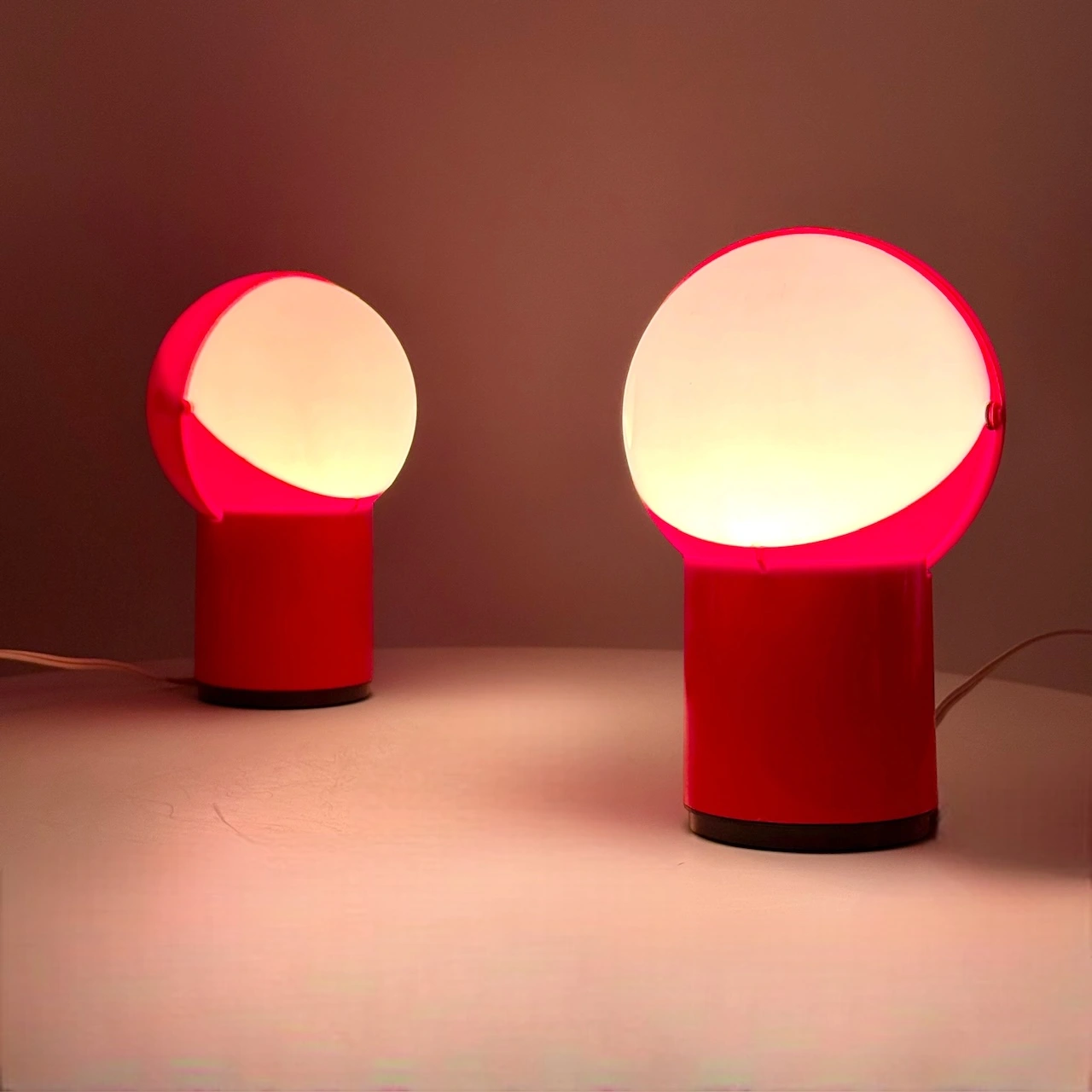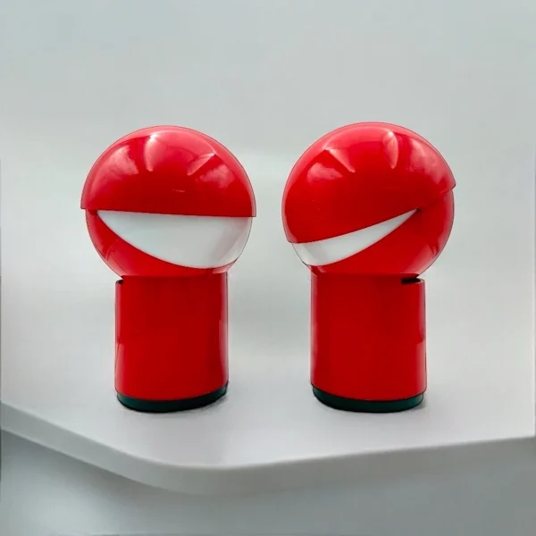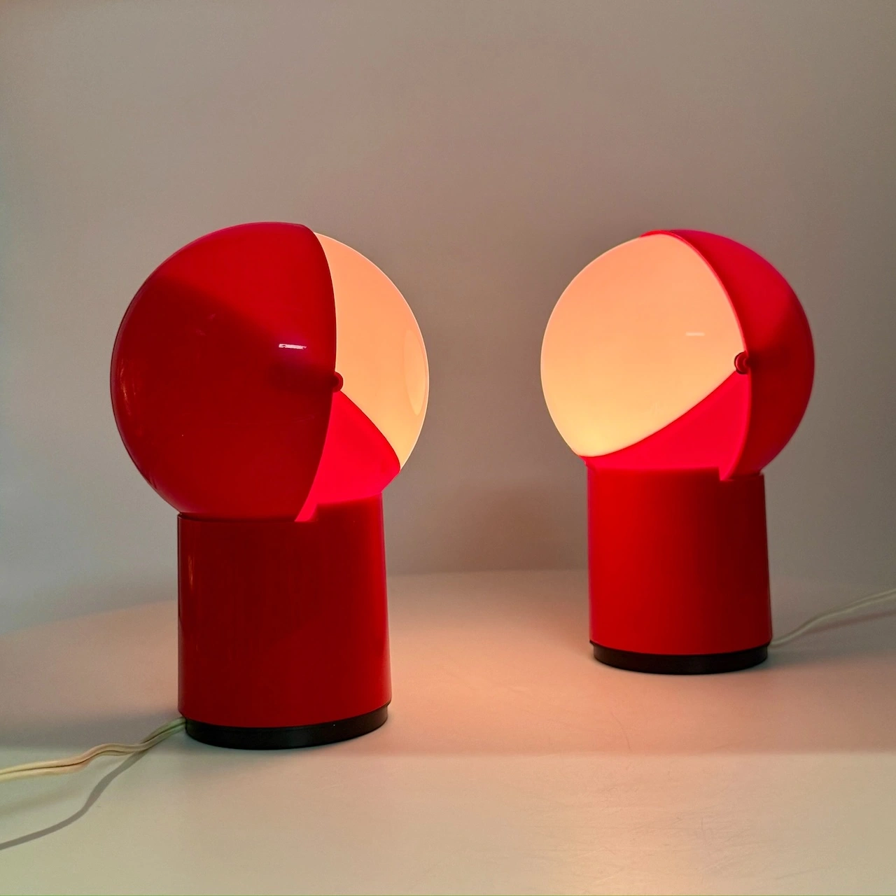Each lamp features an adjustable lampshade, allowing for controlled light diffusion, much like the renowned ‘Eclisse’ lamp. The striking red finish enhances their retro appeal, adding a distinctive 70s touch to any vintage or Space Age-inspired interior.