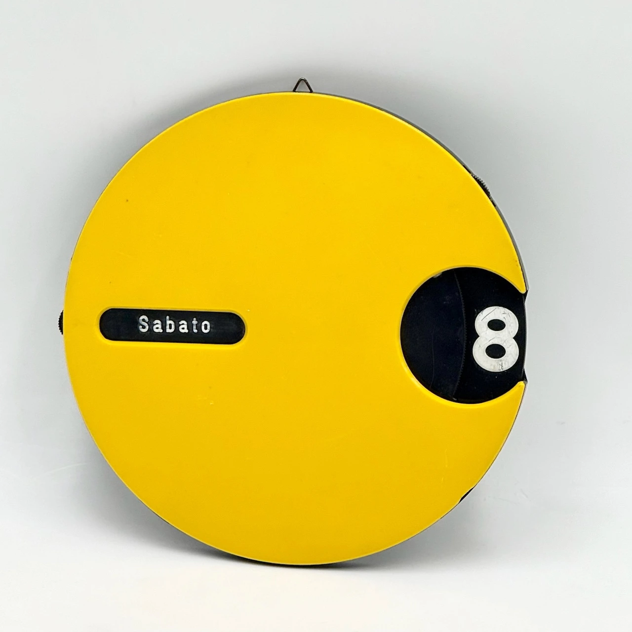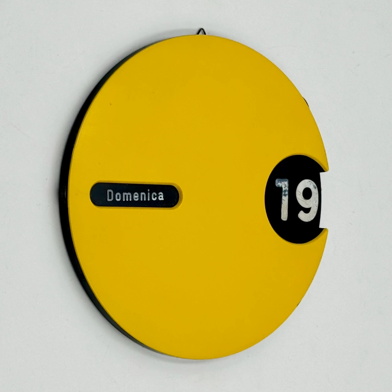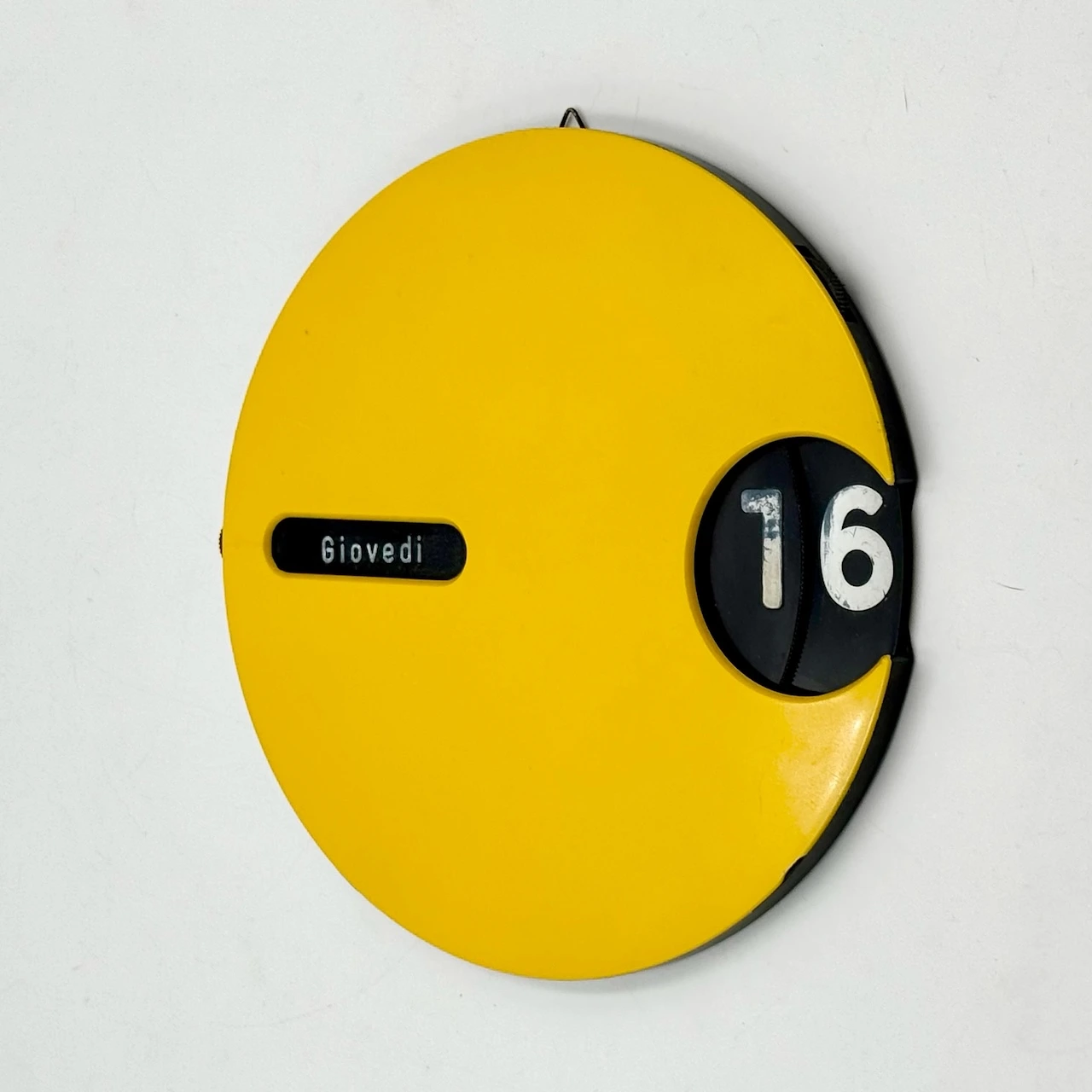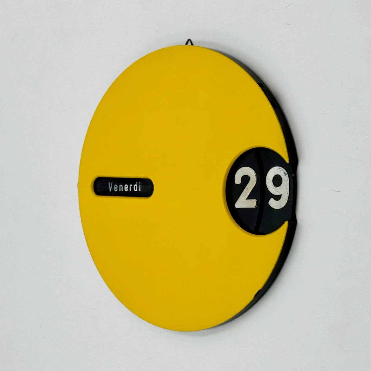 A rare perpetual wall calendar made in Italy in the 1970s. Defined by a bold circular shape, glossy yellow finish and rotating black dial, it blends graphic clarity with playful modern design.