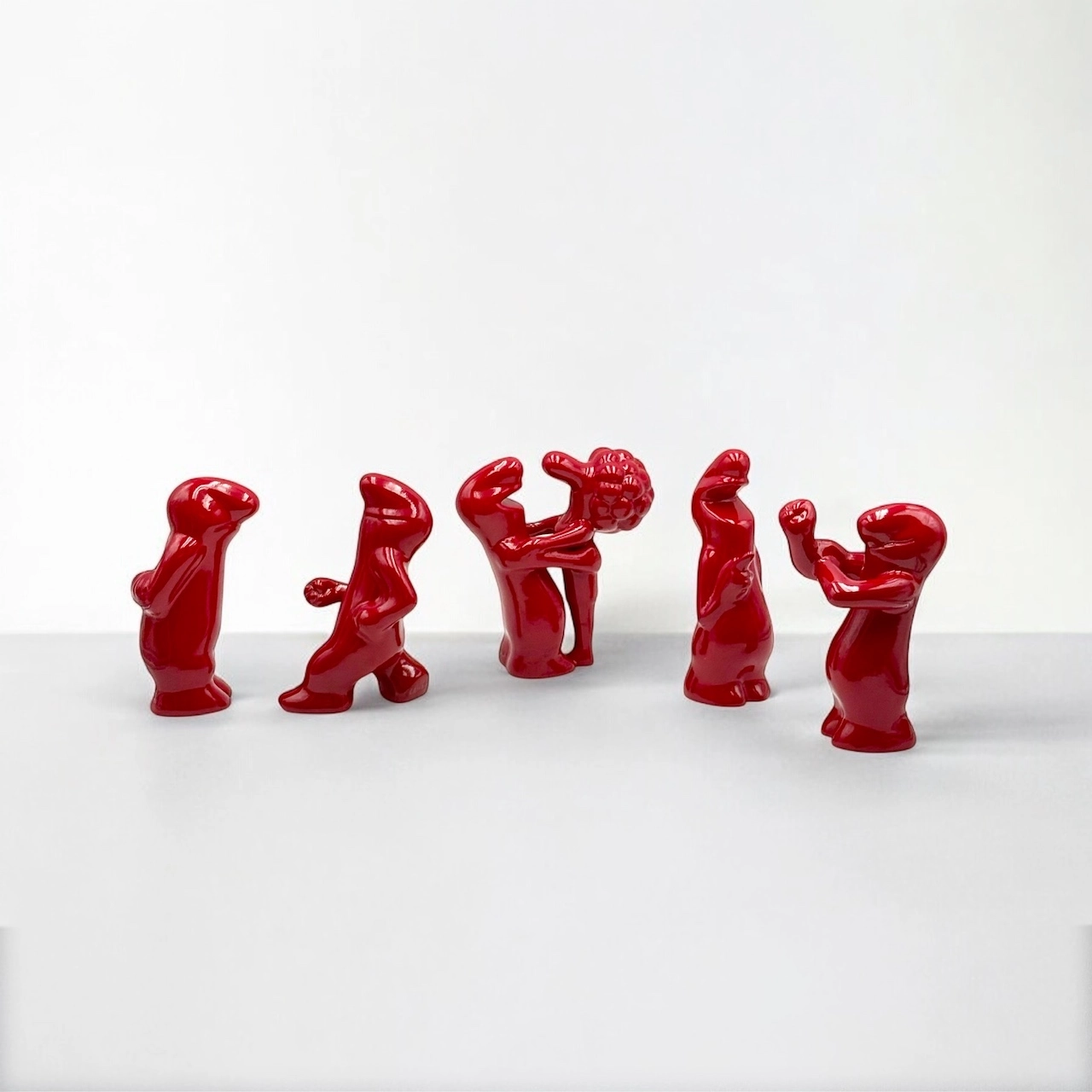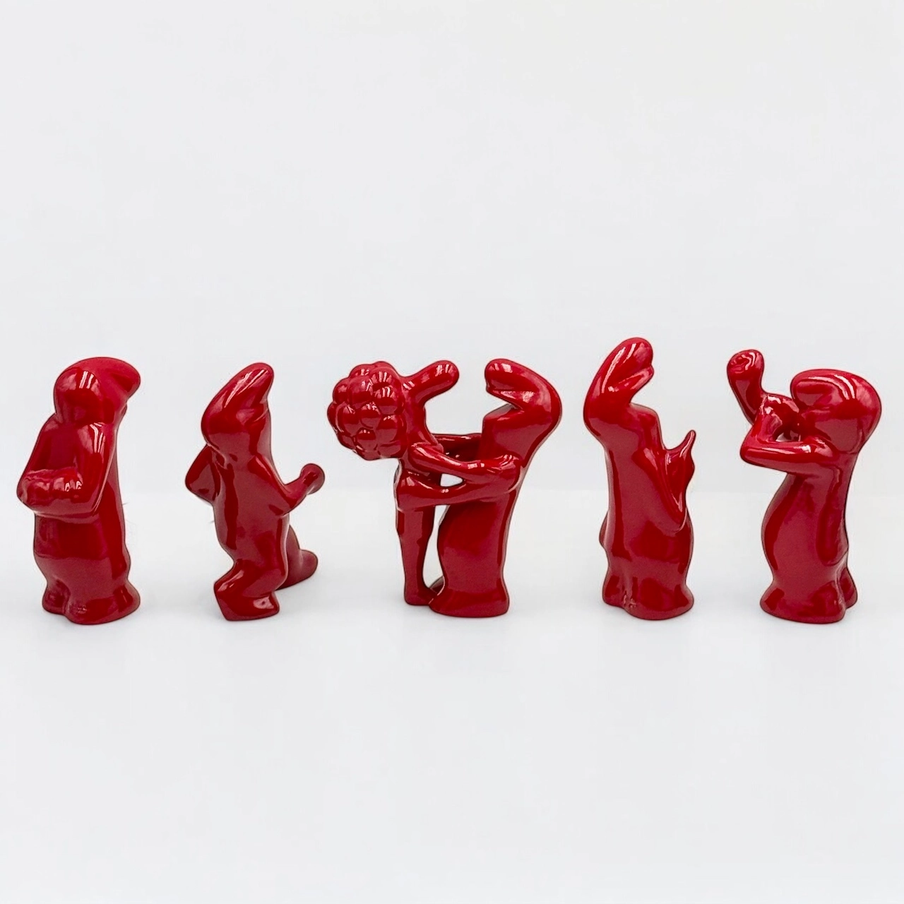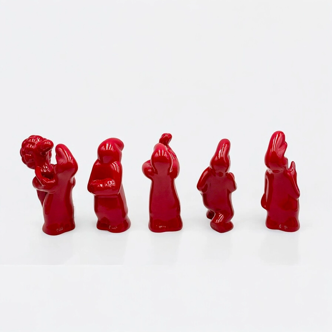 Rare and highly sought-after, this complete set of five ceramic figurines comes from the iconic La Linea series by Osvaldo Cavandoli, originally crafted between the late 1950s and 1970s. A true gem for collectors of 1960s ceramic figurines, these glossy flame-red sculptures embody the witty, expressive spirit of Cavandoli’s celebrated animated character.