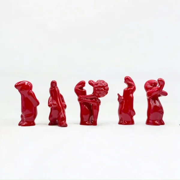 Each figurine presents a different playful pose — walking, laughing, sulking, gesturing boldly, and embracing — instantly recognizable to fans of Cavandoli’s work. Their stylized forms are both minimalist and deeply expressive, making them captivating pieces of mid-century modern art.