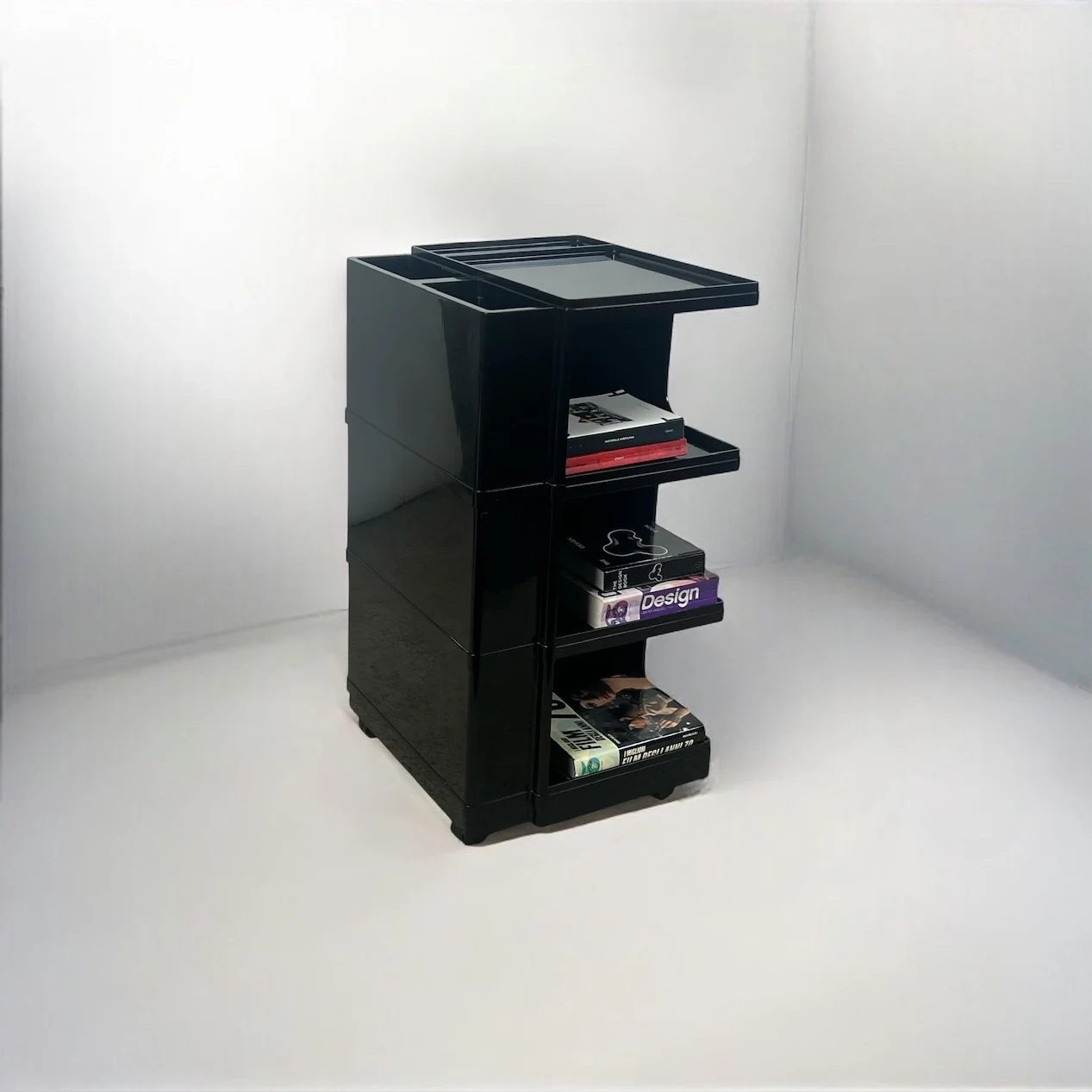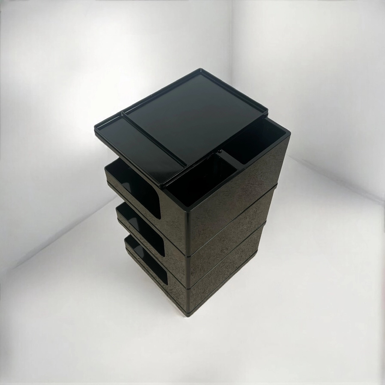Architect organizer trolley Stile by Giovanni Pelis for Neolt, a rare 1970s design icon with sleek compartments, glossy black finish, and great functionality.