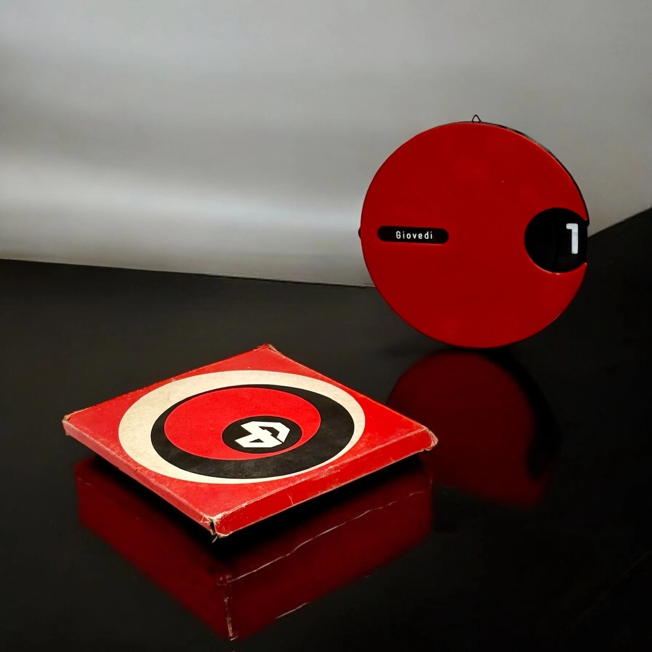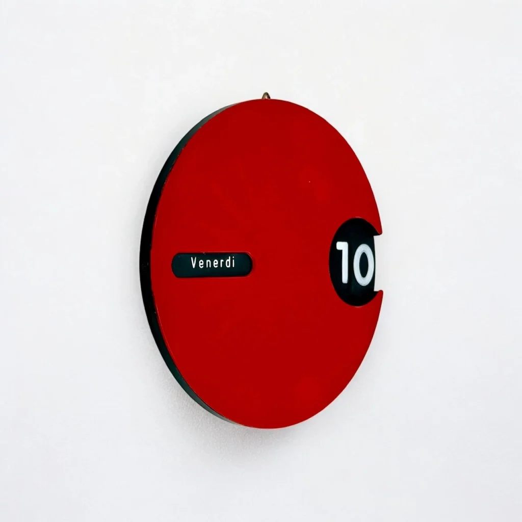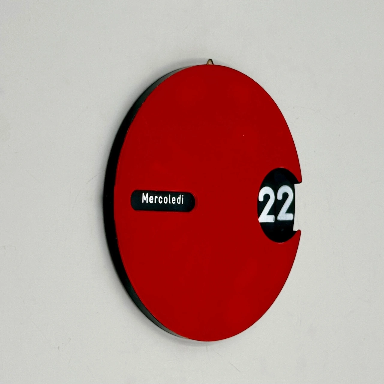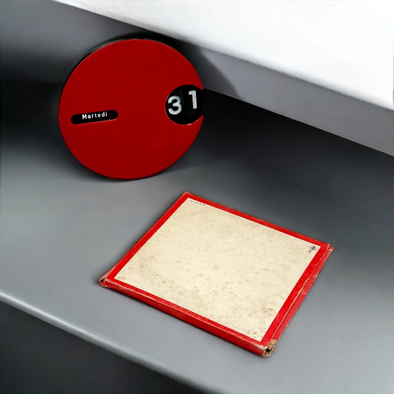Step into the 70s era with this rare Space Age Calendar, a remarkable example of retro-futuristic design. Created in Italy, this rare piece embodies the bold innovation and aesthetic exploration of the time. Featuring a distinctive circular red body paired with a rotating black dial, it offers a visually striking and functional design that captures the spirit of an era defined by progress and imagination.