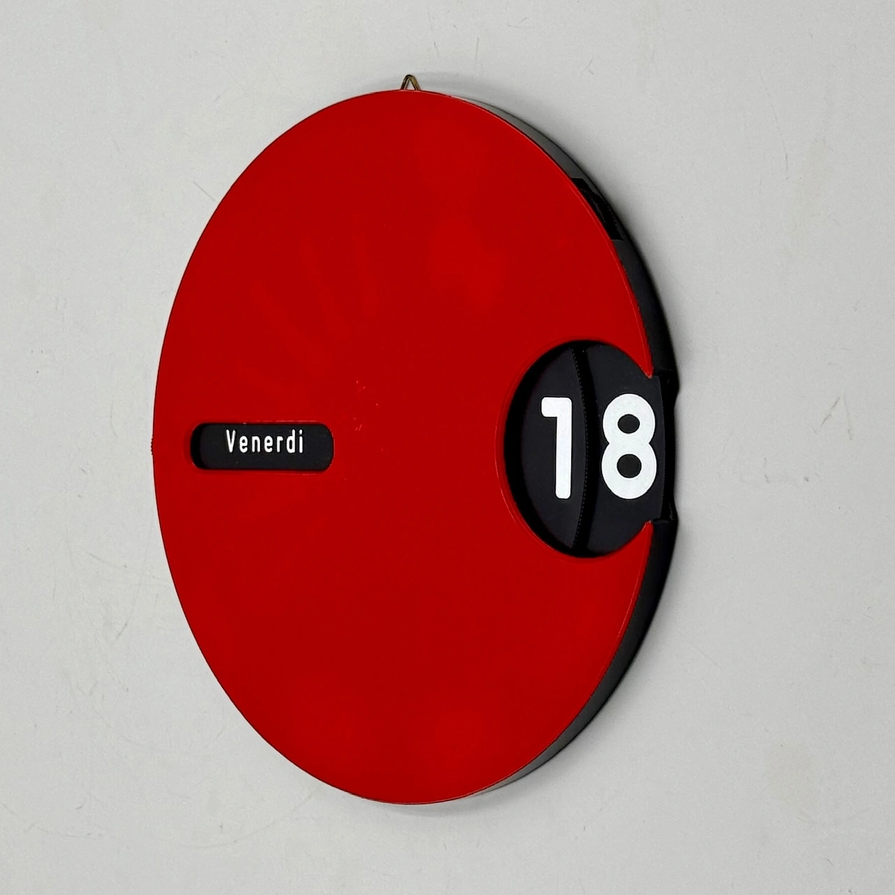 Stunning Space Age Calendar made in Italy in the 70s. Distinctive shape with rotating mechanism, glossy red body and black/white dial.