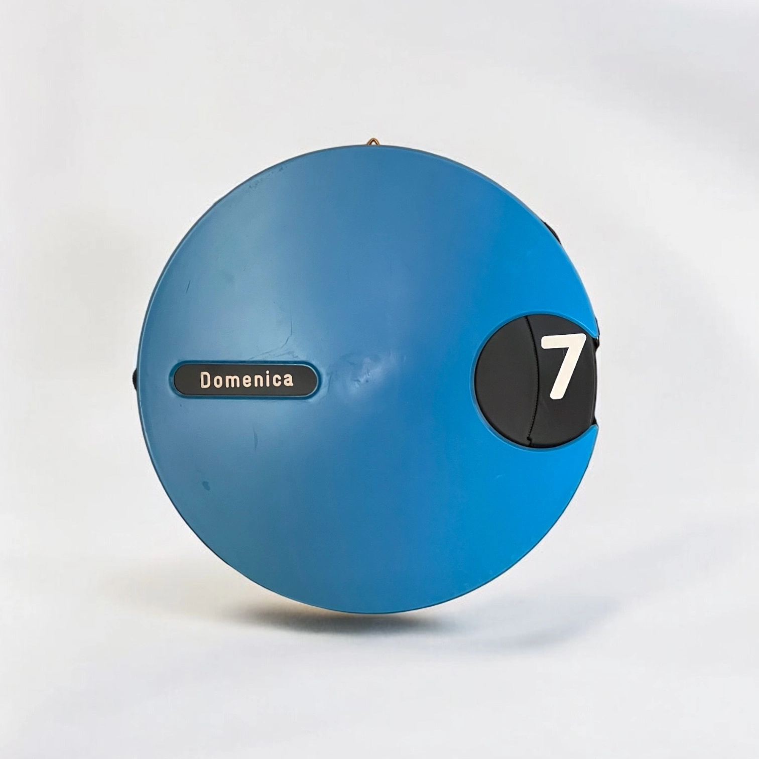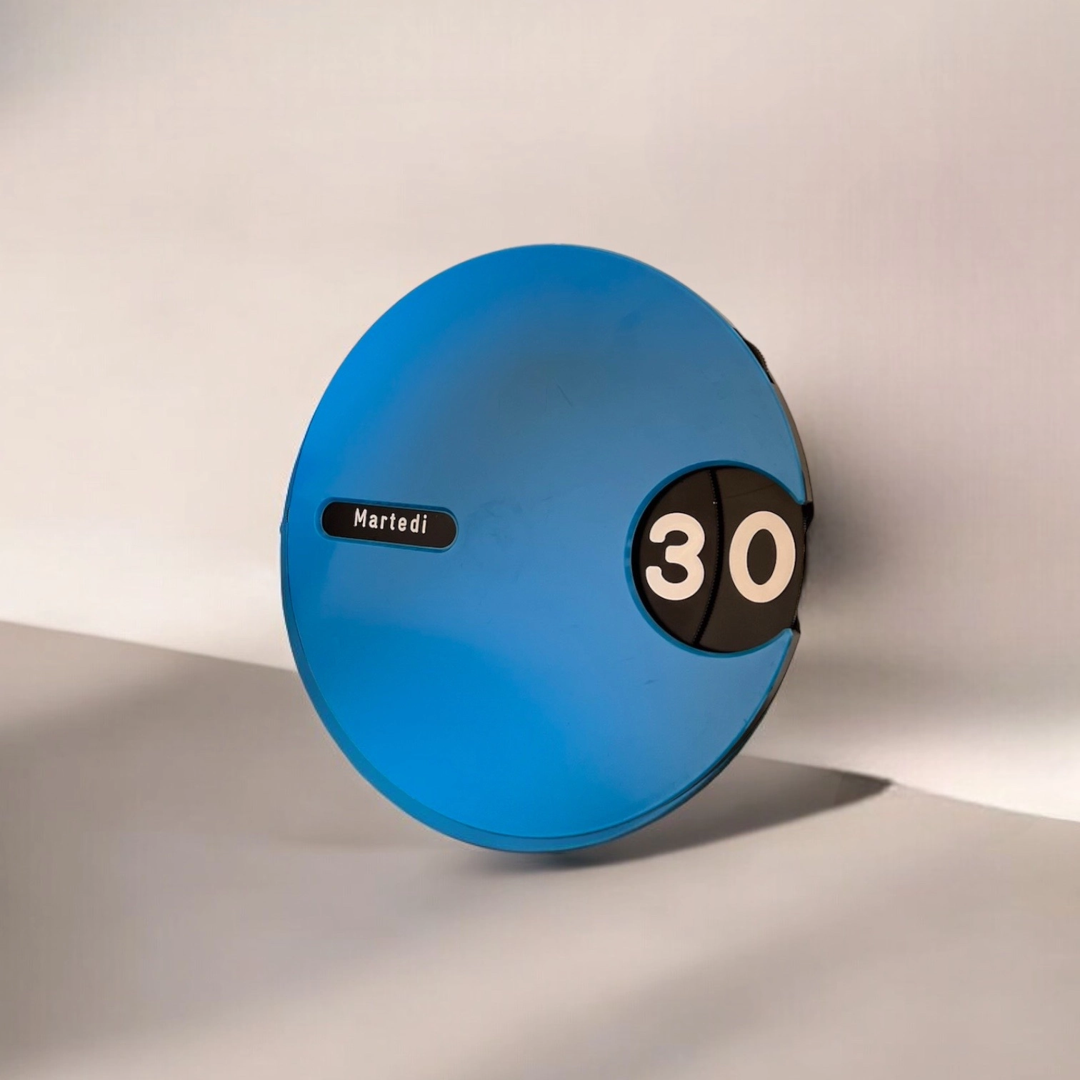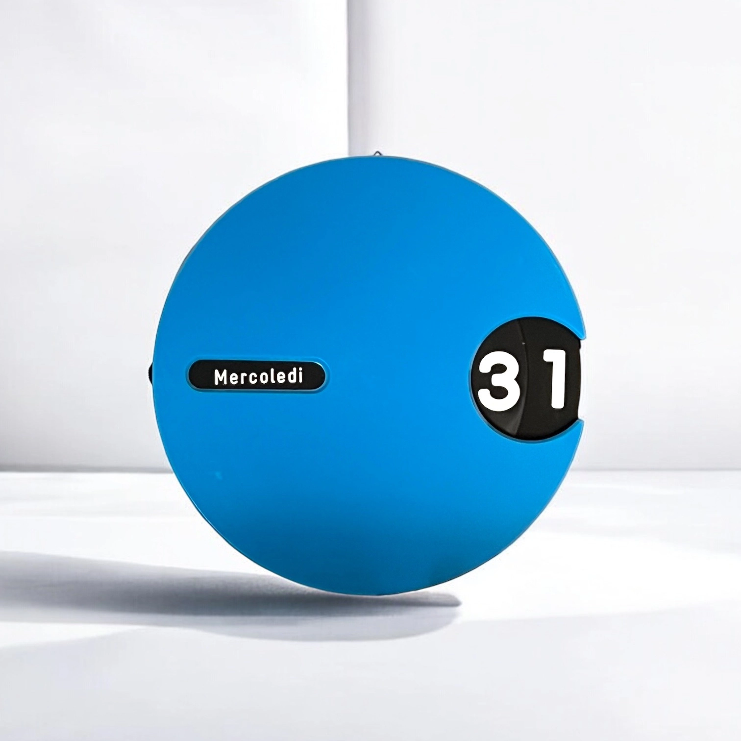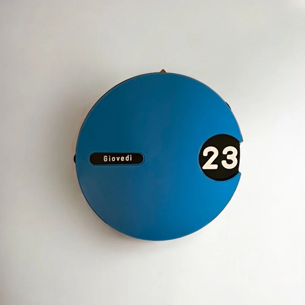 At the heart of this unique wall calendar is a rotating black dial, meticulously detailed with white fonts to display the days and months in Italian. This ingenious design allows for perpetual use, ensuring that this calendar is as practical as it is stylish. The contrast between the bold blue body and the clean black-and-white dial is striking, making it a perfect focal point in any room.