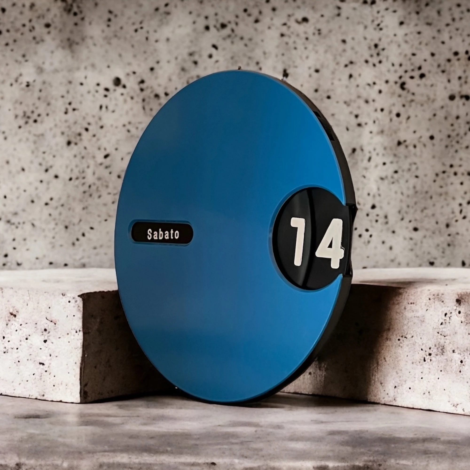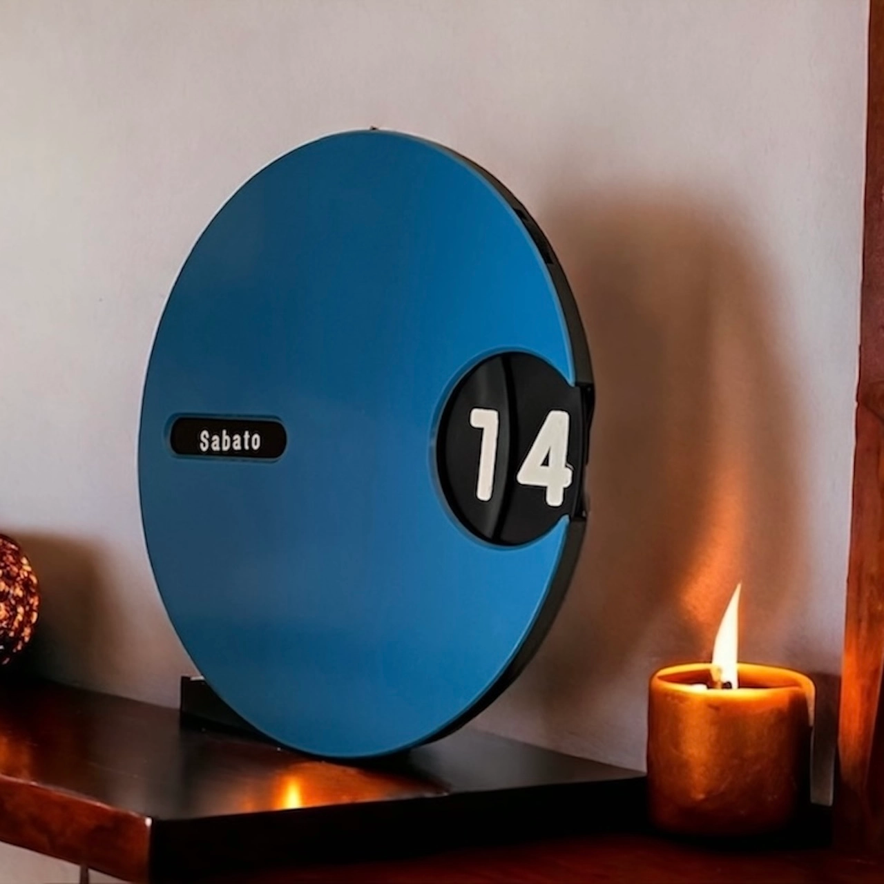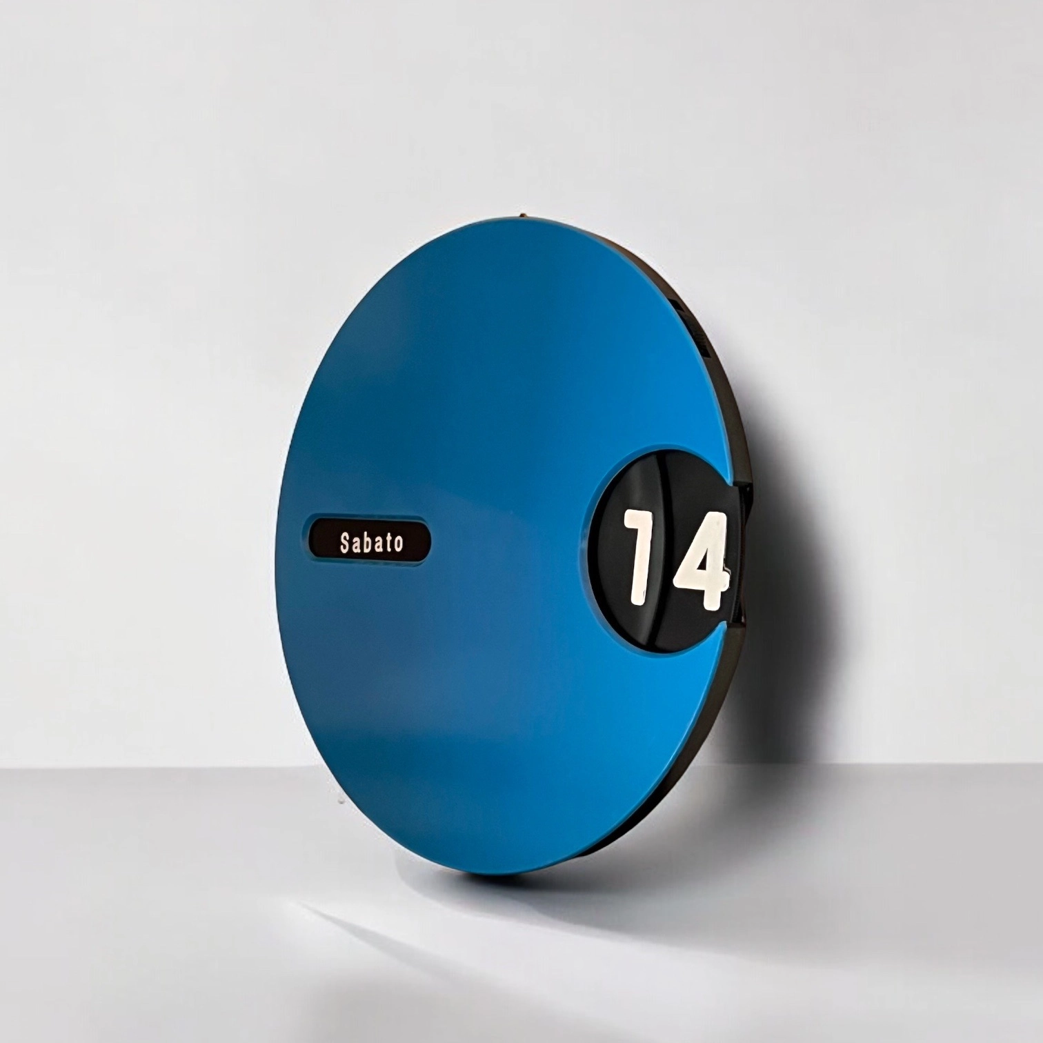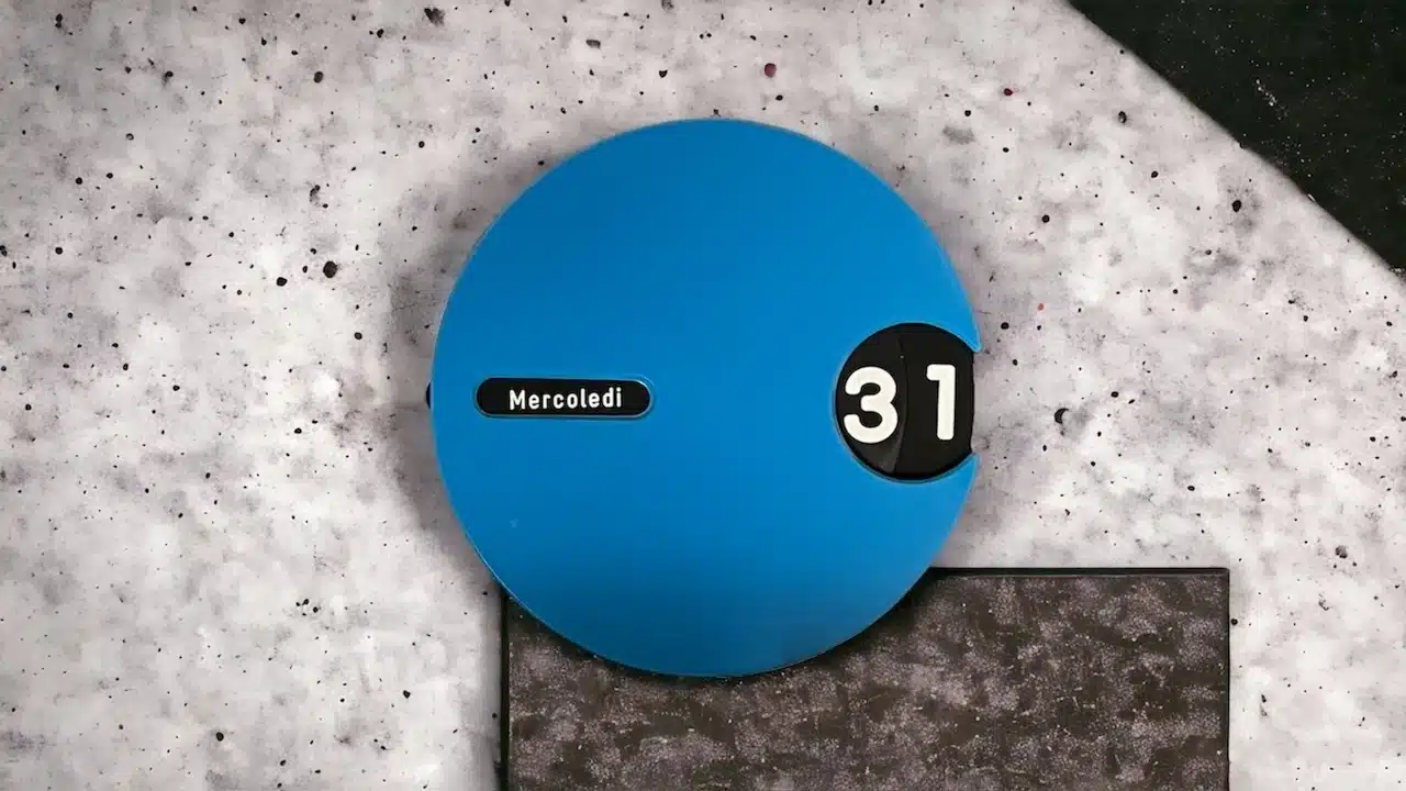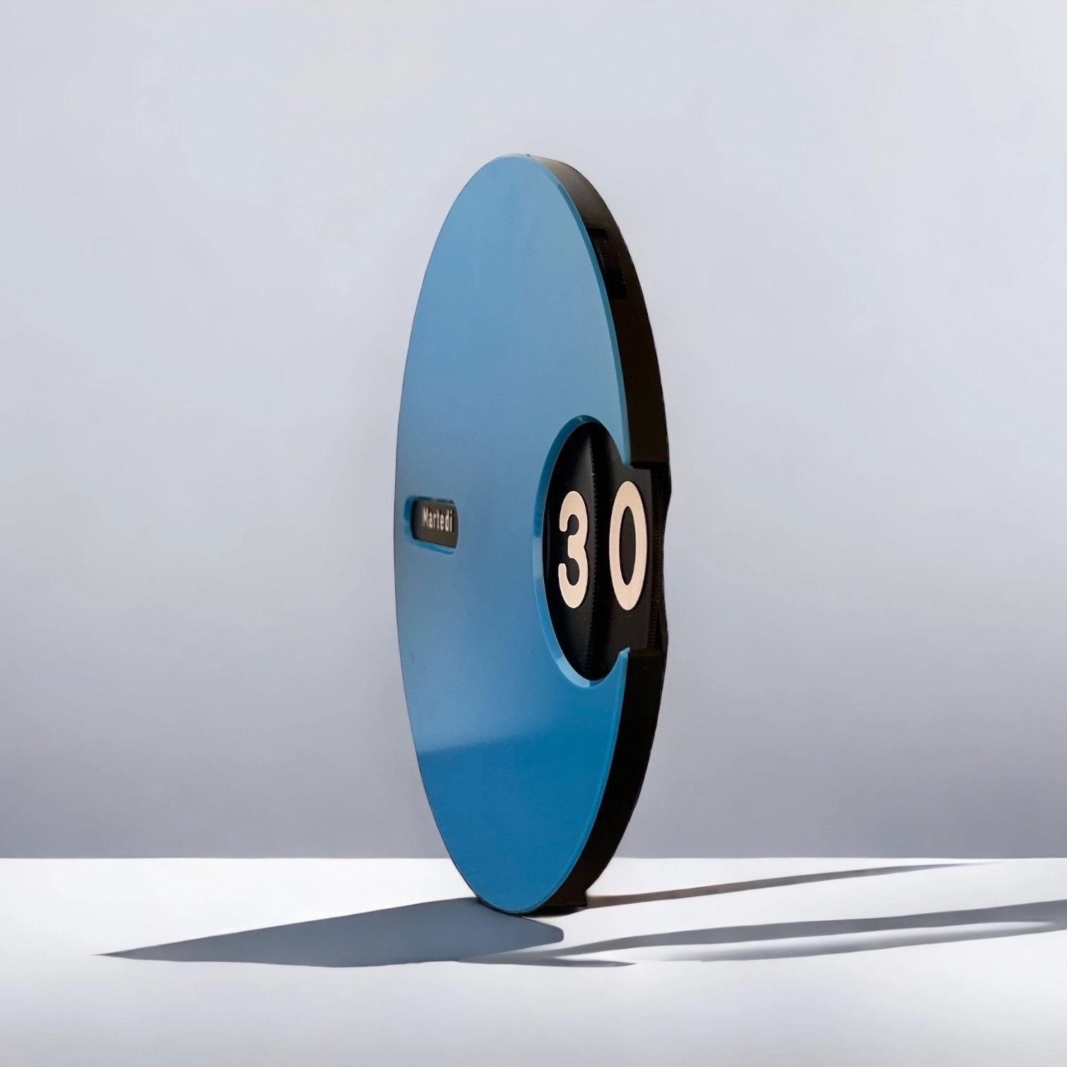 At the heart of this unique wall calendar is a rotating black dial, meticulously detailed with white fonts to display the days and months in Italian. This ingenious design allows for perpetual use, ensuring that this calendar is as practical as it is stylish. The contrast between the bold blue body and the clean black-and-white dial is striking, making it a perfect focal point in any room.