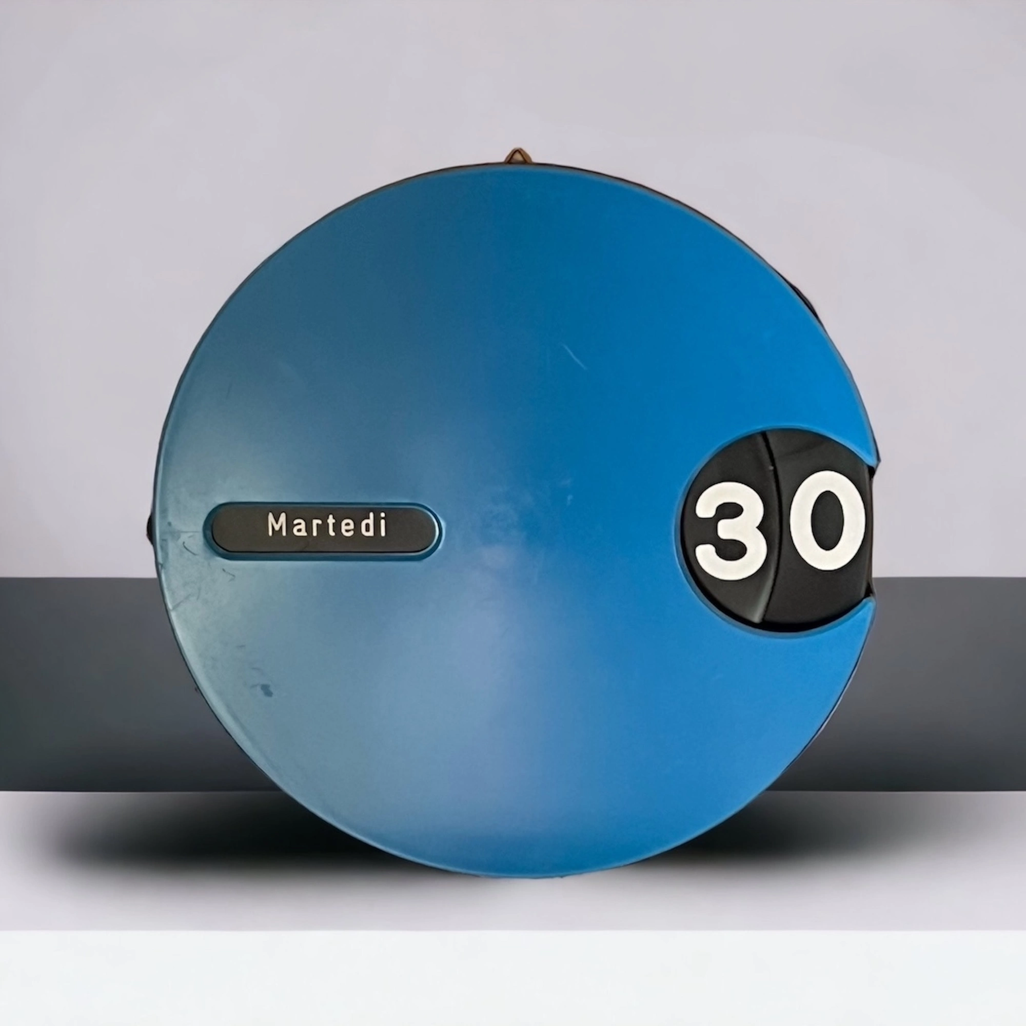 Capture the essence of 70s design with this rare Space Age calendar made in Italy. Crafted with a sleek round shape and finished in a glossy blue, this calendar is more than just a functional timekeeper—its a statement piece that embodies the futuristic aesthetics of the era.