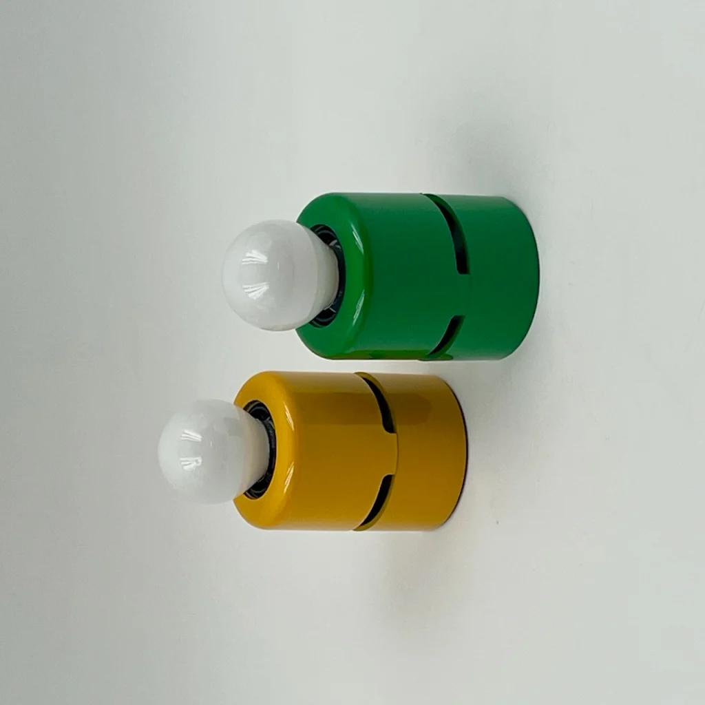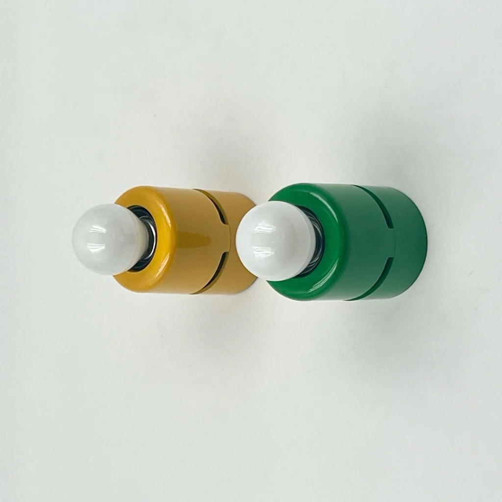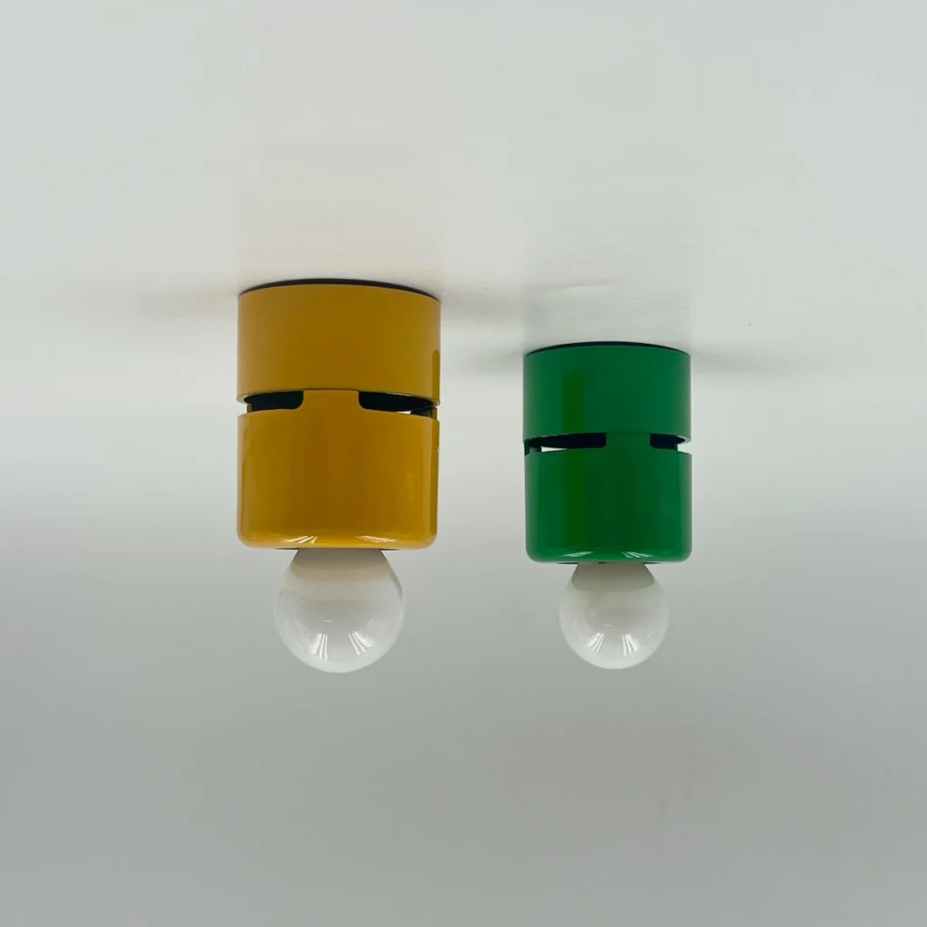 The minimalistic design of these 80s lamps is what makes them truly special. Each lamp features a sleek unibody melamine structure, giving it a streamlined and modern look. What really sets these lamps apart are their striking colors—bold green and vibrant yellow—making them a standout addition to any interior.