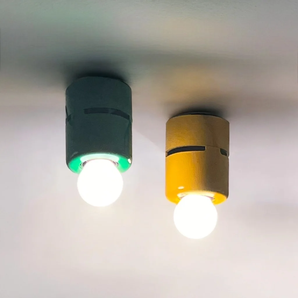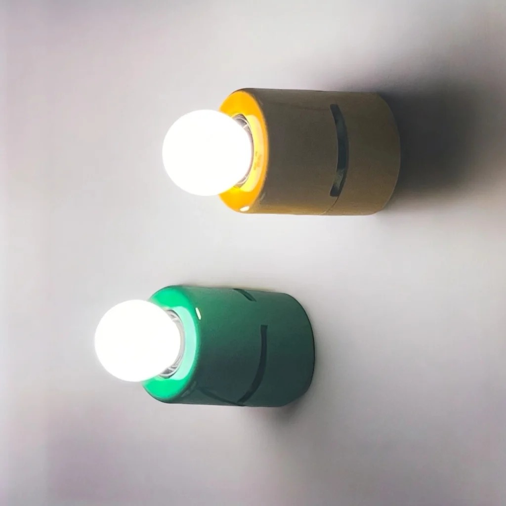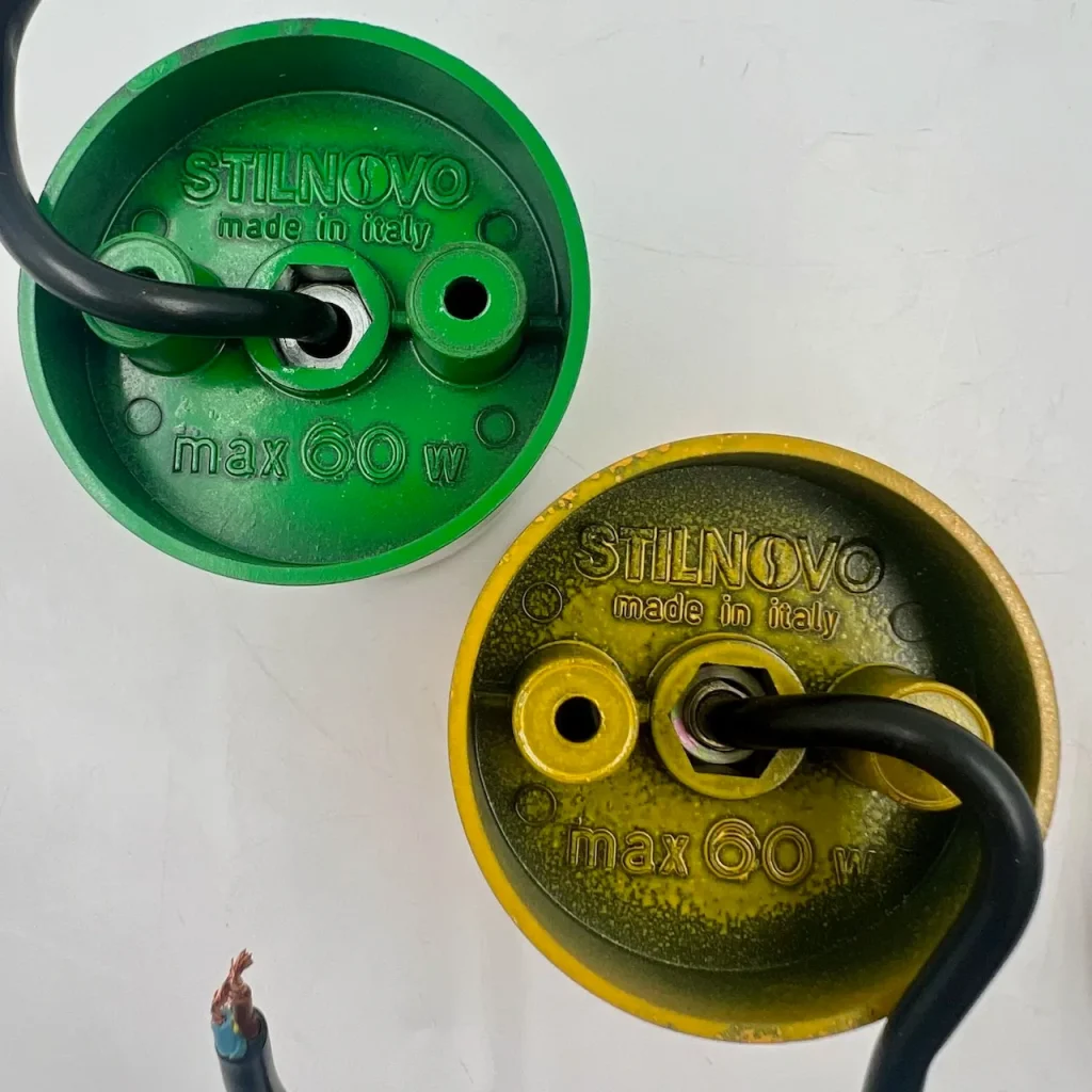 The minimalistic design of these 80s lamps is what makes them truly special. Each lamp features a sleek unibody melamine structure, giving it a streamlined and modern look. What really sets these lamps apart are their striking colors—bold green and vibrant yellow—making them a standout addition to any interior.