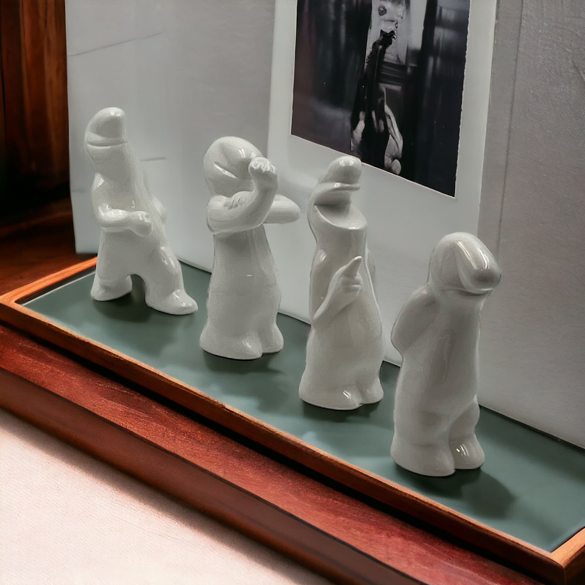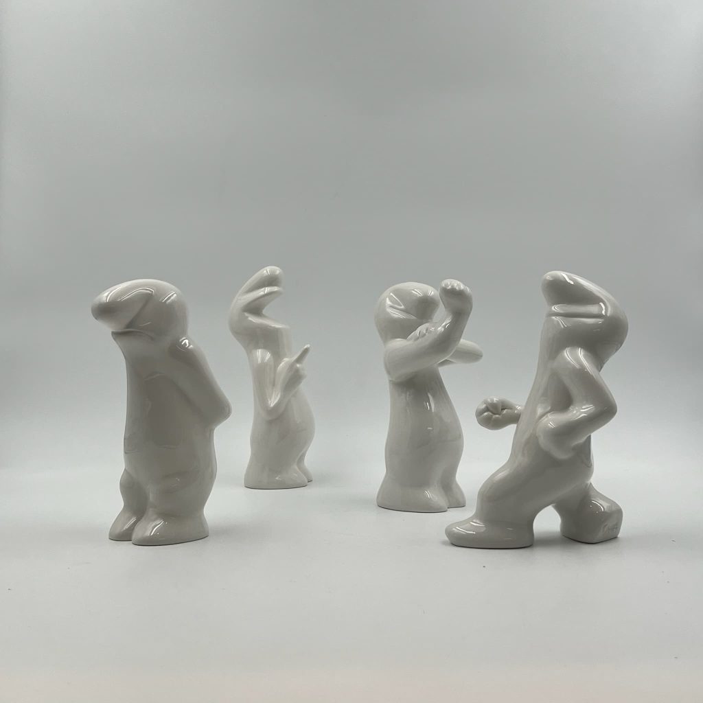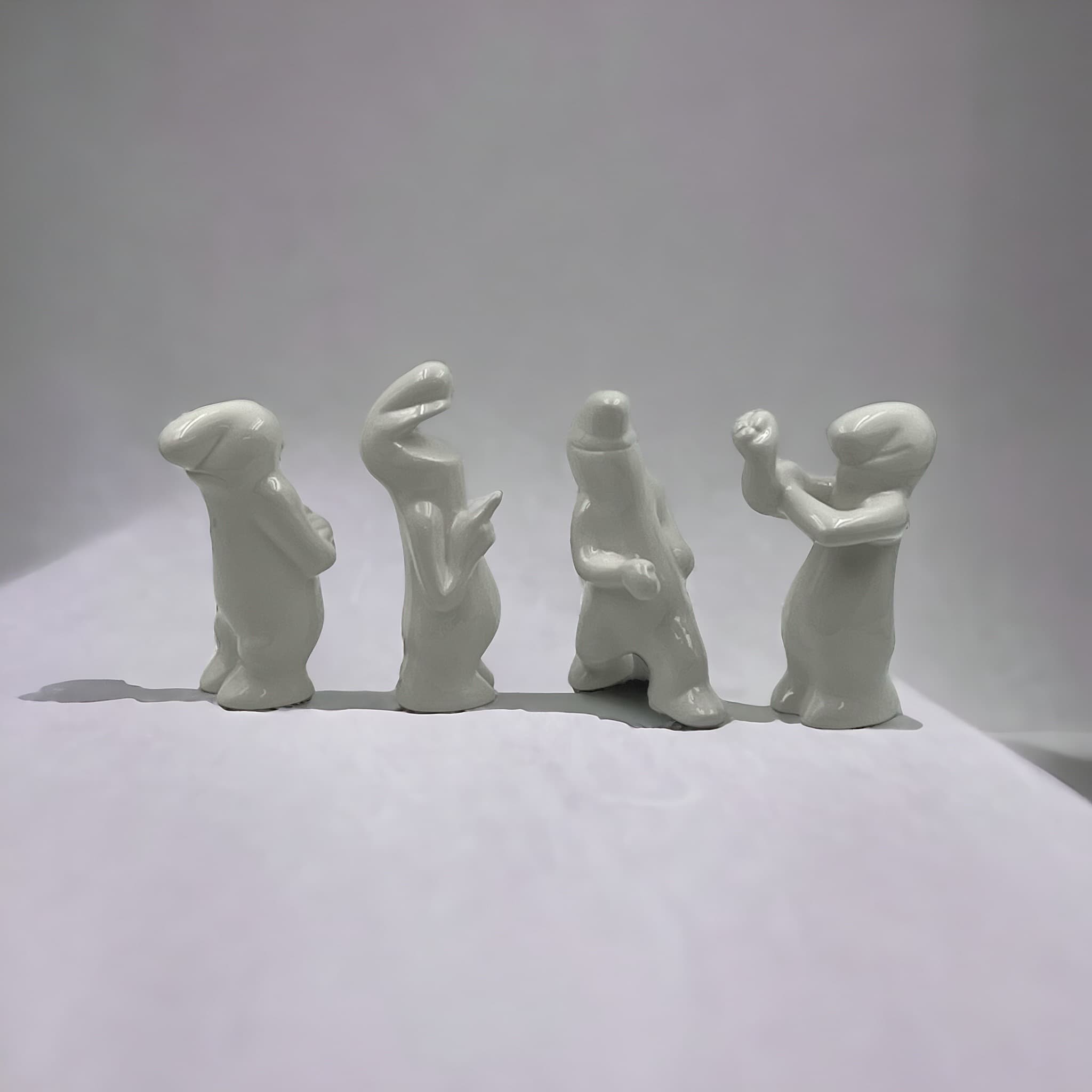 Unfindable set of four collectible ceramic sculptures from the iconic La Linea series, designed and crafted by Osvaldo Cavandoli from the late 1950s to the 1970s.