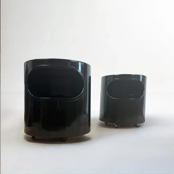 Each table has a rounded body in shiny black plastic with an open front compartment. It offers space for books, magazines, or small essentials. Thanks to the wheels, the tables move easily and can serve as side tables, bedside units, or mobile storage.