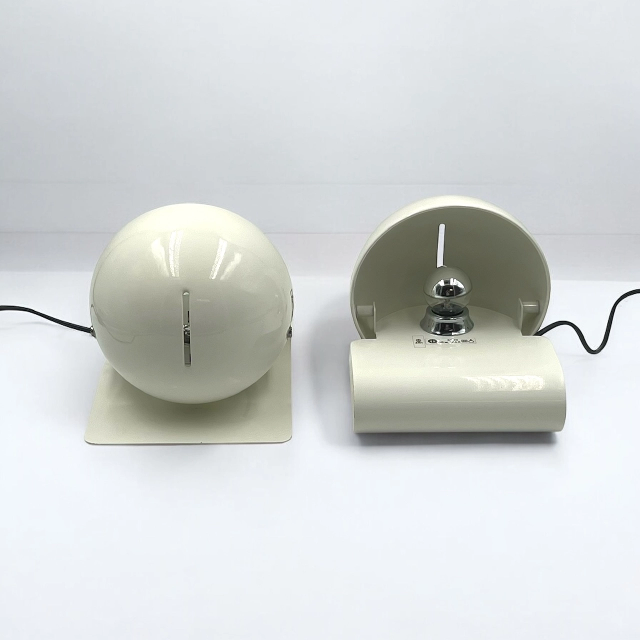 • condition. good vintage conditions, complete, intact, and clean, with shiny chrome rings .very slight dents and paint chipping, more or less pronounced, scattered on both lamps. original labels.
