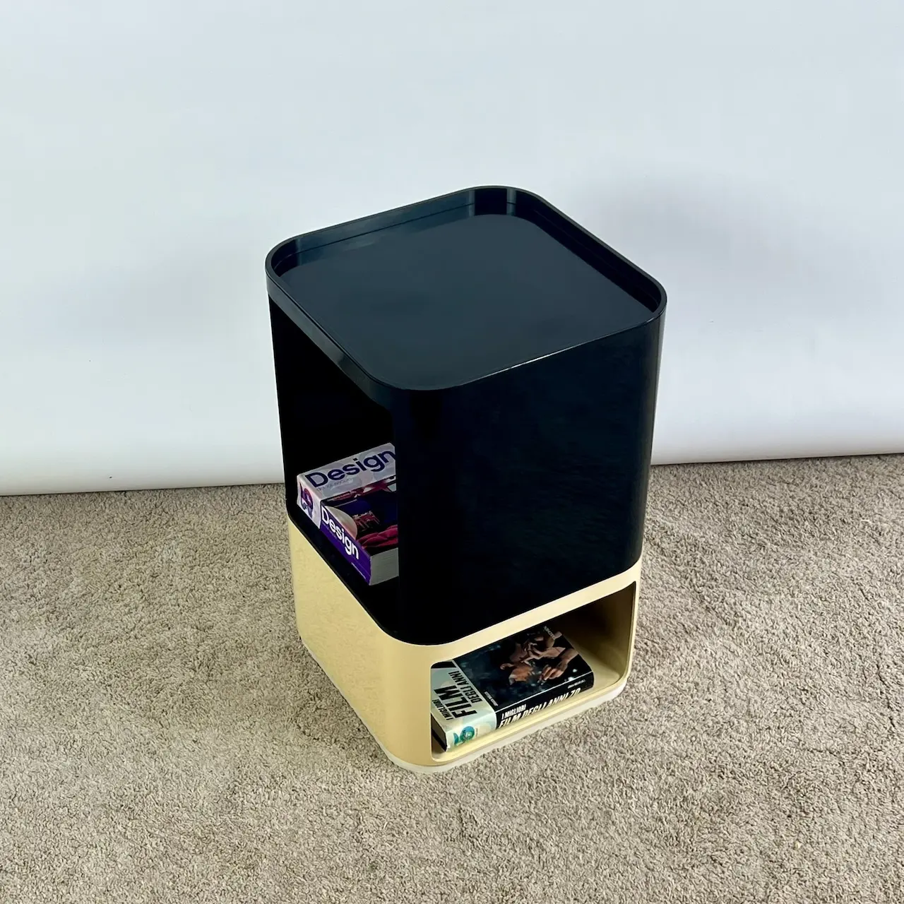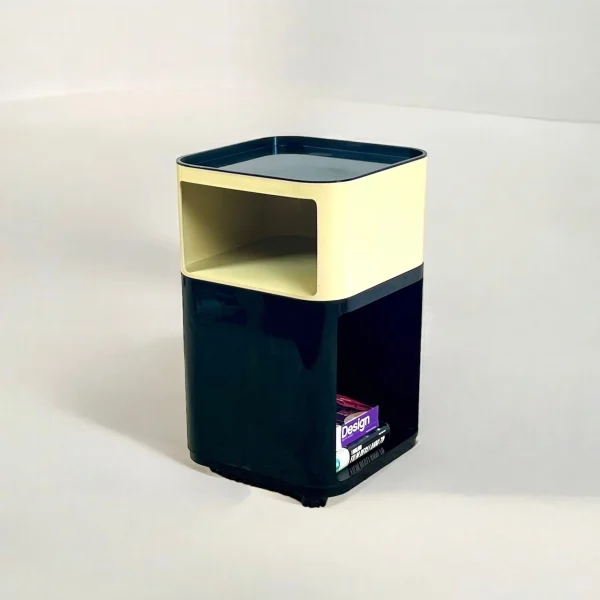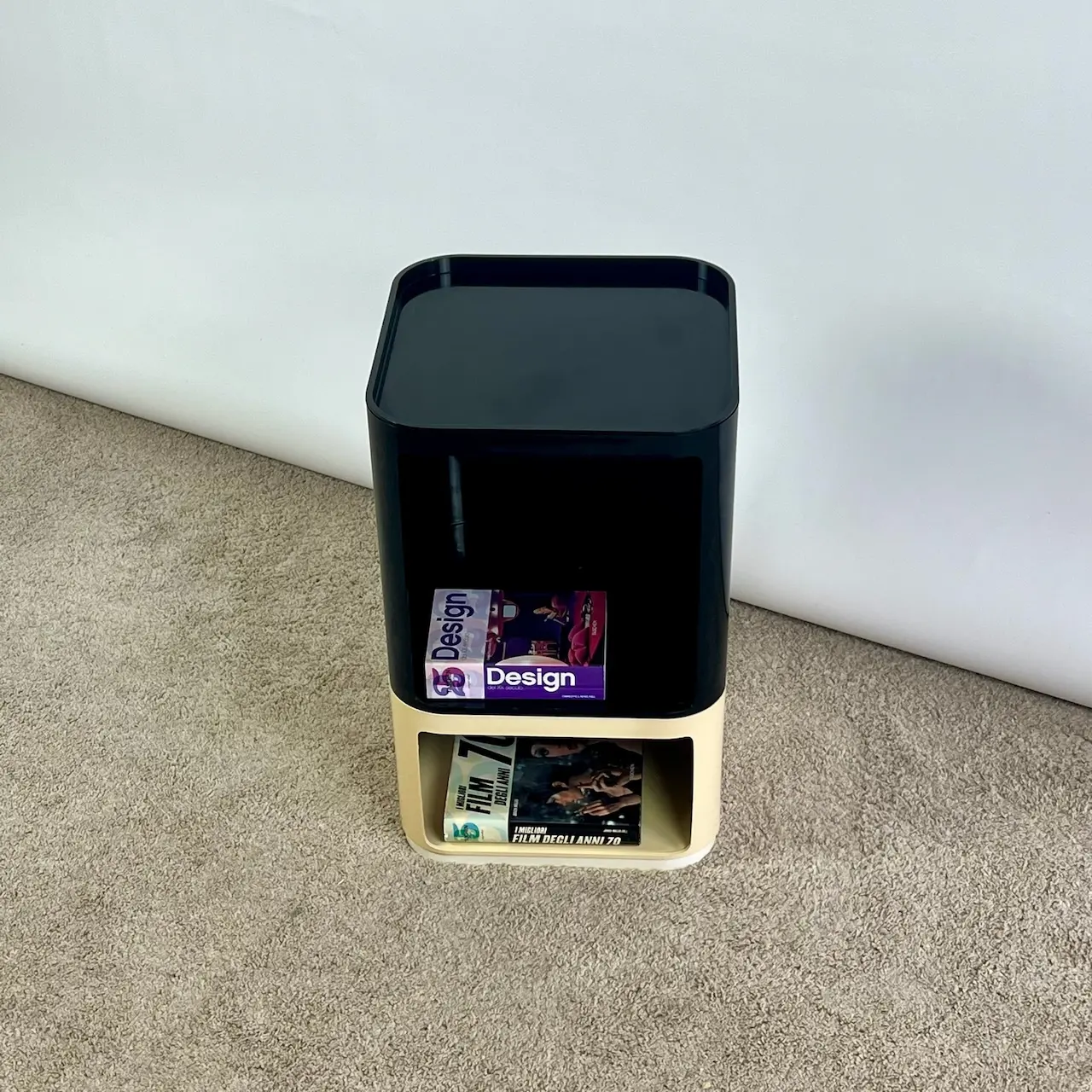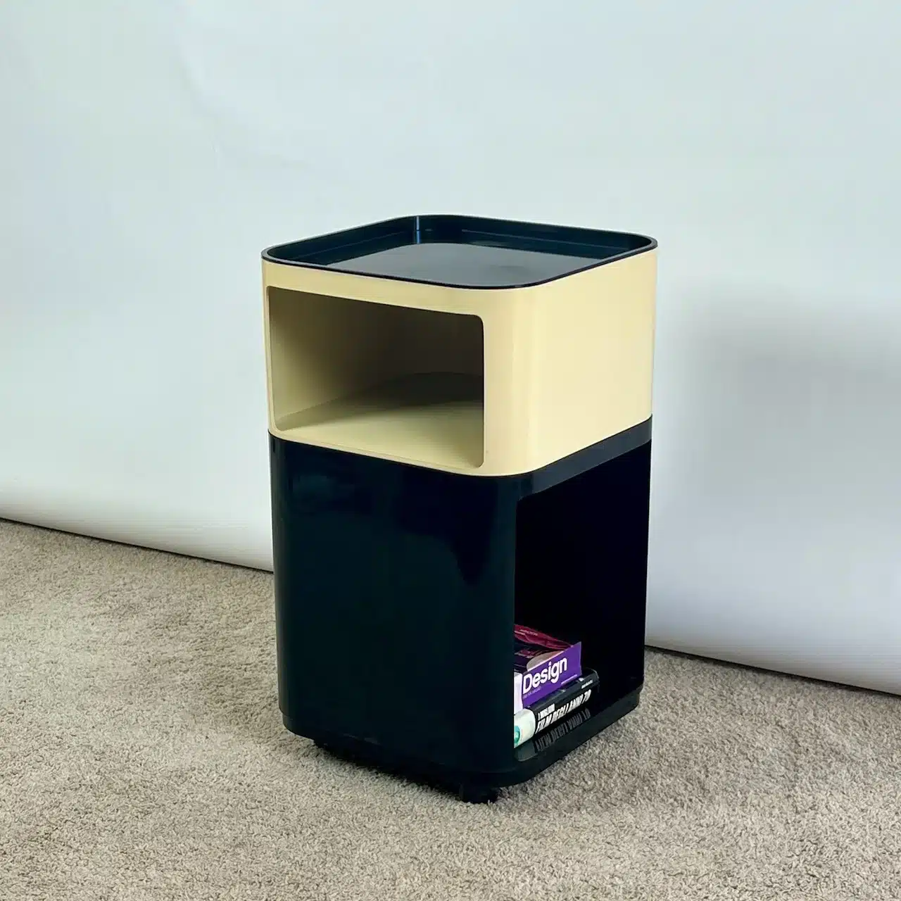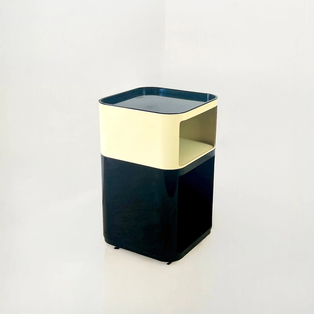 Space Age furniture design Kartell Componibili units, conceived by the legendary Anna Castelli Ferrieri in the 1960s. These particular models, the 4975/76 in sleek black and the 4970 in classic off-white, feature a unique squared base design that is no longer in production, making them increasingly rare and highly sought after by collectors and design enthusiasts.