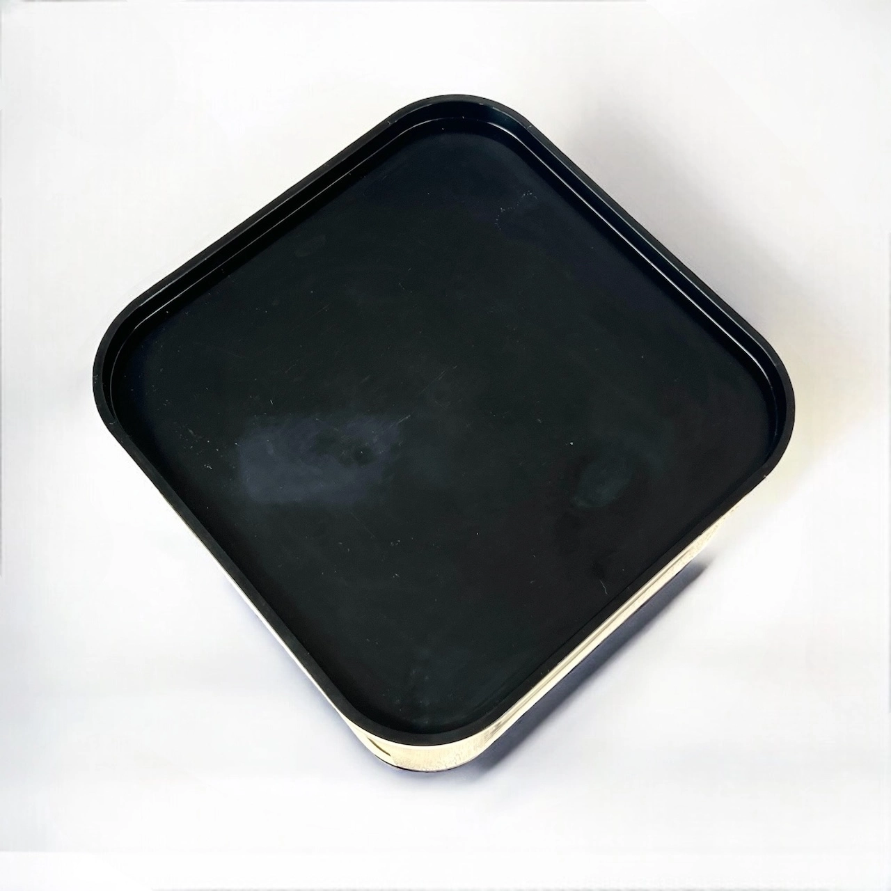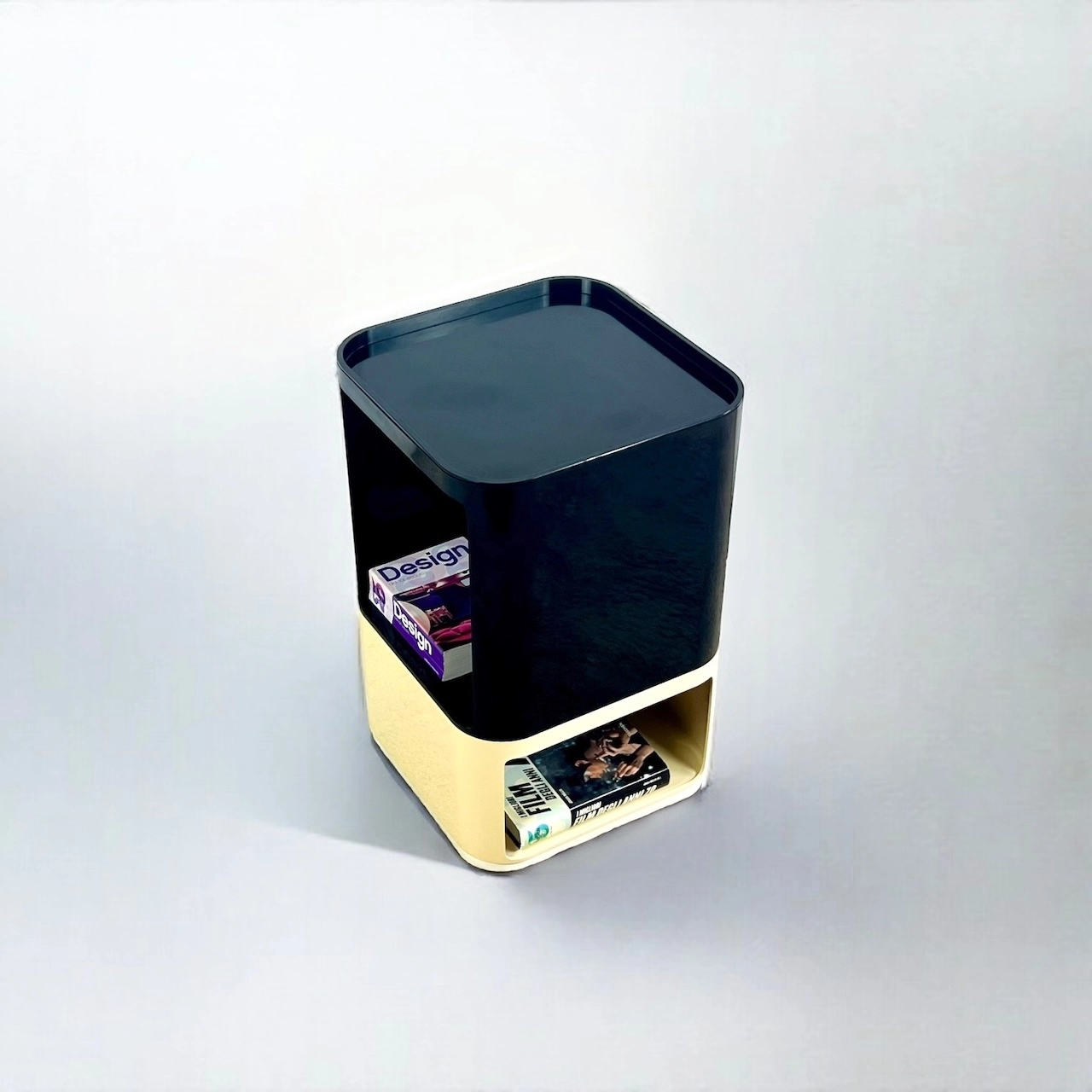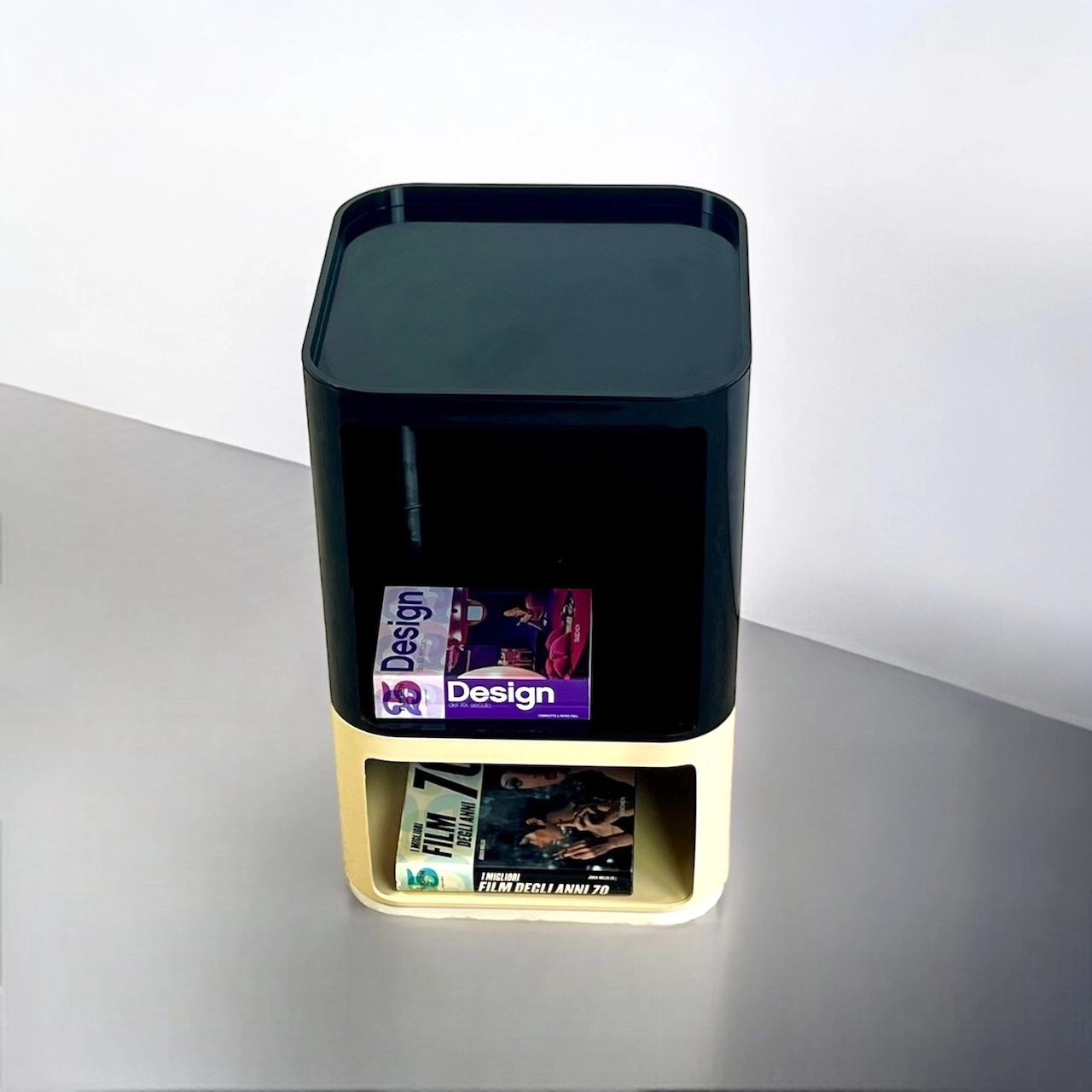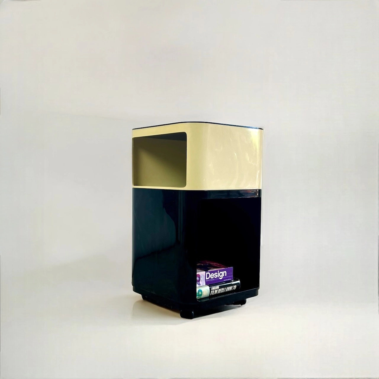 Space Age furniture design Kartell Componibili units, conceived by the legendary Anna Castelli Ferrieri in the 1960s. These particular models, the 4975/76 in sleek black and the 4970 in classic off-white, feature a unique squared base design that is no longer in production, making them increasingly rare and highly sought after by collectors and design enthusiasts.