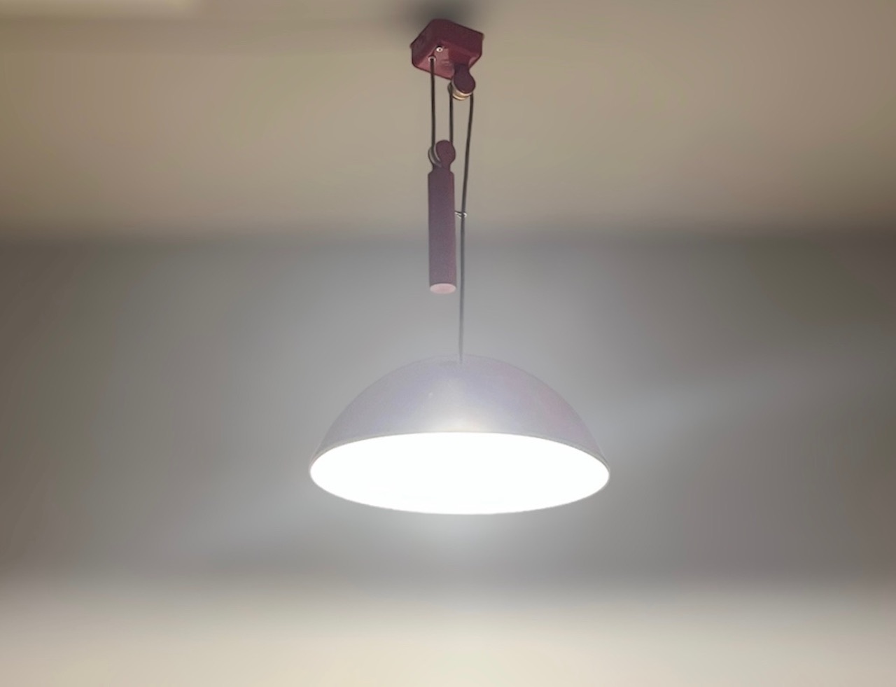 Unfindable hanging lamp with sliding rail designed by Achille and Pier Giacomo Castiglioni for Flos in the 60s.