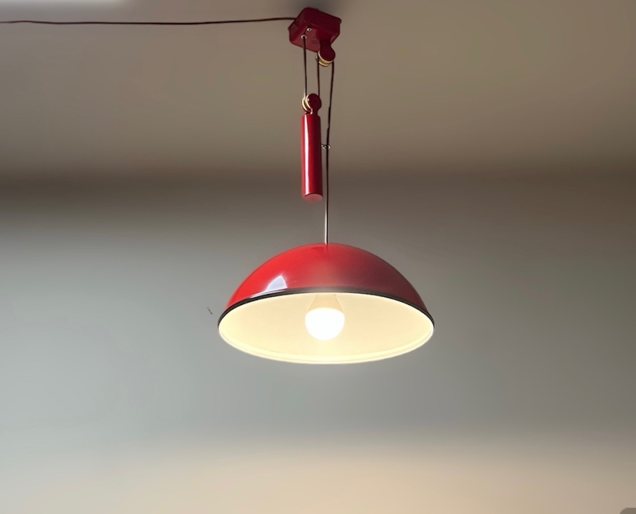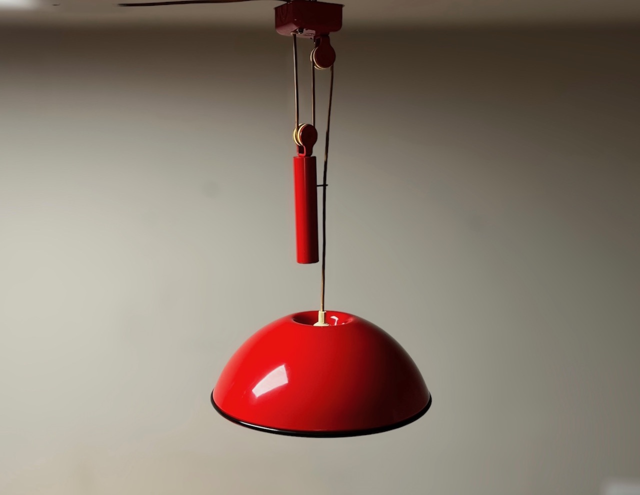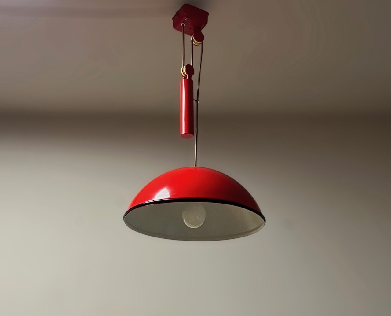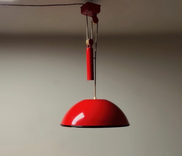 Unfindable hanging lamp with sliding rail designed by Achille and Pier Giacomo Castiglioni for Flos in the 60s. Beautiful flame red color, original wiring.
