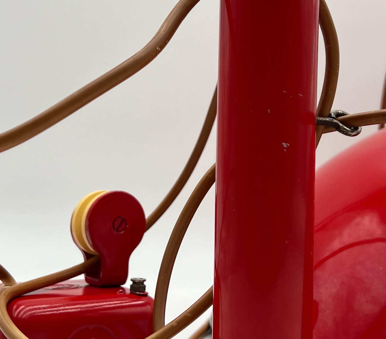 This large lamp has a shining flame red finish. The big lampshade is made of light metal. The lamp support and the rare and heavy sliding rail are perfectly preserved, with original wiring and components and brand label.