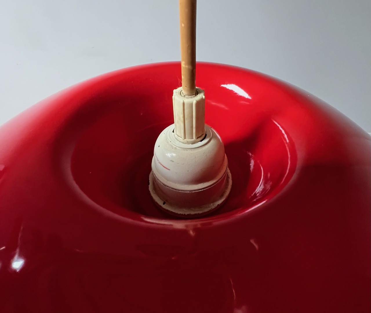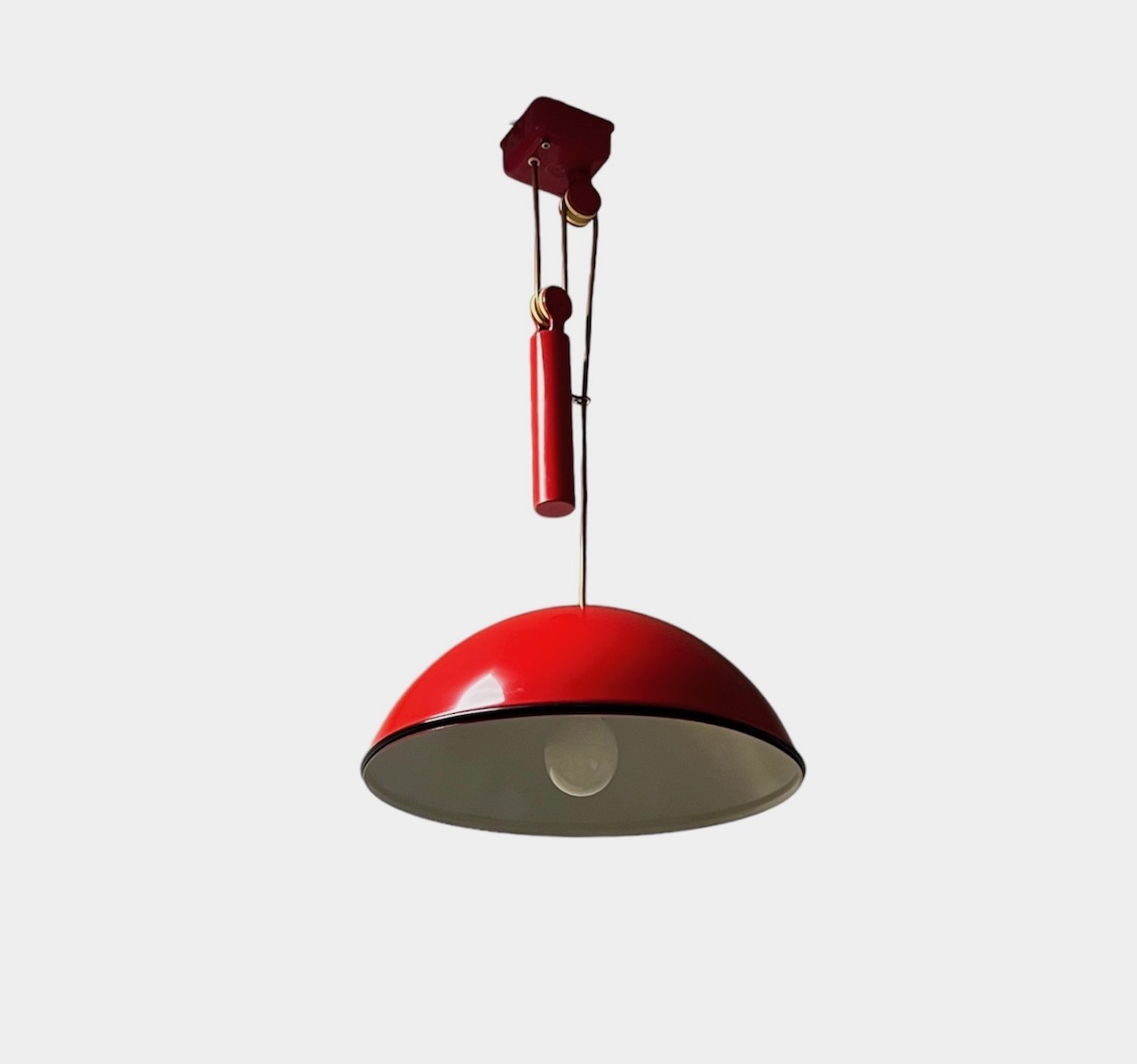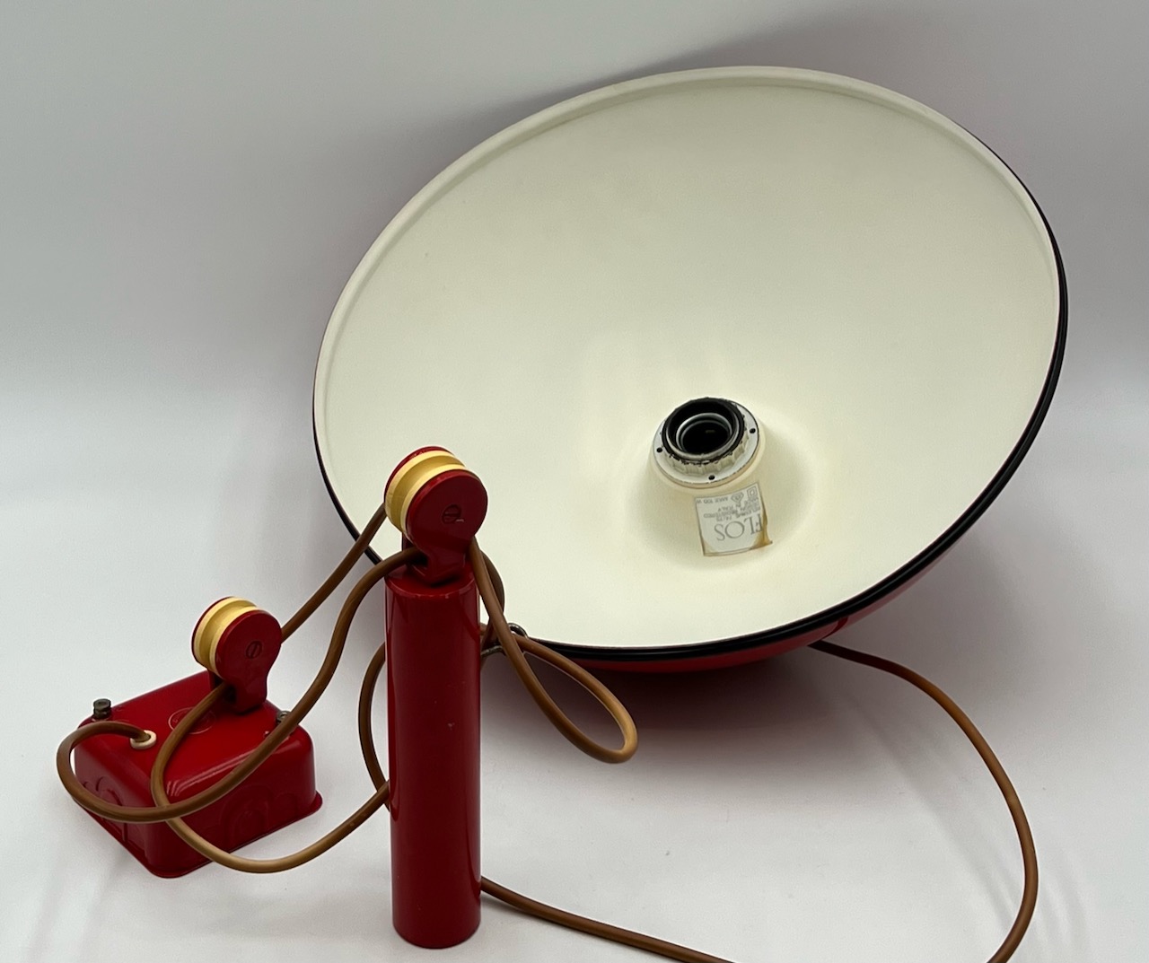 item. hanging lampmodel. relemme 74/75designer. achille castiglioni, pier giacomo castiglionimaker. flosperiod. 60scountry. Italymaterial. metalcolor. flame reddimensions (cm). 38 x 38 x 16. cable length 190 cm.condition. excellent aesthetic conditions, healthy and shining. minor traces of wear like scrapings in the lamp support and yellowing of the original cable.