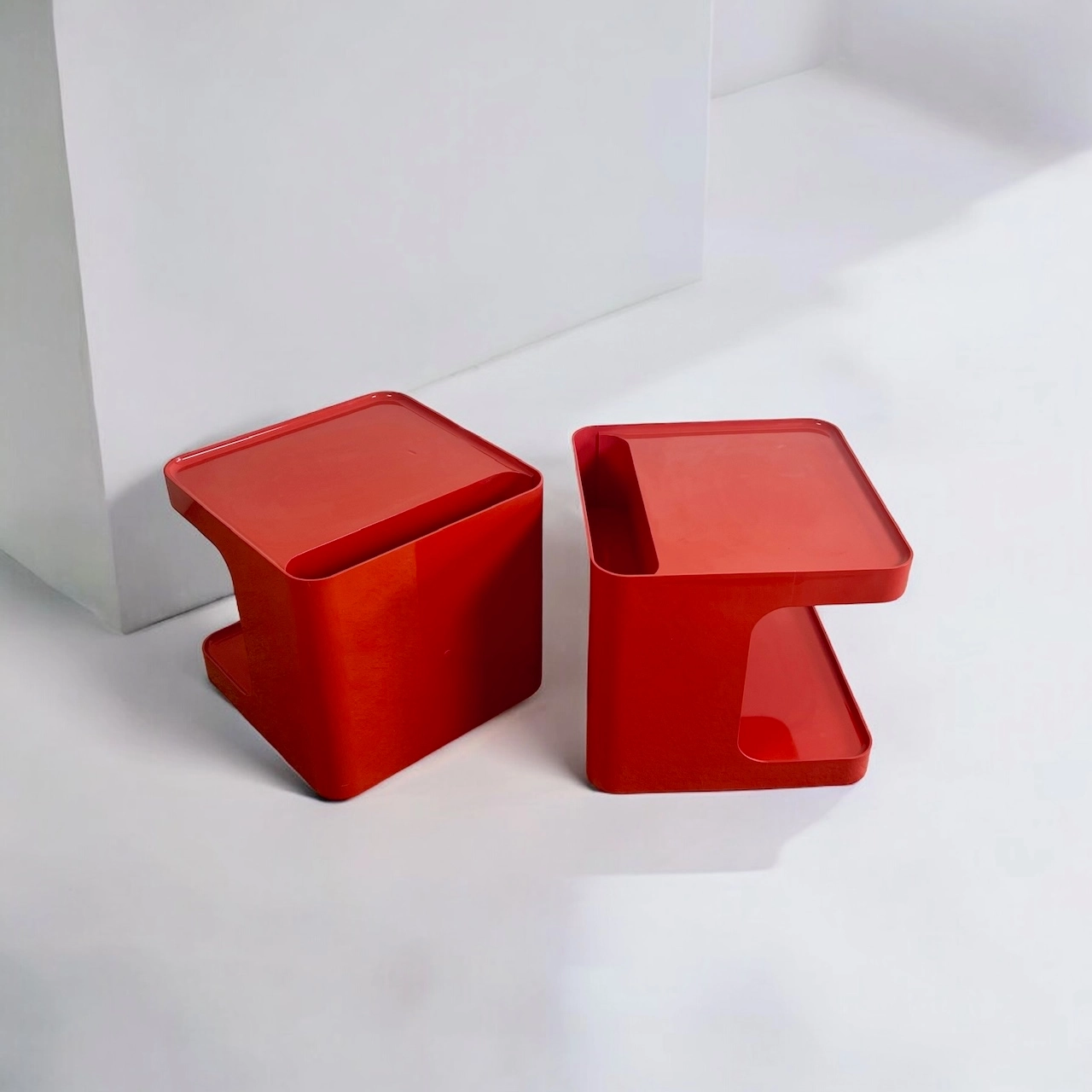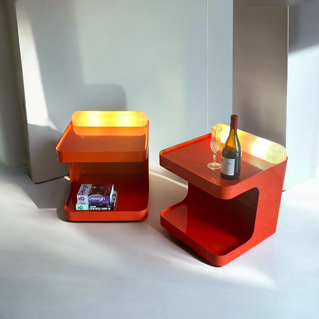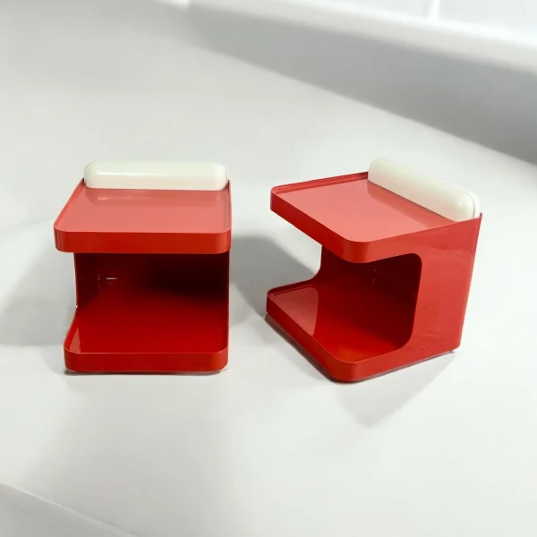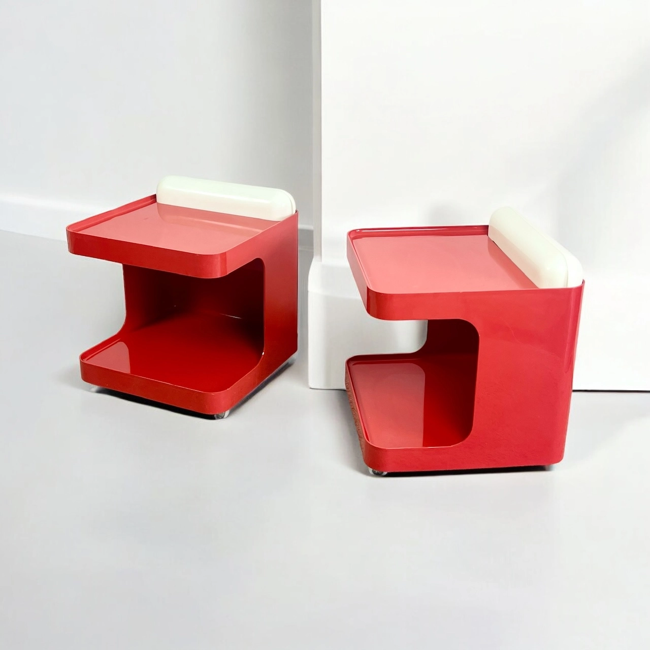 item. Set of Two Bar Carts / Serving Trolleys / Bedside Tablesdesigner. Marcello Siardmaker. Collezioni Longato Padovamodel. Game (model 1030)period. 1970scountry. Italymaterial. novodur resin by Bayercolor. reddimensions (cm). 50 x 50 x 57 Hcondition. Excellent vintage condition with minor signs of wear. Lamps fully functional with slight yellowing. Wheels in excellent conditions.