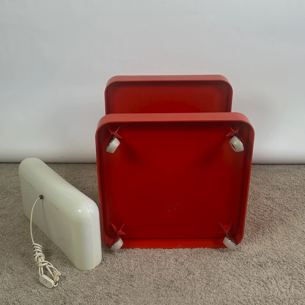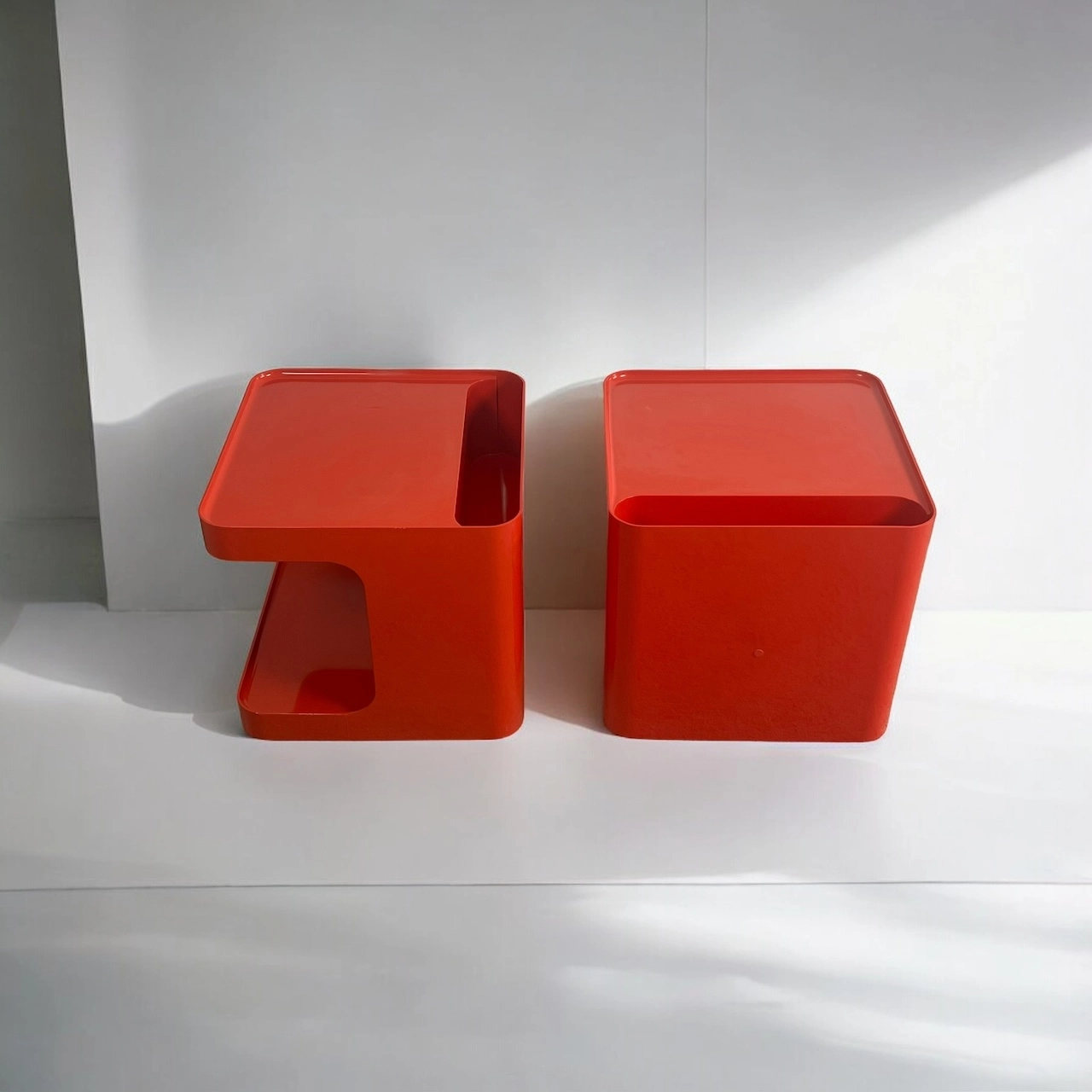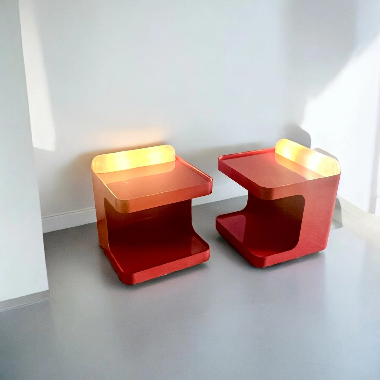 item. Set of Two Bar Carts / Serving Trolleys / Bedside Tablesdesigner. Marcello Siardmaker. Collezioni Longato Padovamodel. Game (model 1030)period. 1970scountry. Italymaterial. novodur resin by Bayercolor. reddimensions (cm). 50 x 50 x 57 Hcondition. Excellent vintage condition with minor signs of wear. Lamps fully functional with slight yellowing. Wheels in excellent conditions.