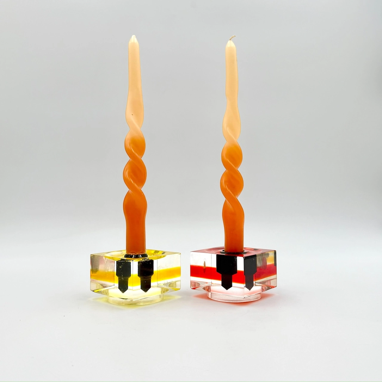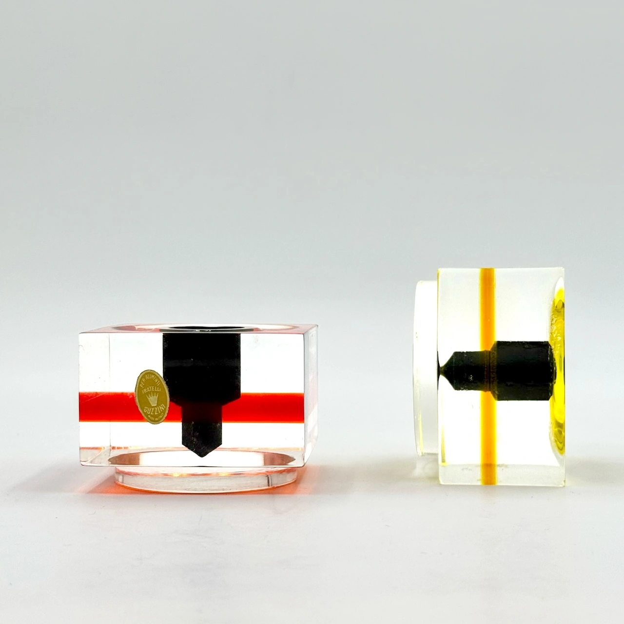 Set of two mid century modern candle holders by Luigi Massoni for Guzzini, 1973. Iconic 70s design in PMMA with vibrant yellow and red hues. Rare collectible pieces with original label.