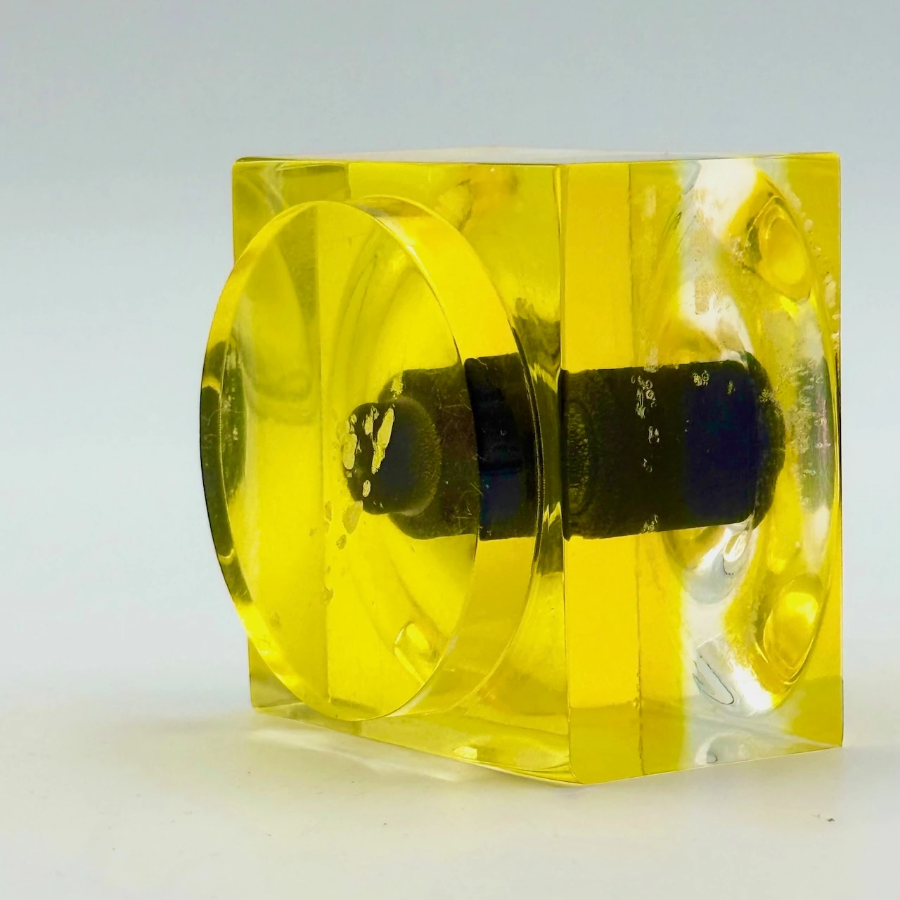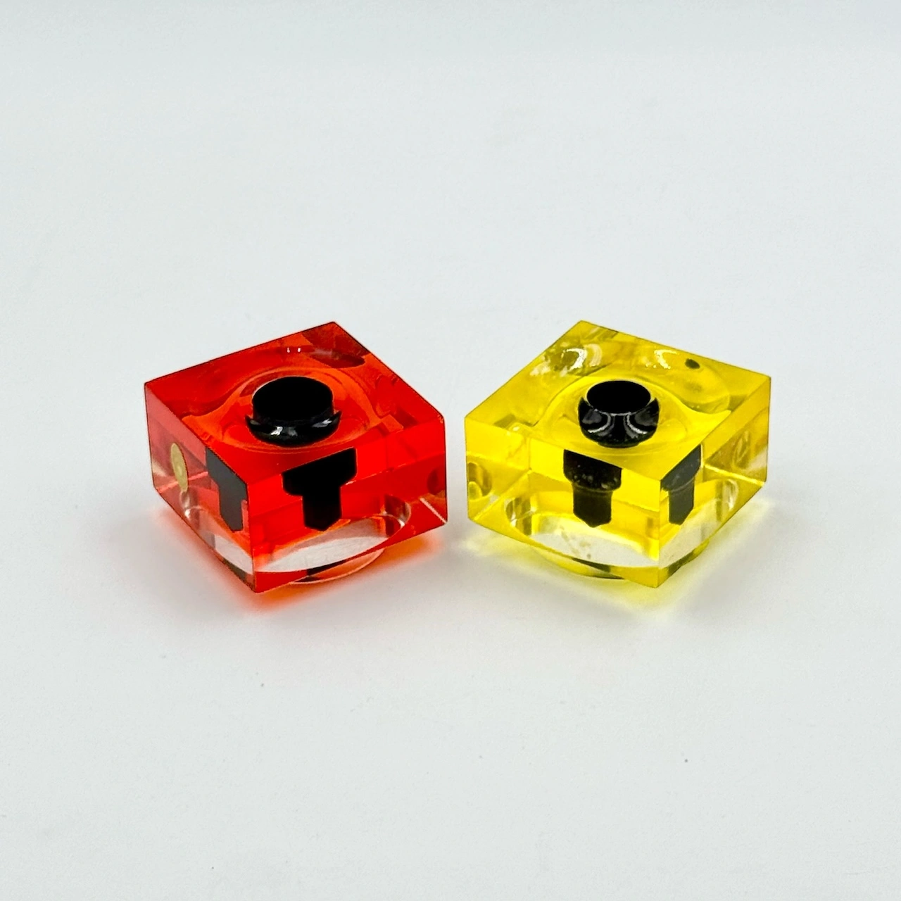 Crafted in transparent PMMA, each piece features a striking colored insert—one in vivid red, the other in warm yellow—encapsulating the innovative spirit of Massoni’s work. Compact in size (7x7x5 cm), their geometric form and vibrant hues add character and uniqueness.