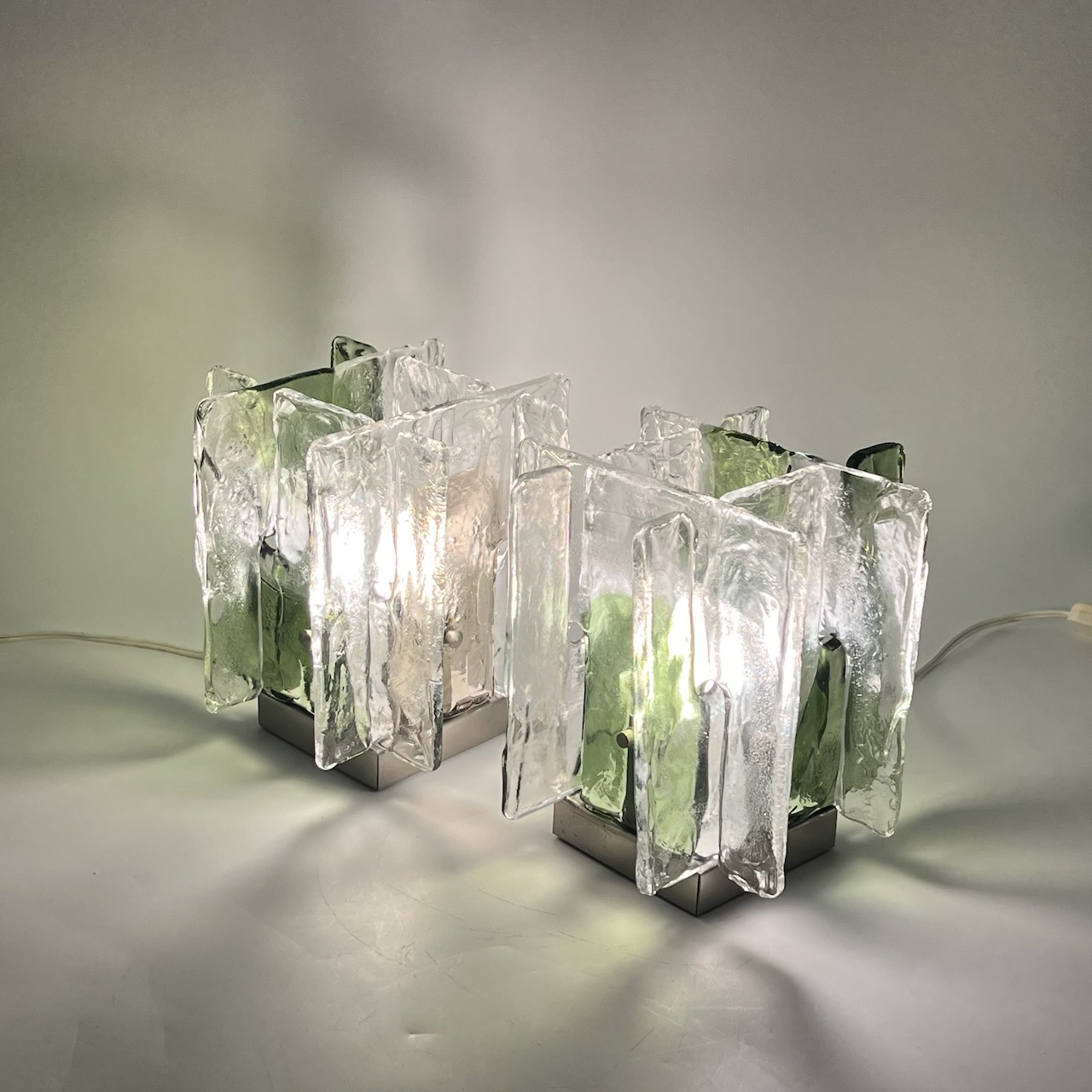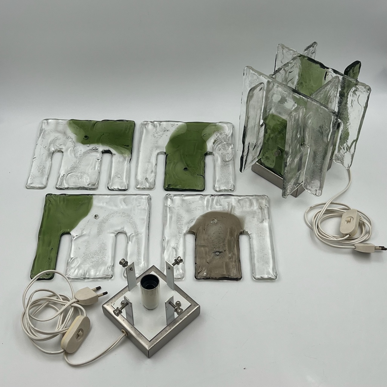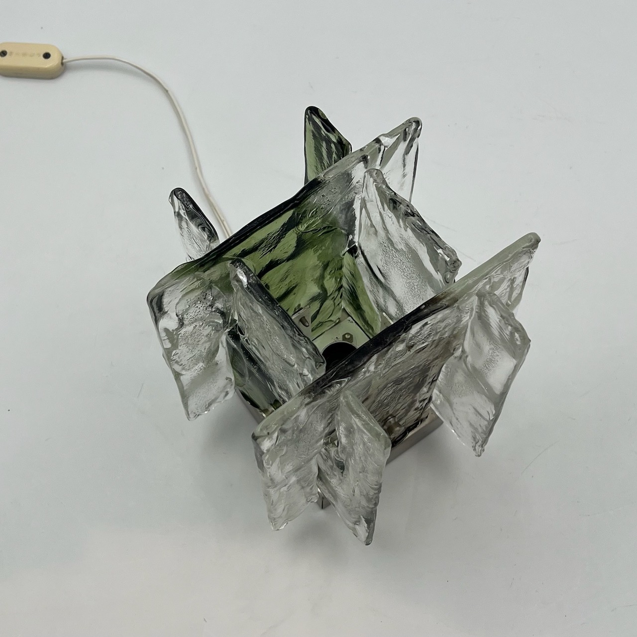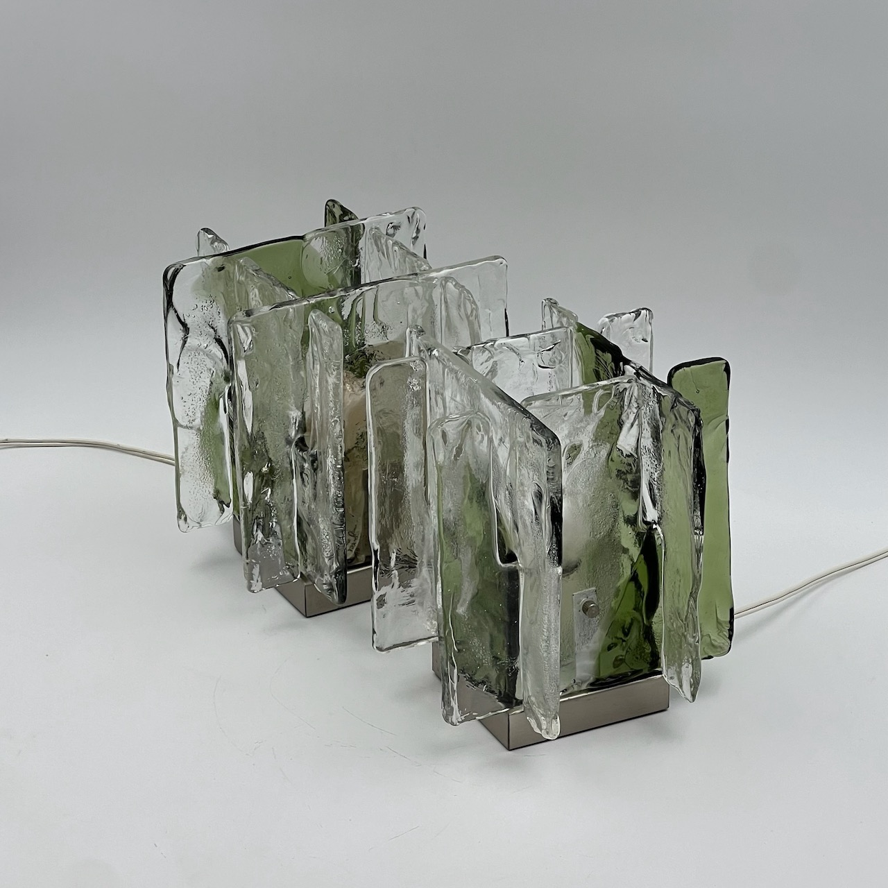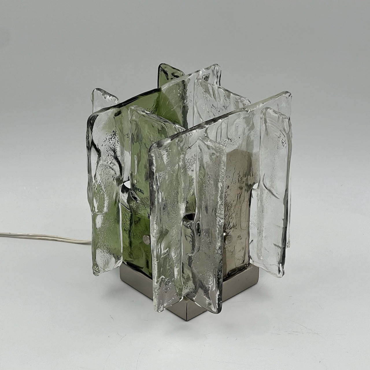 item. table lampsmaker. mazzegaperiod. 1970scountry. Italymaterial. ice-like murano glass, metalcolor. green / brown, clear, chrome silverdimensions (cm). 17.5 x 17.5 x 24 Hcondition. new old stock, never used. excellent vintage conditions, with healthy glass and minor traces of oxidation of the metallic base.art. no. 1374
