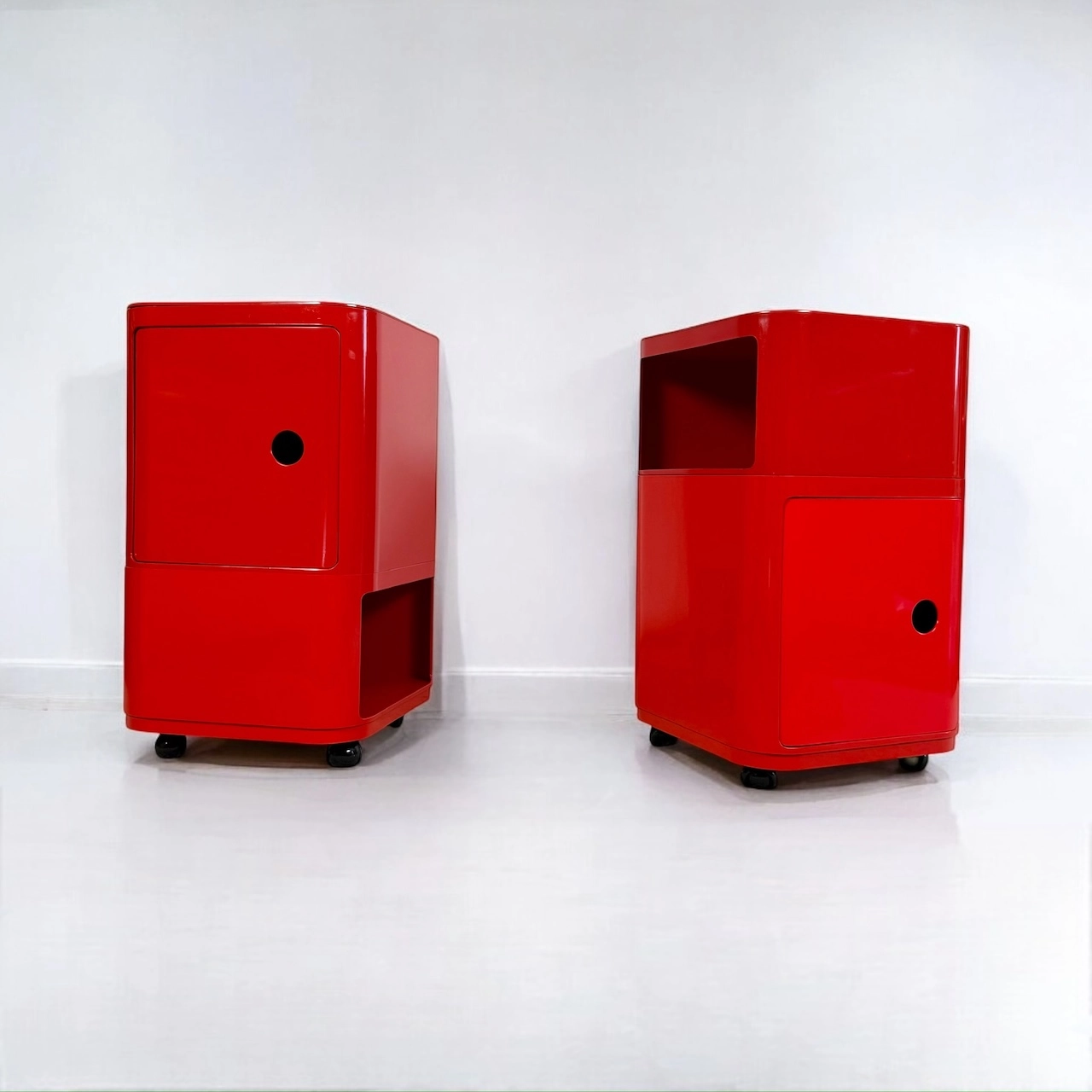 Introducing an exceptionally rare pair of square modular Kartell Componibili, designed by Anna Castelli Ferrieri for Kartell in 1967. While the cylindrical models are widely recognized, this square-base edition is far less common—and in this striking red finish, the set is truly exceptional.