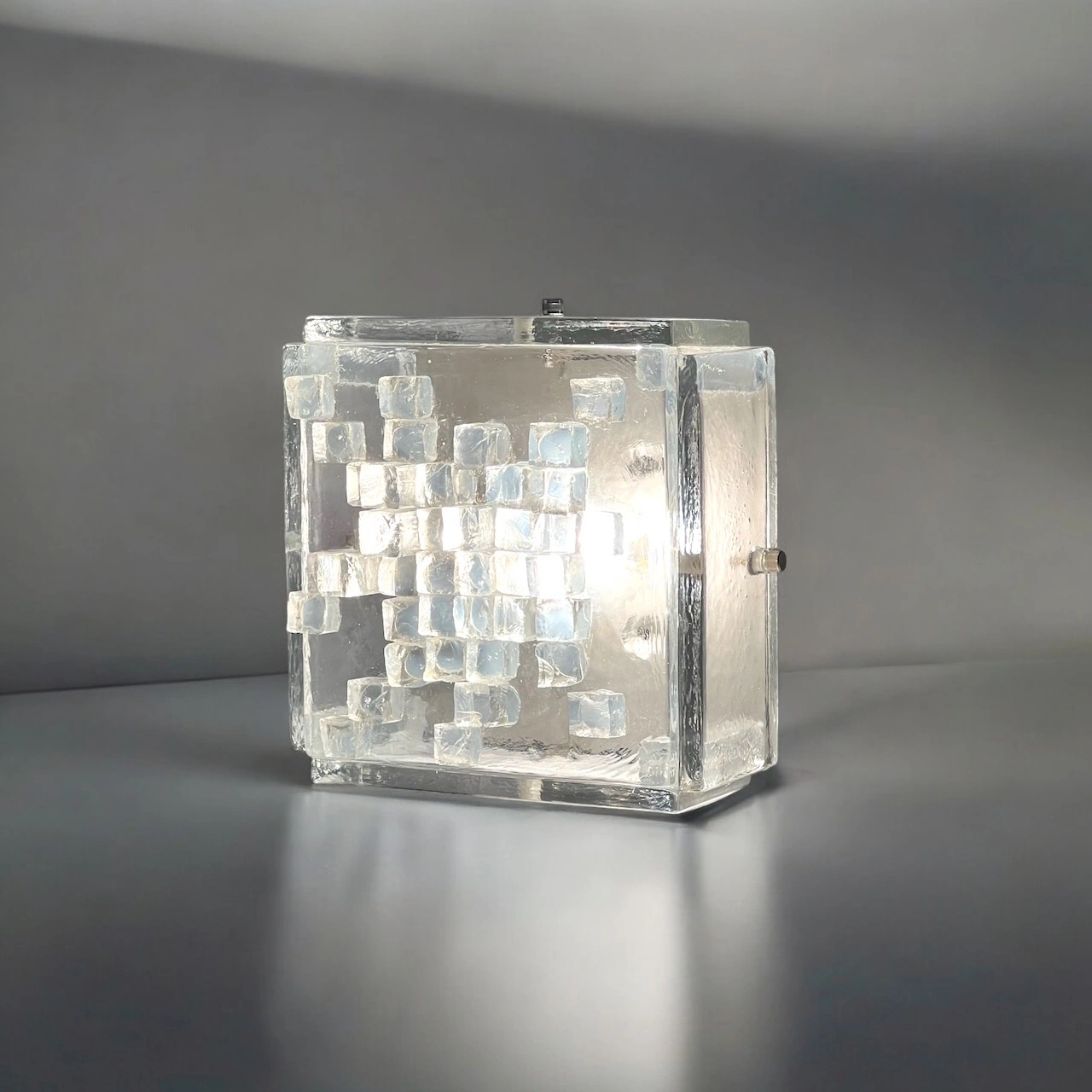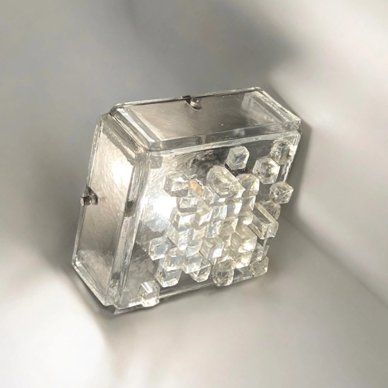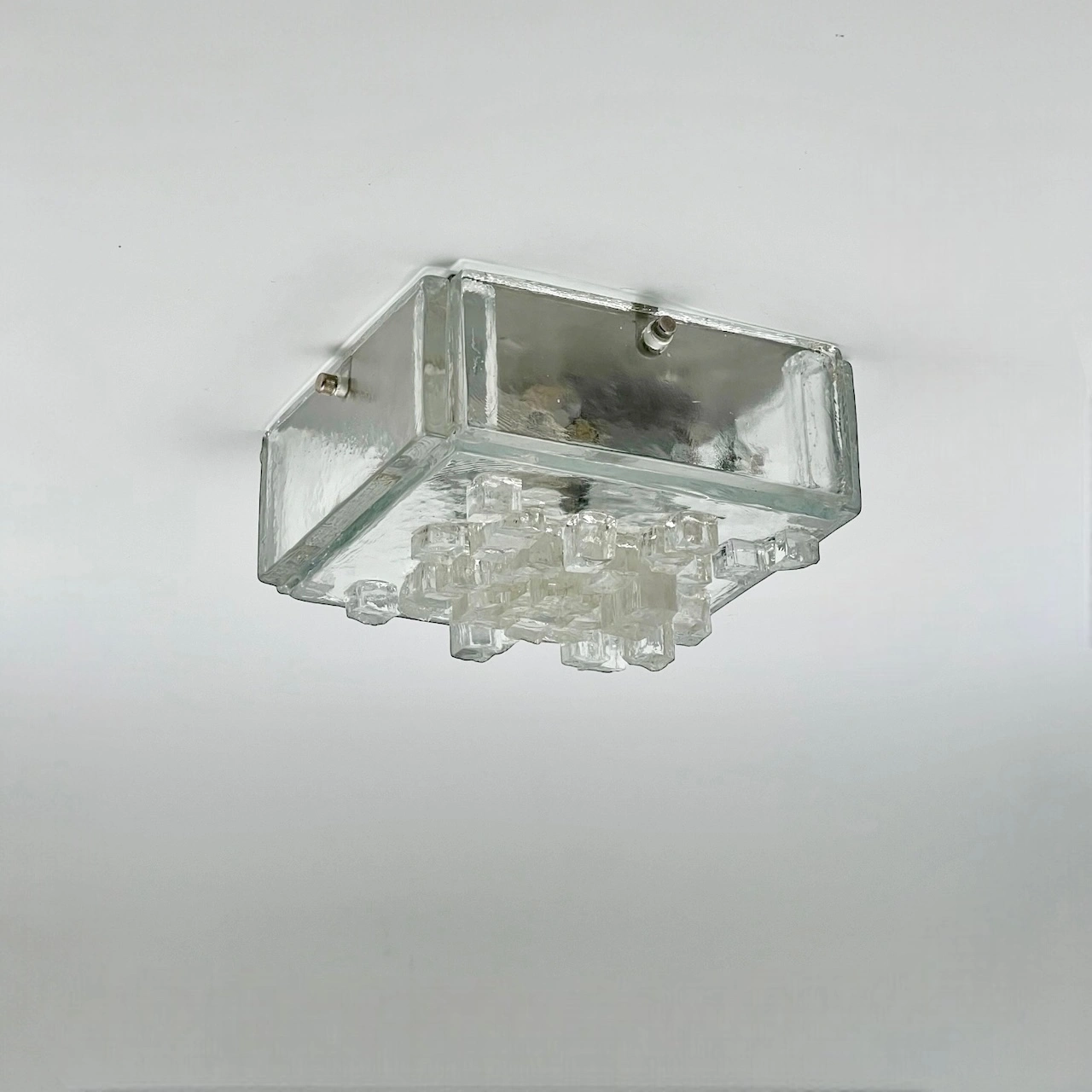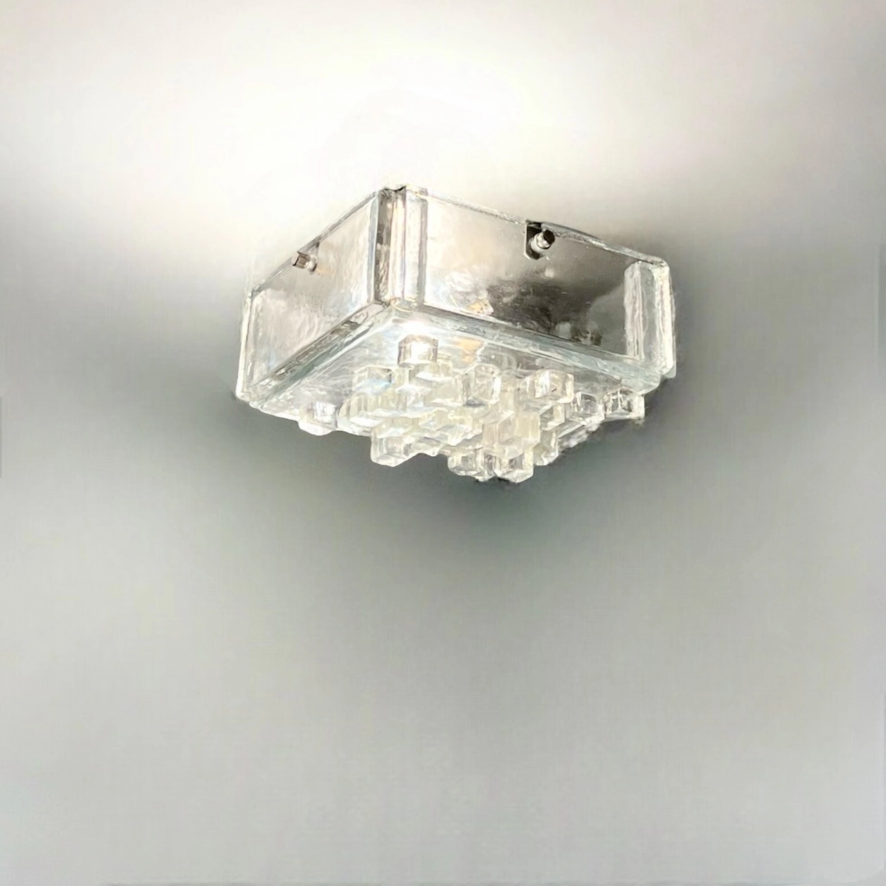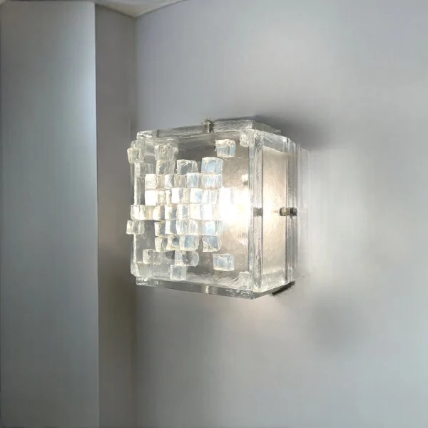 This stunning wall or ceiling light is a true testament to the craftsmanship and creativity of the era. Crafted from thick, clear glass, the lamps sculptural cube exudes a bold and robust presence, while hammered glass cubes adorn the lampshade, adding texture and depth to its aesthetic.