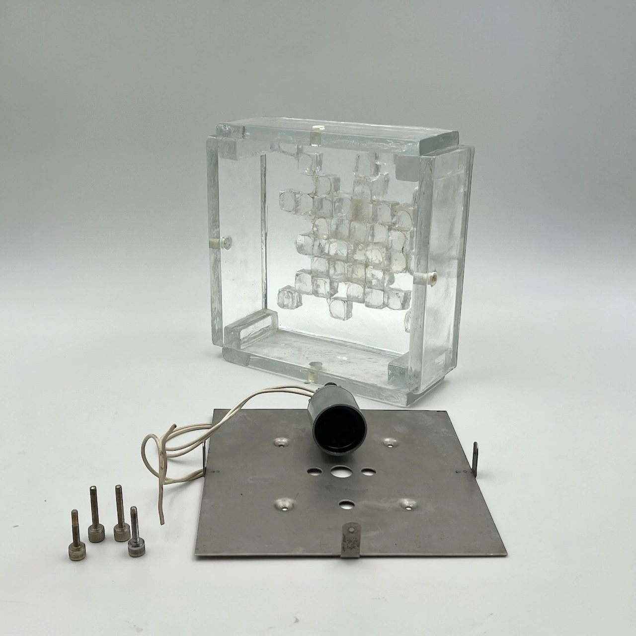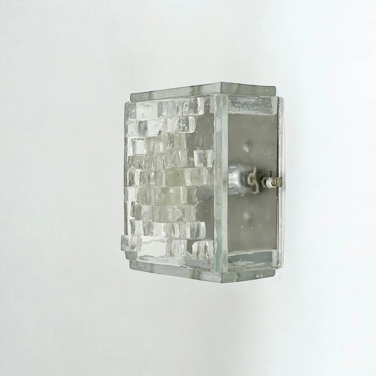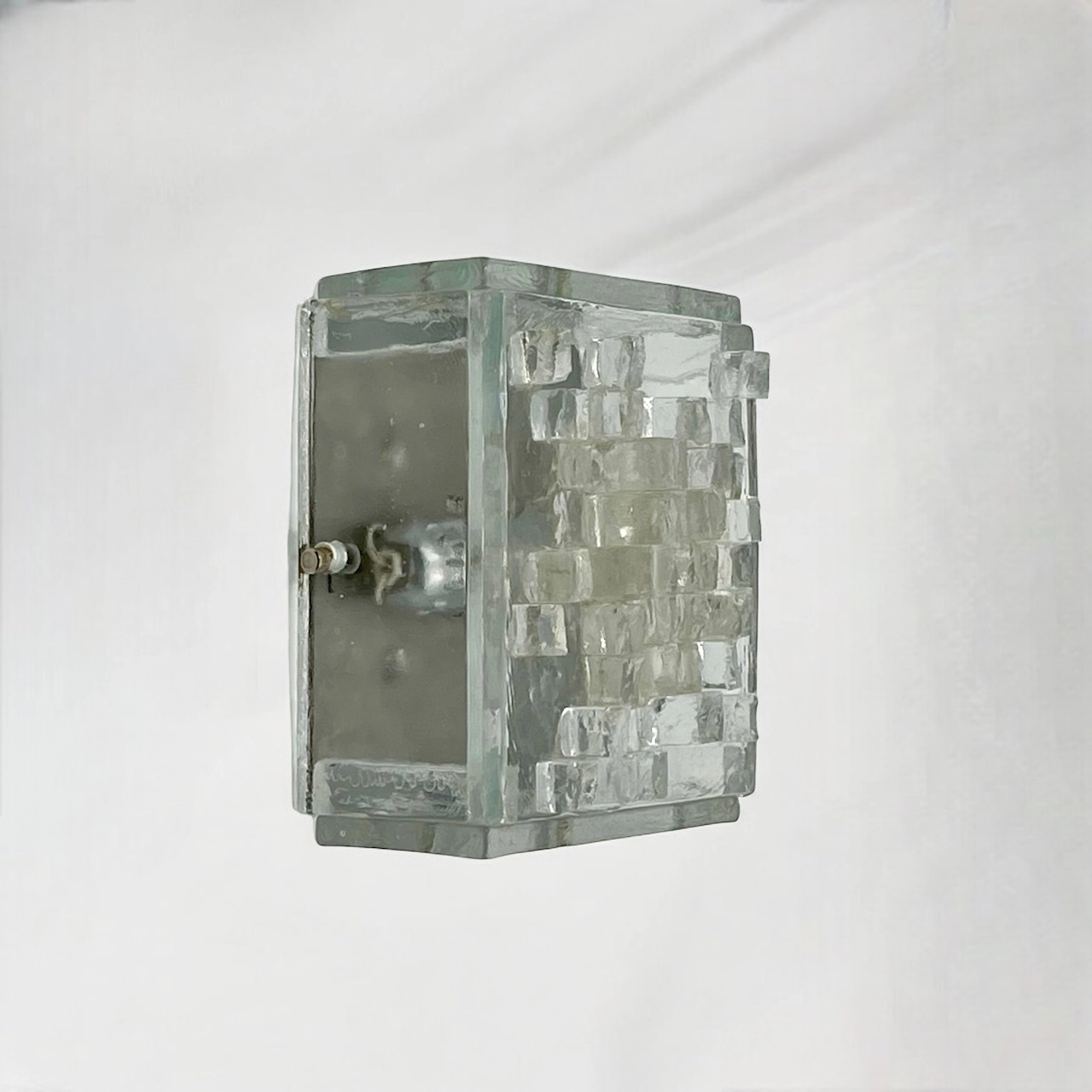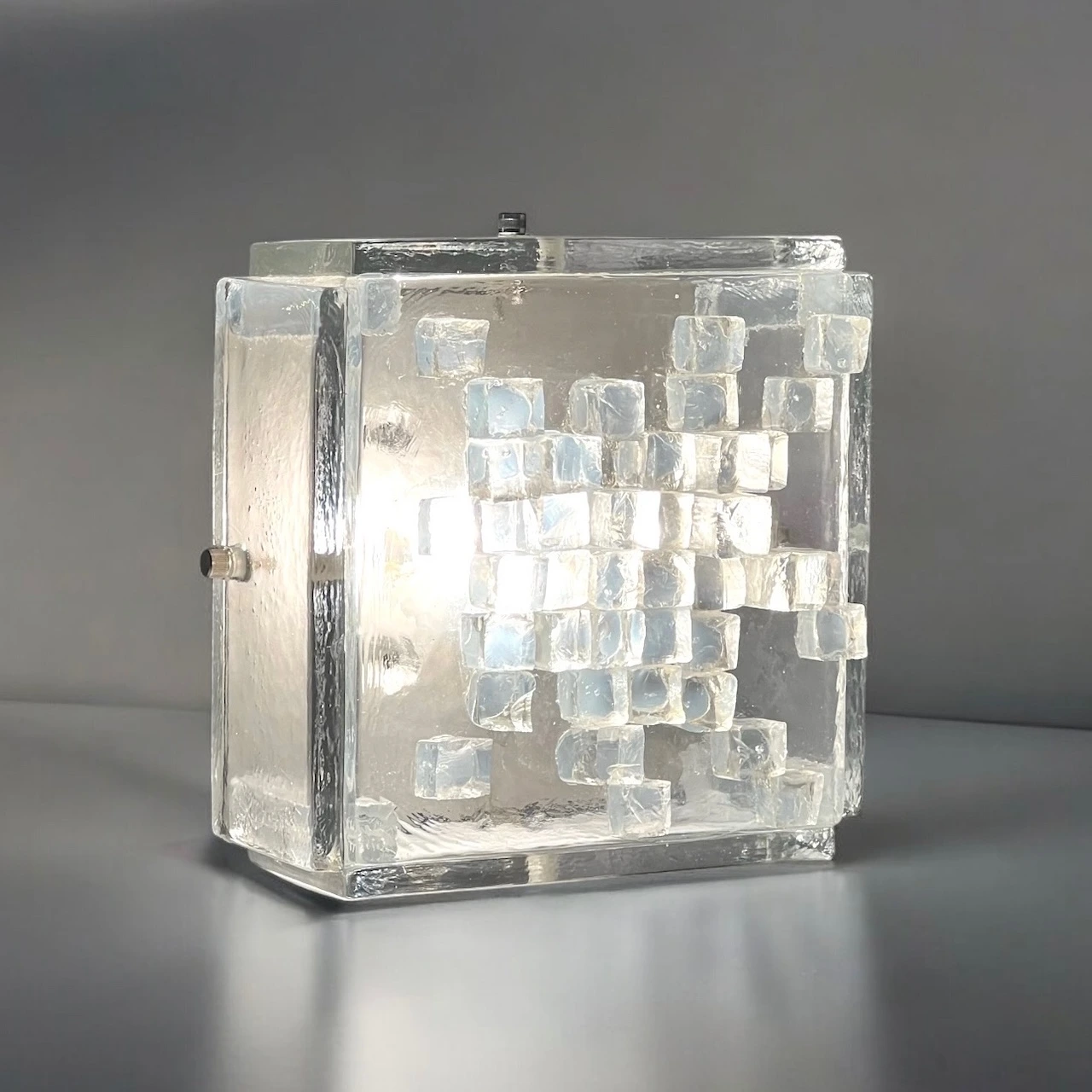 This stunning wall or ceiling light is a true testament to the craftsmanship and creativity of the era. Crafted from thick, clear glass, the lamps sculptural cube exudes a bold and robust presence, while hammered glass cubes adorn the lampshade, adding texture and depth to its aesthetic.