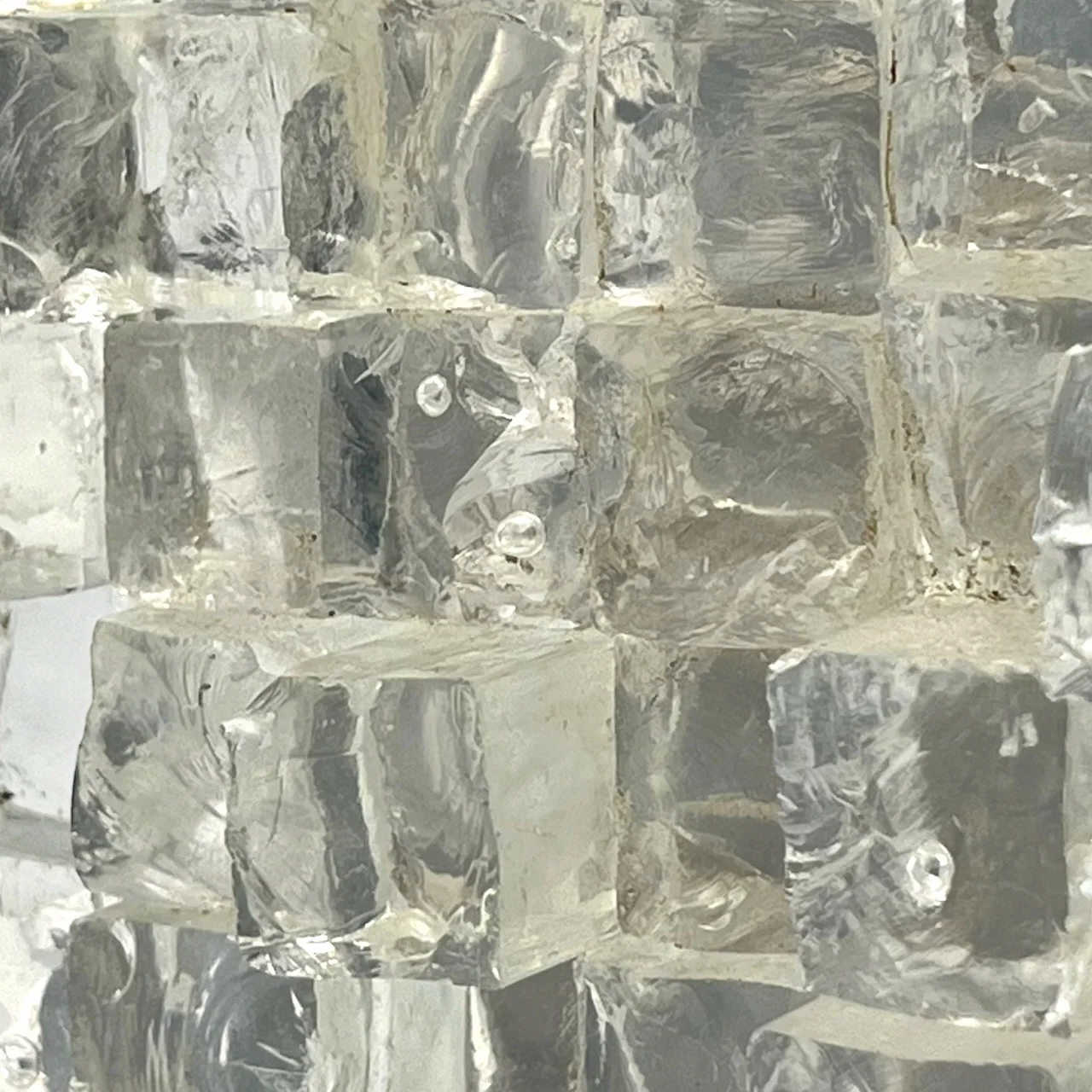 Each hammered glass cube boasts a unique and irregular shape, reflecting the organic and artisanal nature of the lamps construction. The base, crafted from thick metal and secured with four iron screws, further enhances the lamps impressive build quality and durability. The combination of materials and shapes creates a mesmerizing lighting effect, casting enchanting patterns of light and shadow that dance across the room.