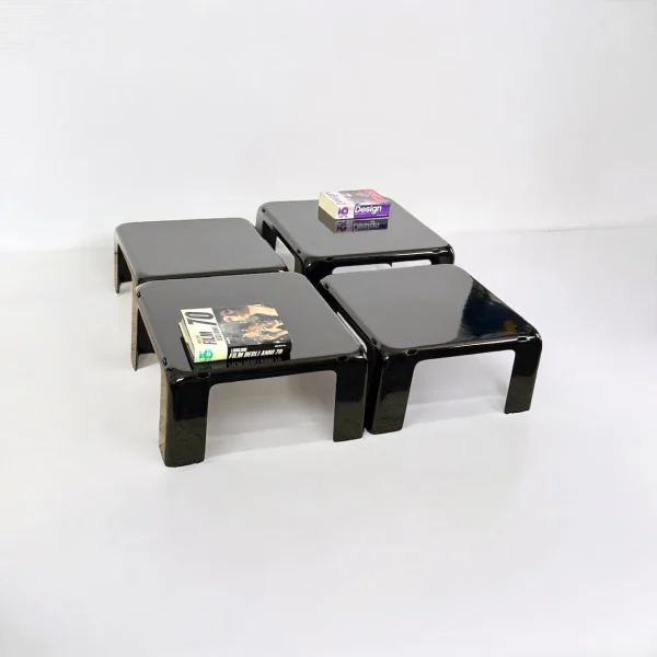 The Quattro Gatti nesting tables by Mario Bellini for C&B Meda Italia are a rare and extraordinary find in the realm of vintage furniture, epitomizing the bold and playful design of the 1960s Space Age era. Designed in 1967, this unique set is crafted from fiberlite resin, a material conceived for durability and vibrant color. The tables feature a rare glossy black hue adding an touch of timeless elegance, while maintaining the minimalistic, sculptural quality that Bellinis designs are renowned for.