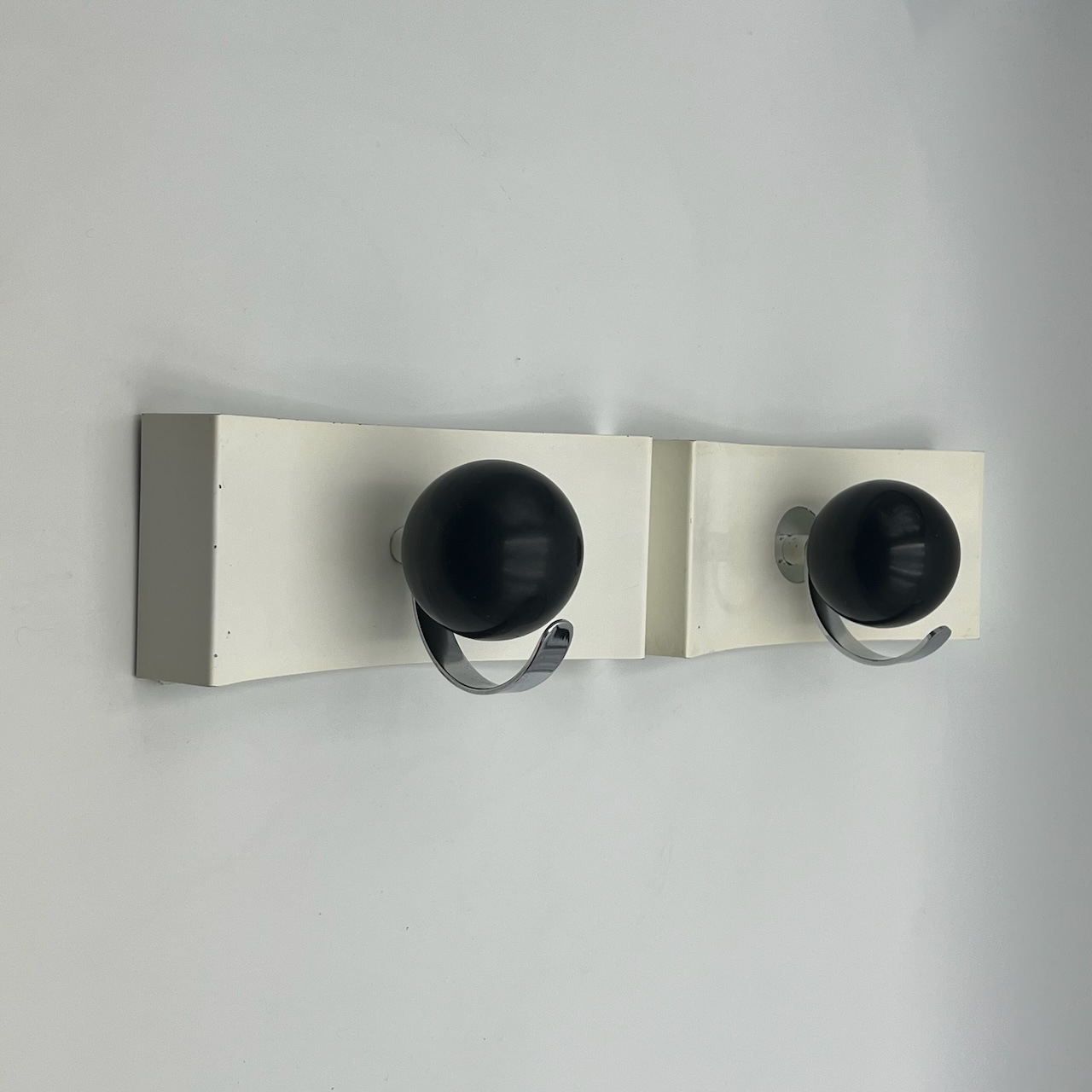 These distinctive space age coat hooks have a beautiful design, enhanced by the combination of straight and curved lines and the contrast of colors. The structure made of white lacquered metal supports the chromed metal hooks and a big plastic sphere.
