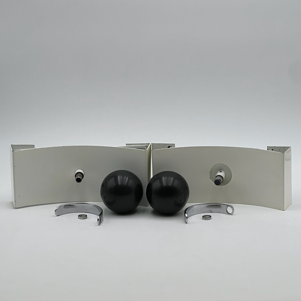 Rare pair of space age coat hangers produced by Luci Milano in the 1970s. Made of lacquered white metal with curved shapes and a big plastic sphere.
