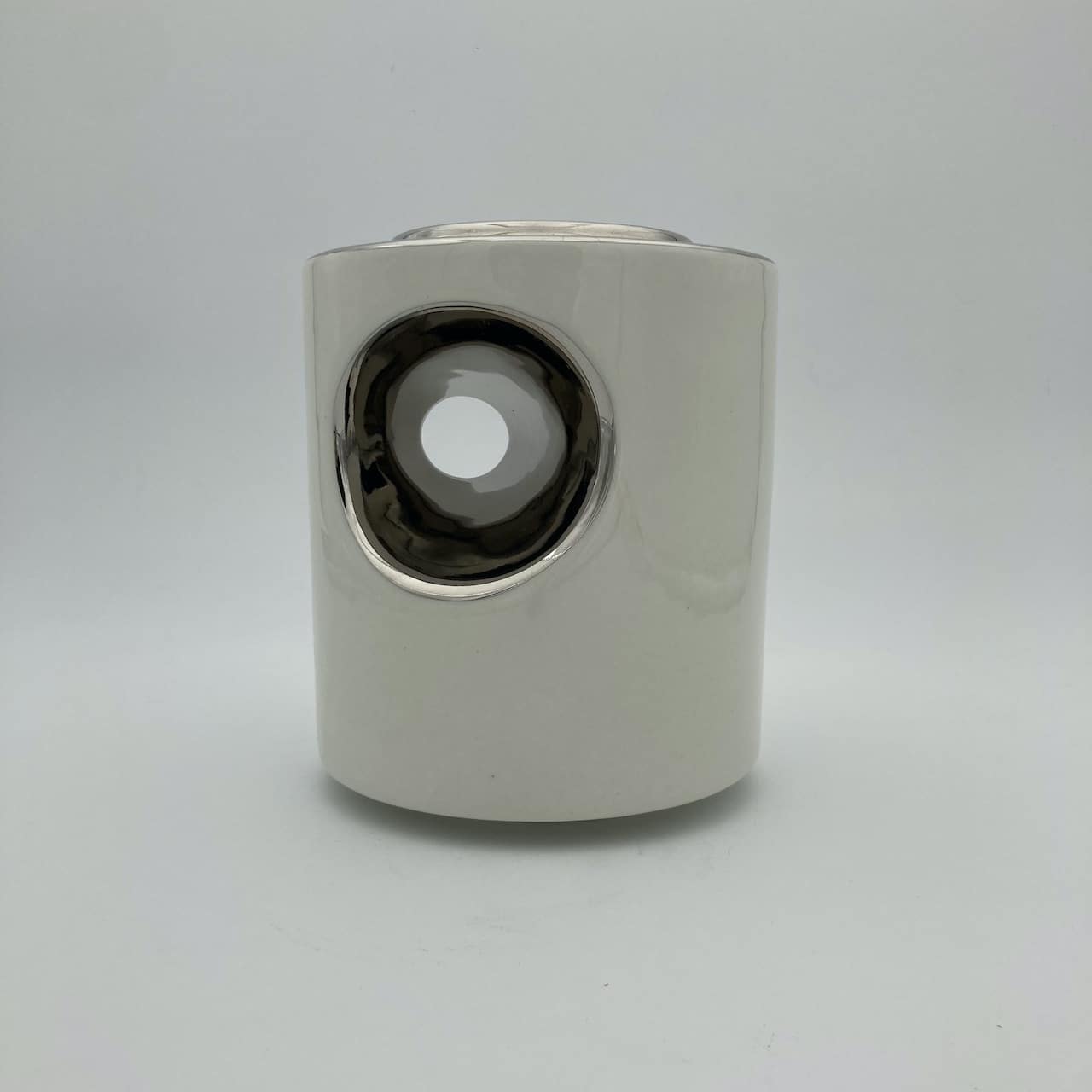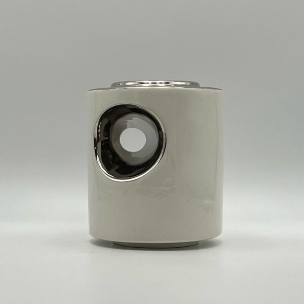 Gorgeous Space Age UFO Vase, produced by SSF in Italy in the 1970s. White ceramic body with shining chrome details on the top. Also the distinctive hole on the sides has the same chromed finish, that provides an hypnotic visual effect.
