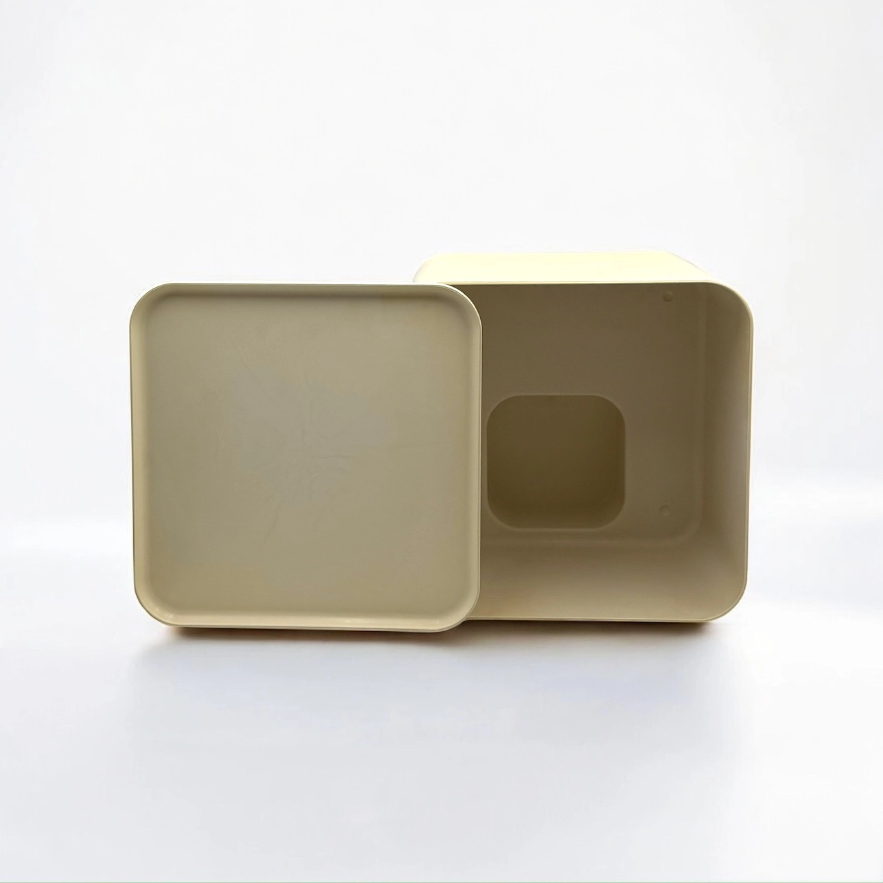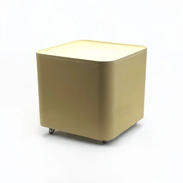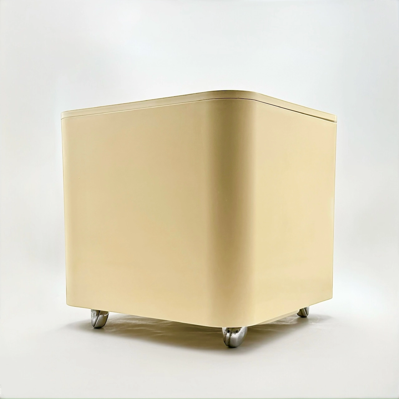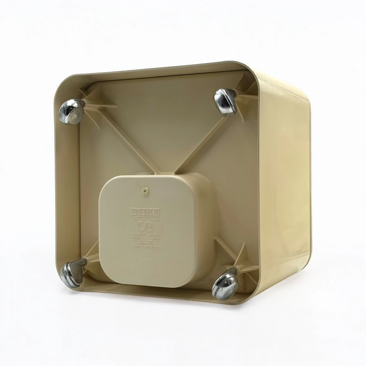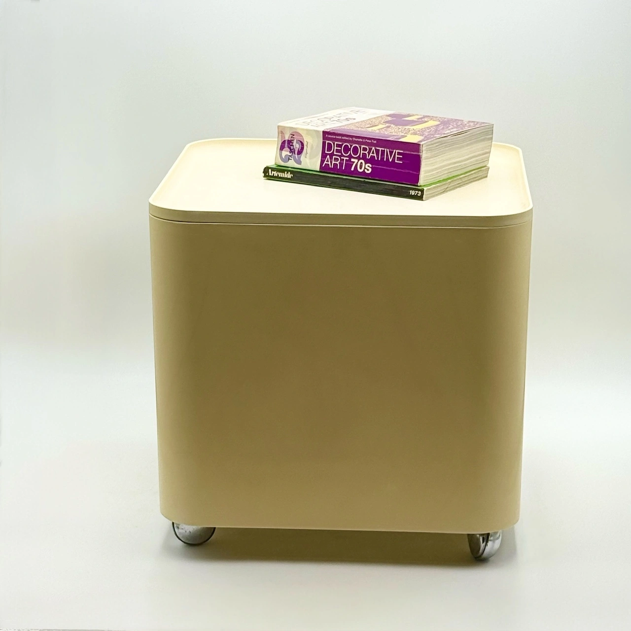 This rare table container DIME was designed by M. Siard for Collezioni Longato in the 70s., a period known for groundbreaking Italian plastic design. Crafted in durable Novodur plastic, it features a minimalist cubic shape with rounded edges and is equipped with four original chrome wheels, making it easy to move and highly functional.