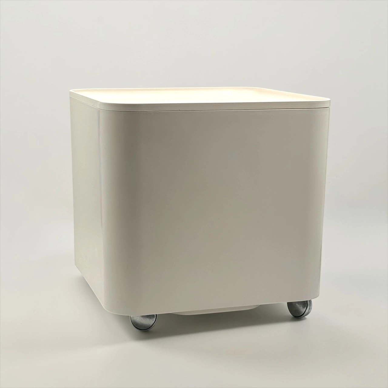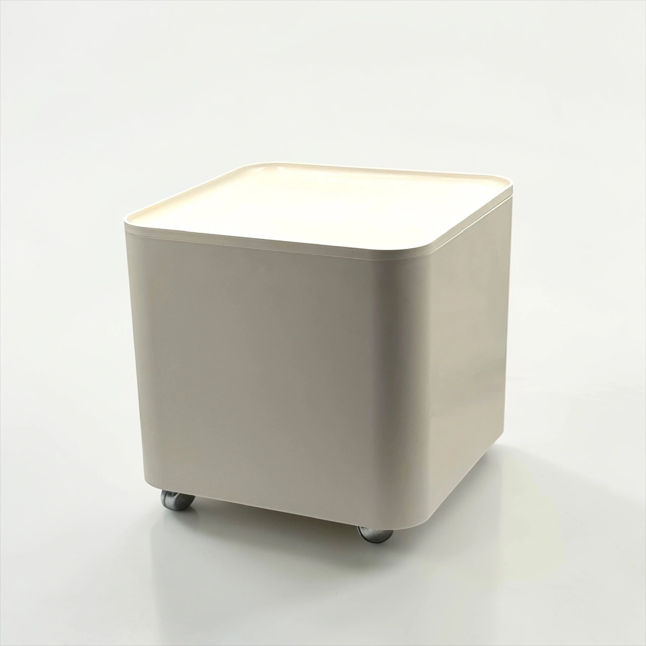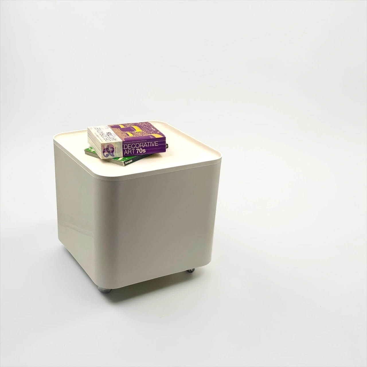 Its cubic shape and integrated wheels make it comparable to a plastic storage cube, typical of experimental Italian furniture of the 1970s. The object is conceived as a compact cubic volume with softly rounded edges, supported by four small chrome wheels that allow easy movement. The design combines the practicality of a cube storage table with the mobility of a small rolling container.