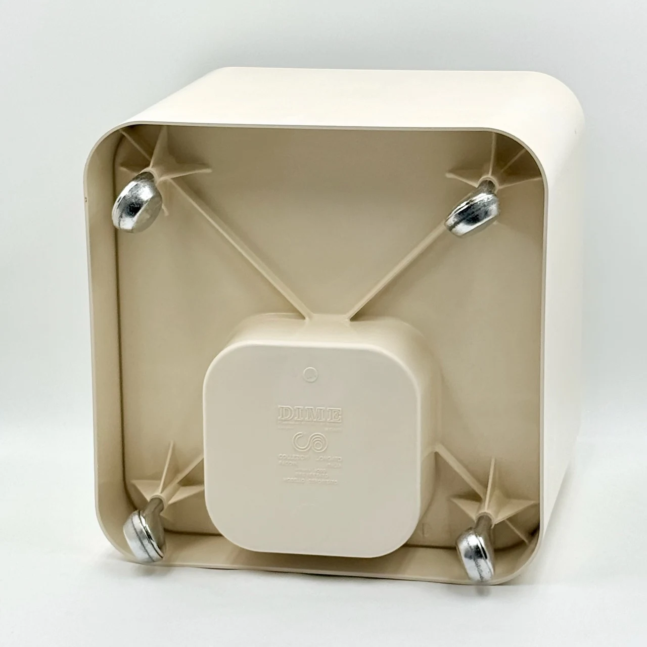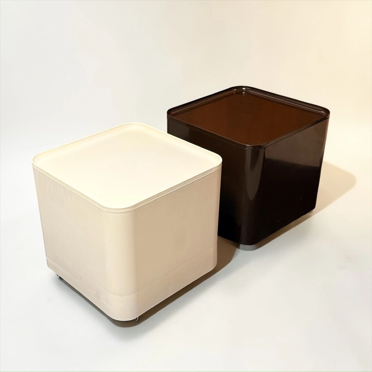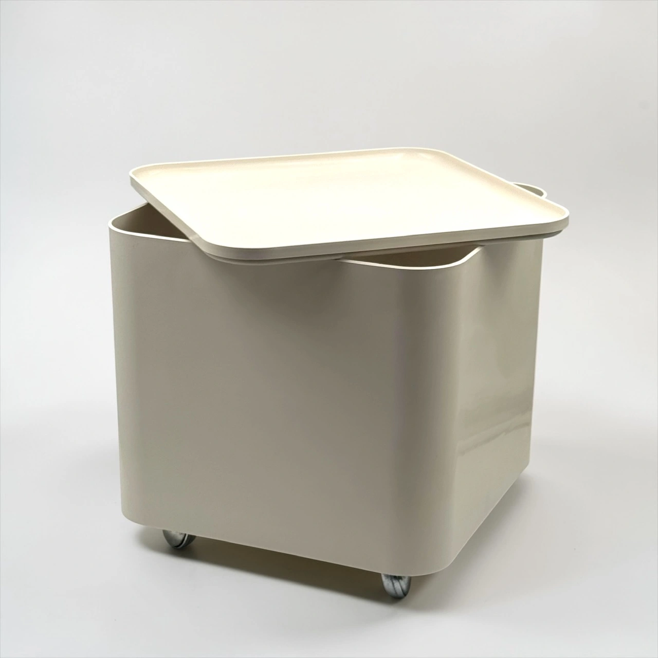 Its cubic shape and integrated wheels make it comparable to a plastic storage cube, typical of experimental Italian furniture of the 1970s. The object is conceived as a compact cubic volume with softly rounded edges, supported by four small chrome wheels that allow easy movement. The design combines the practicality of a cube storage table with the mobility of a small rolling container.