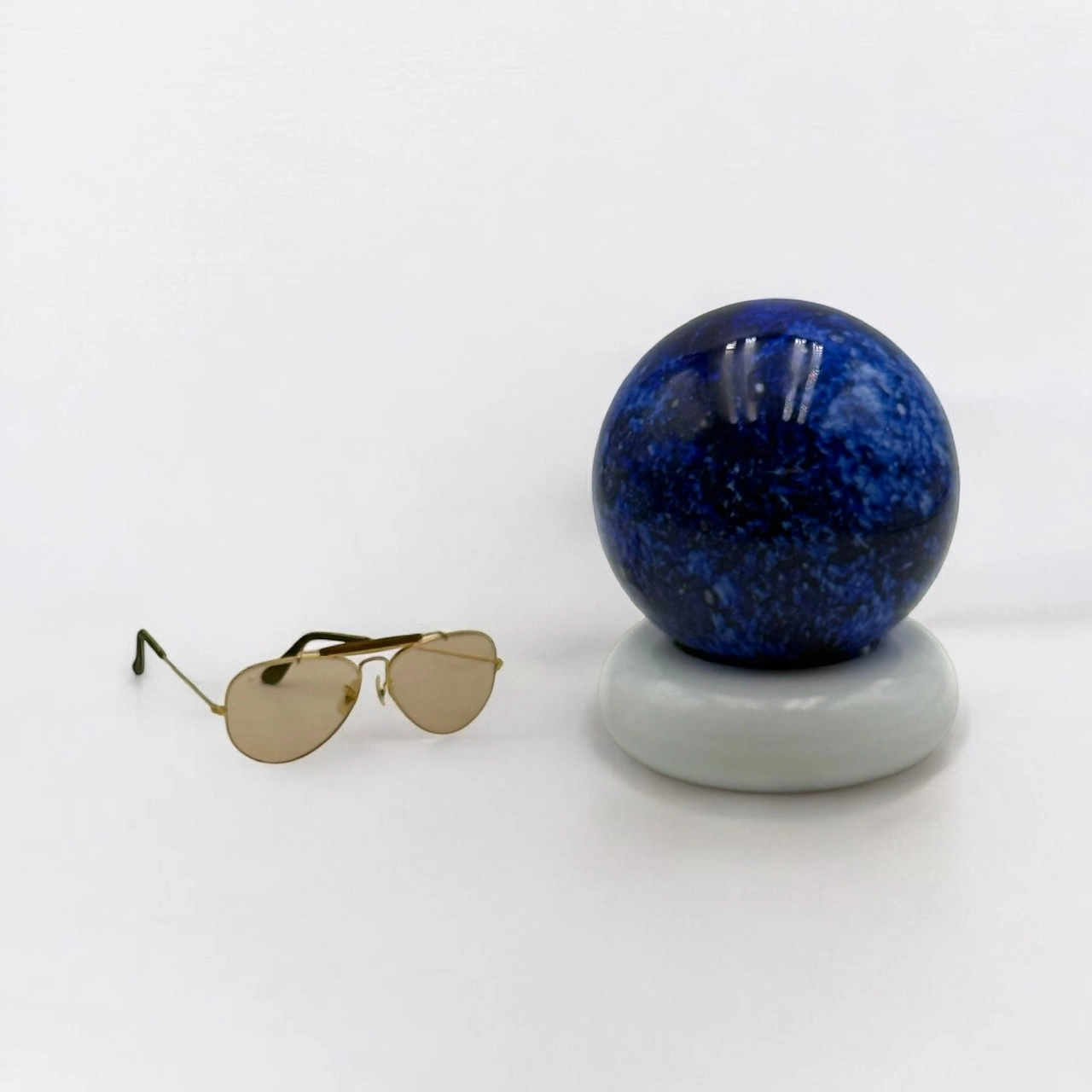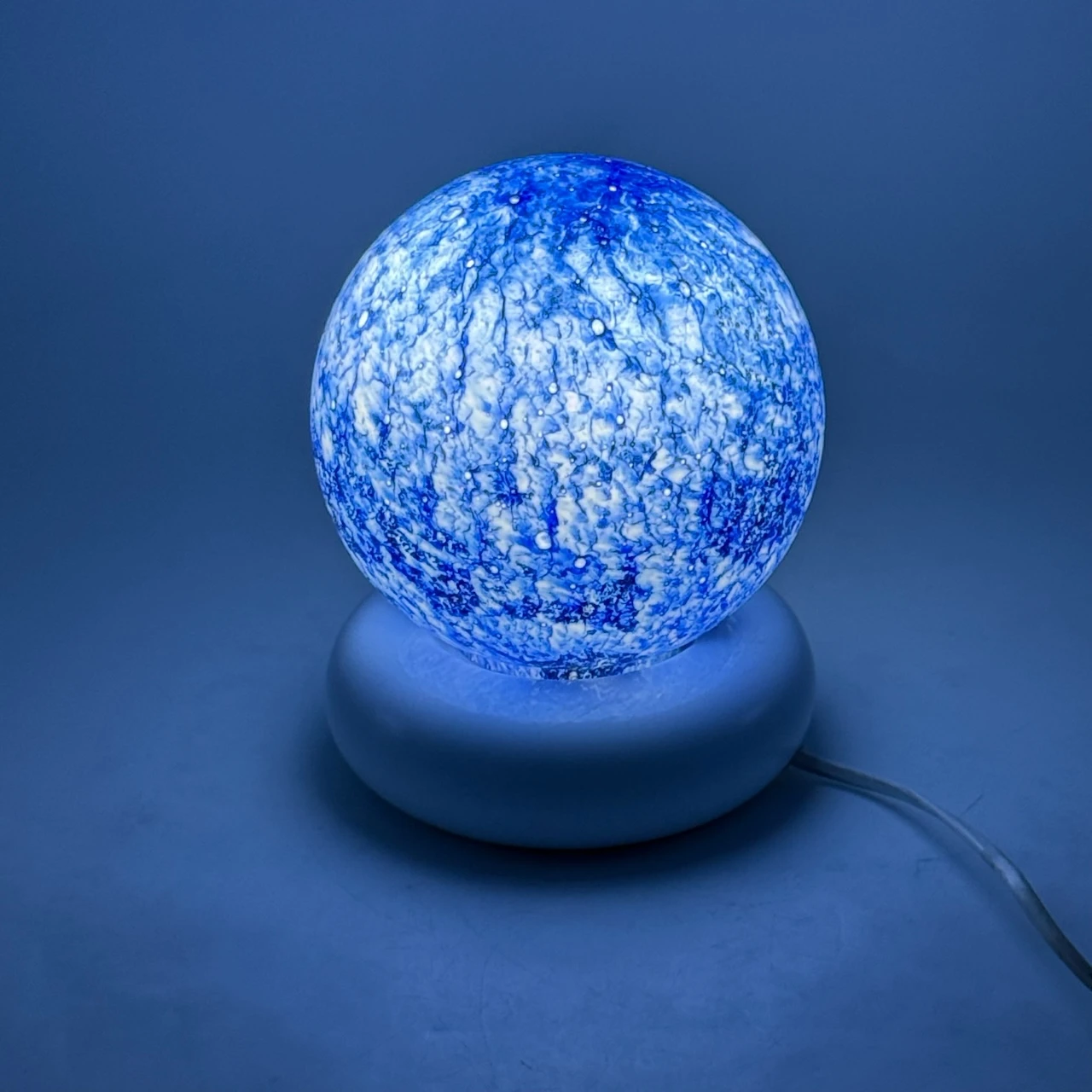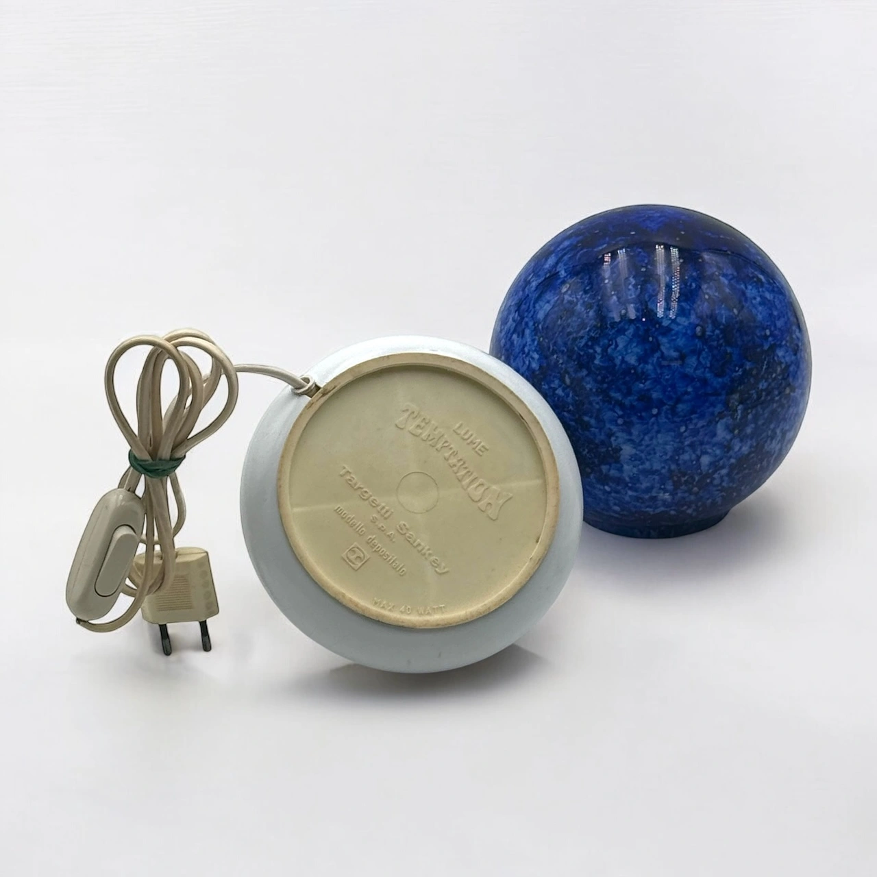 Beautiful table lamp Lume Temptation by Targetti Sankey, a striking example of 70s Italian design, featuring a blue glass globe with speckles on a white metal base. A timeless design lamp that offers a mesmerizing and charming lighting.
