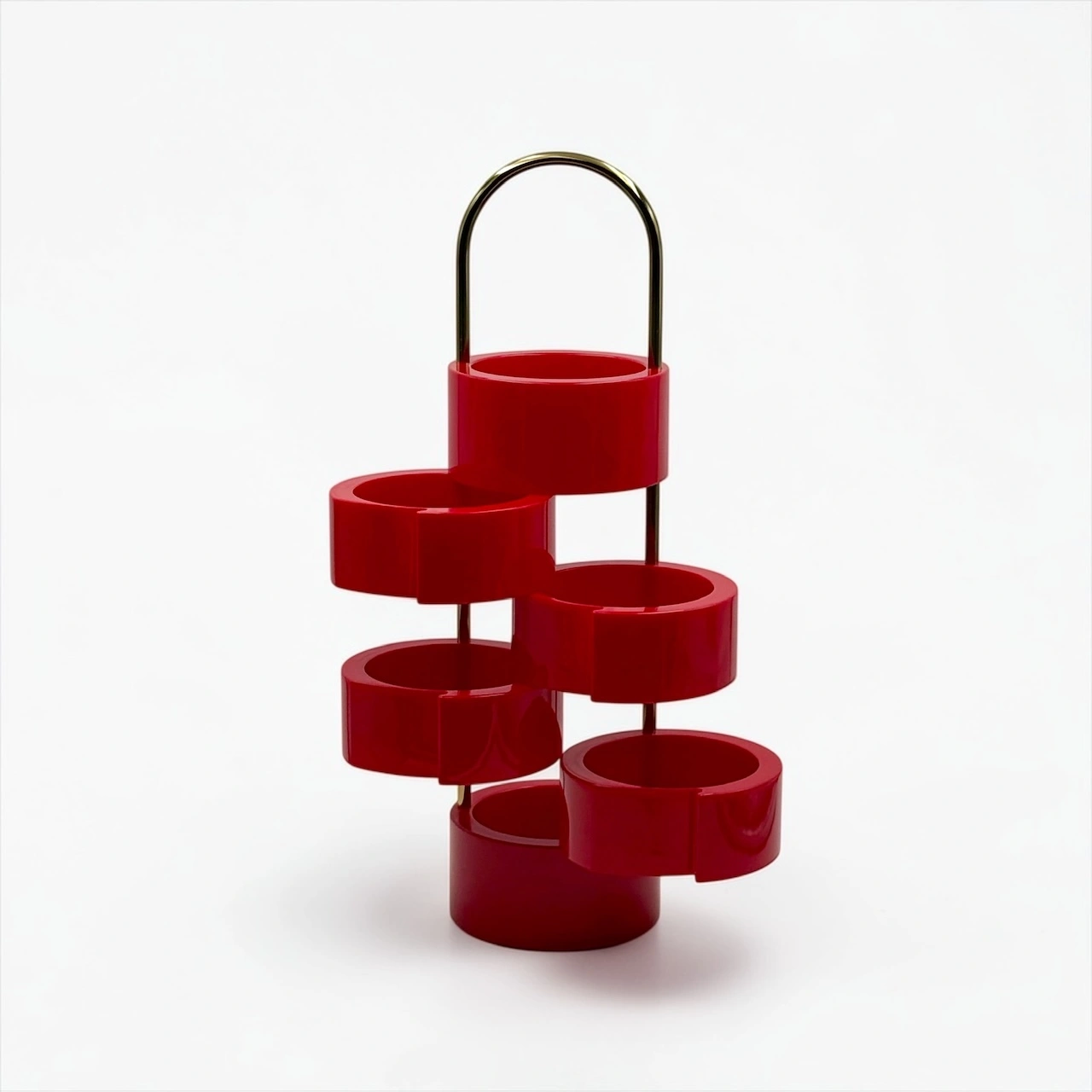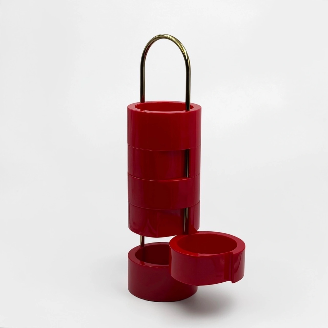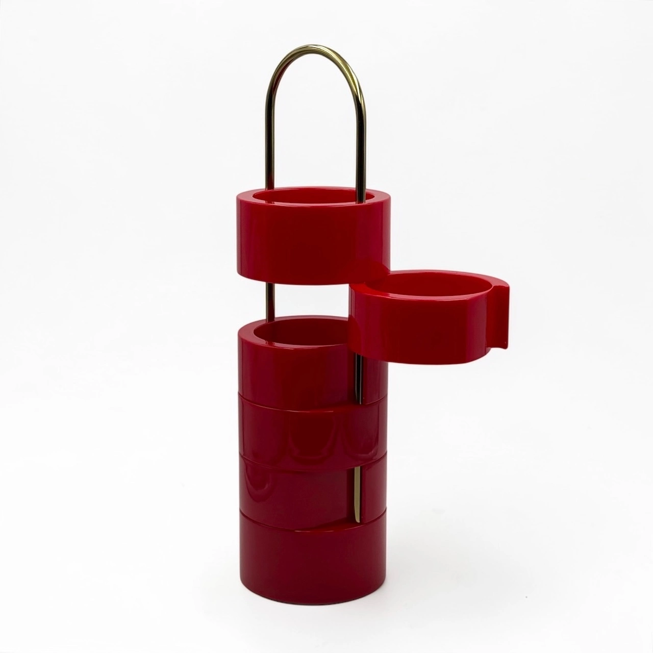 A recurring icon of 1970s interiors, this piece reflects a period of experimentation where everyday objects were reimagined with personality and flexibility. Its structure is composed of glossy red plastic elements that can be opened and adjusted, creating dynamic configurations depending on use and space.