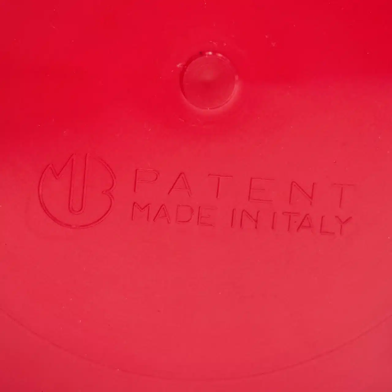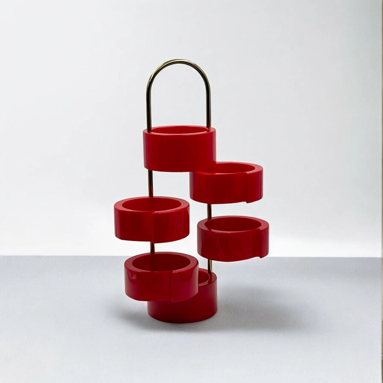 At the heart of the design is a gleaming golden metal arc that frames the composition, adding a touch of elegance and refinement. The interplay of the vibrant red compartments and the metallic sheen creates a harmonious contrast, characteristic of high-end 1970s Italian craftsmanship.