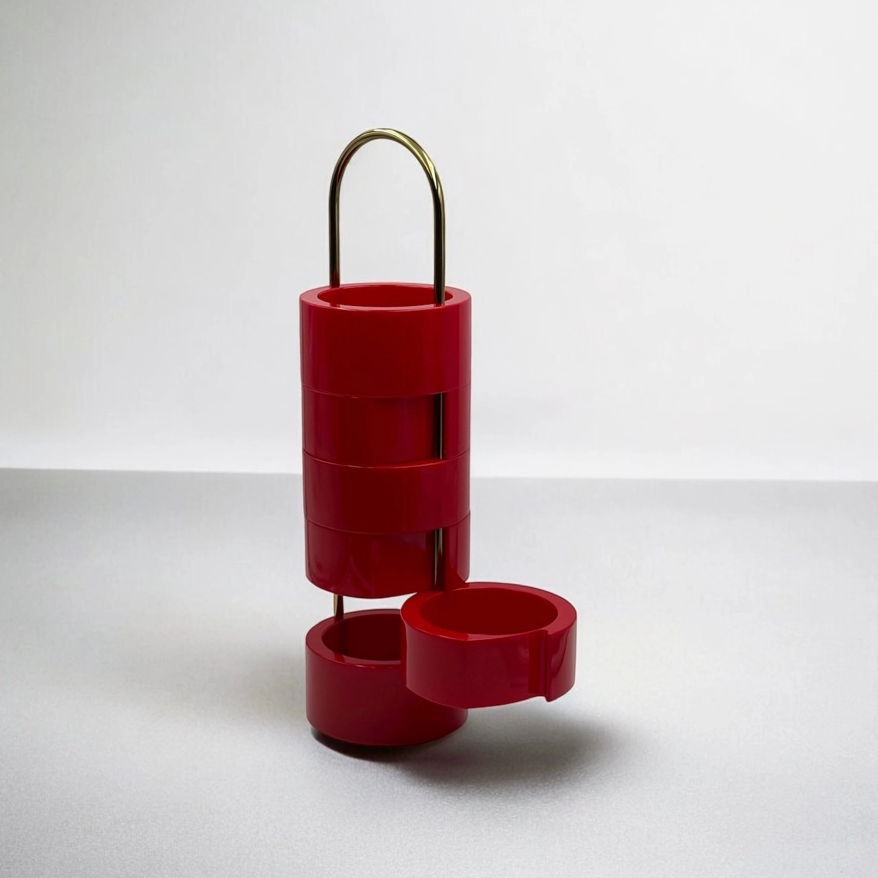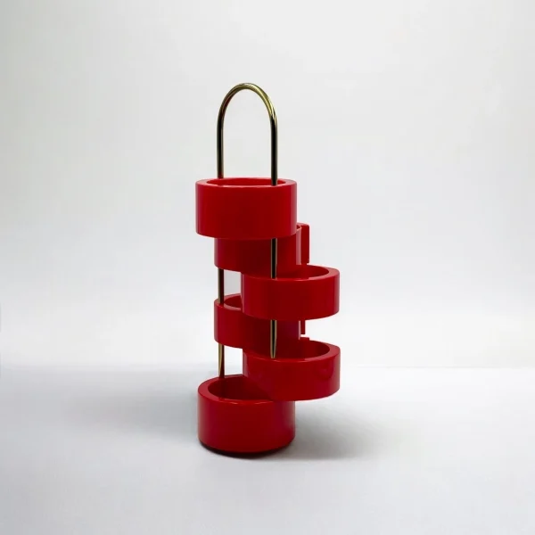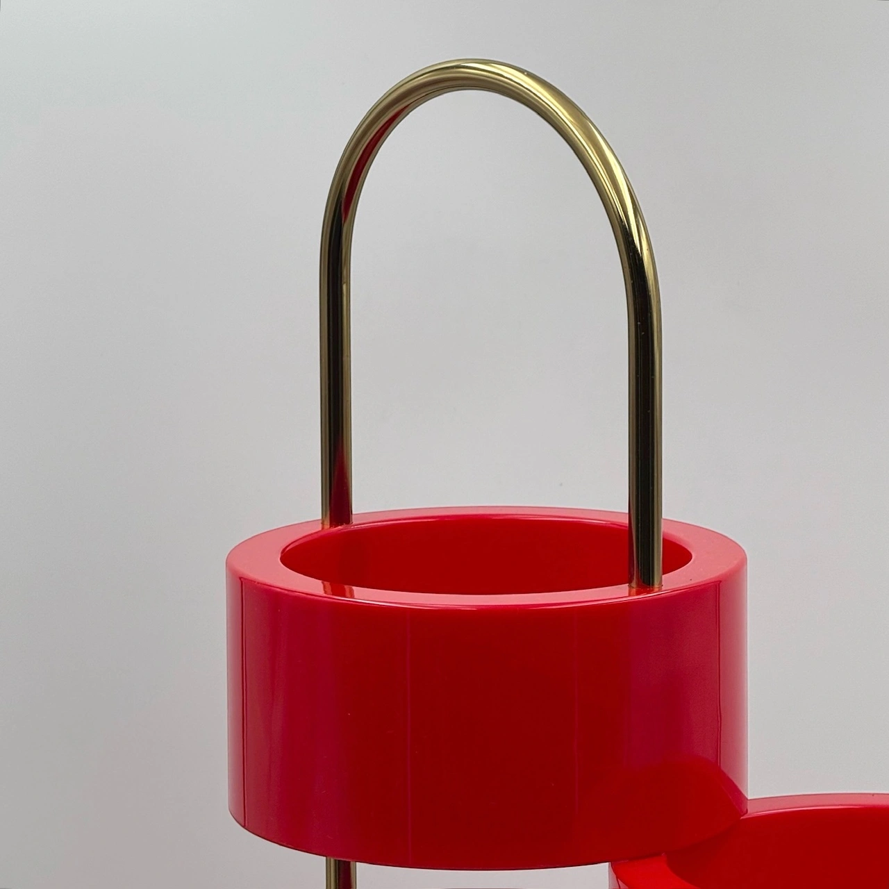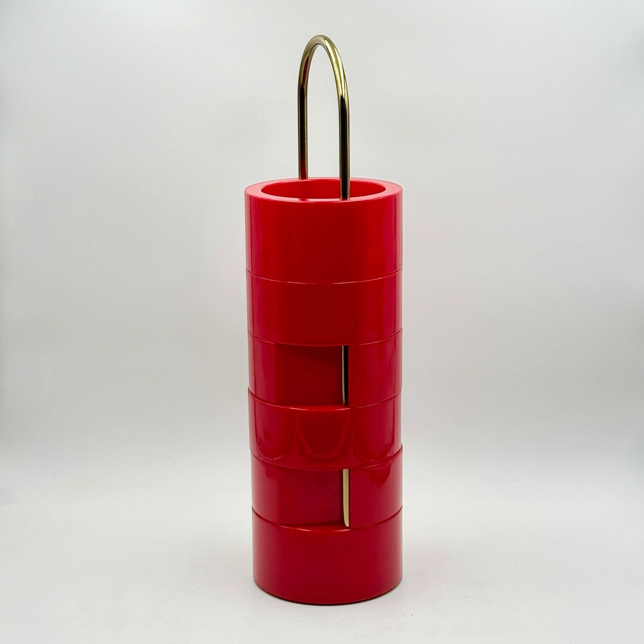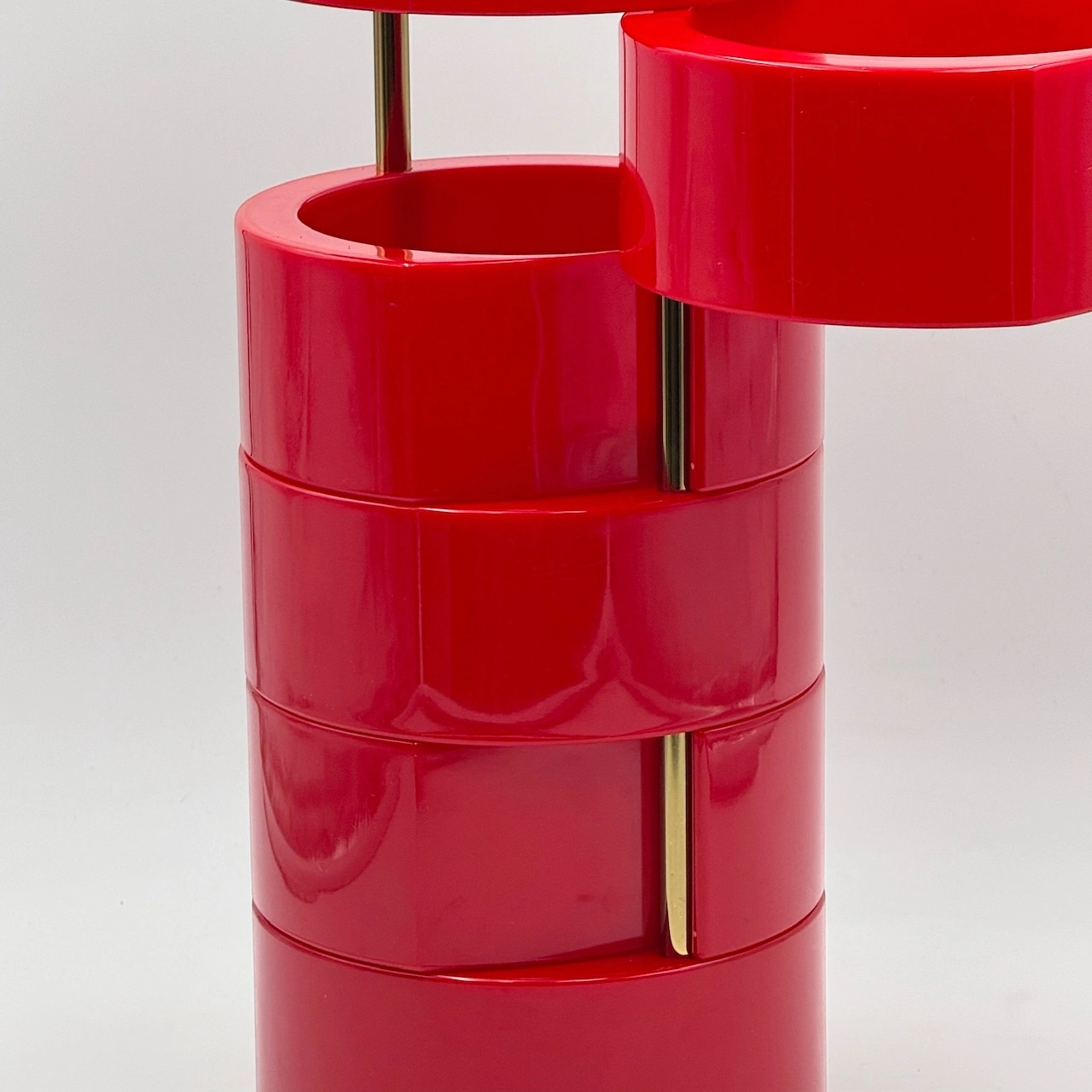 item. floor standing or table etageremaker. MBperiod. 1970scountry. Italymaterial. plastic, metalcolor. red, goldendimensions (cm). 16 x 16 x 60 H. maximum width with open compartments: 42 cm.condition. excellent vintage conditions