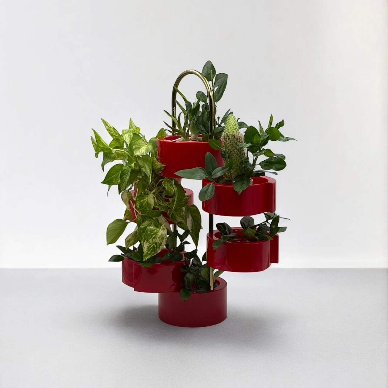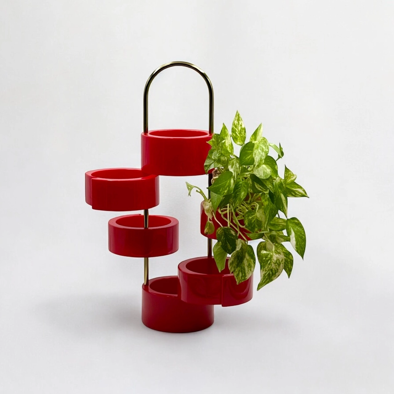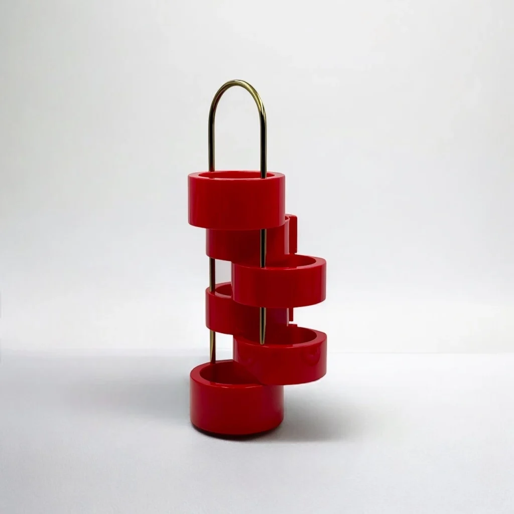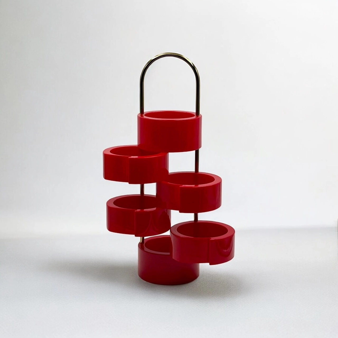 item. floor standing or table etageremaker. MBperiod. 1970scountry. Italymaterial. plastic, metalcolor. red, goldendimensions (cm). 16 x 16 x 60 H. maximum width with open compartments: 42 cm.condition. excellent vintage conditions