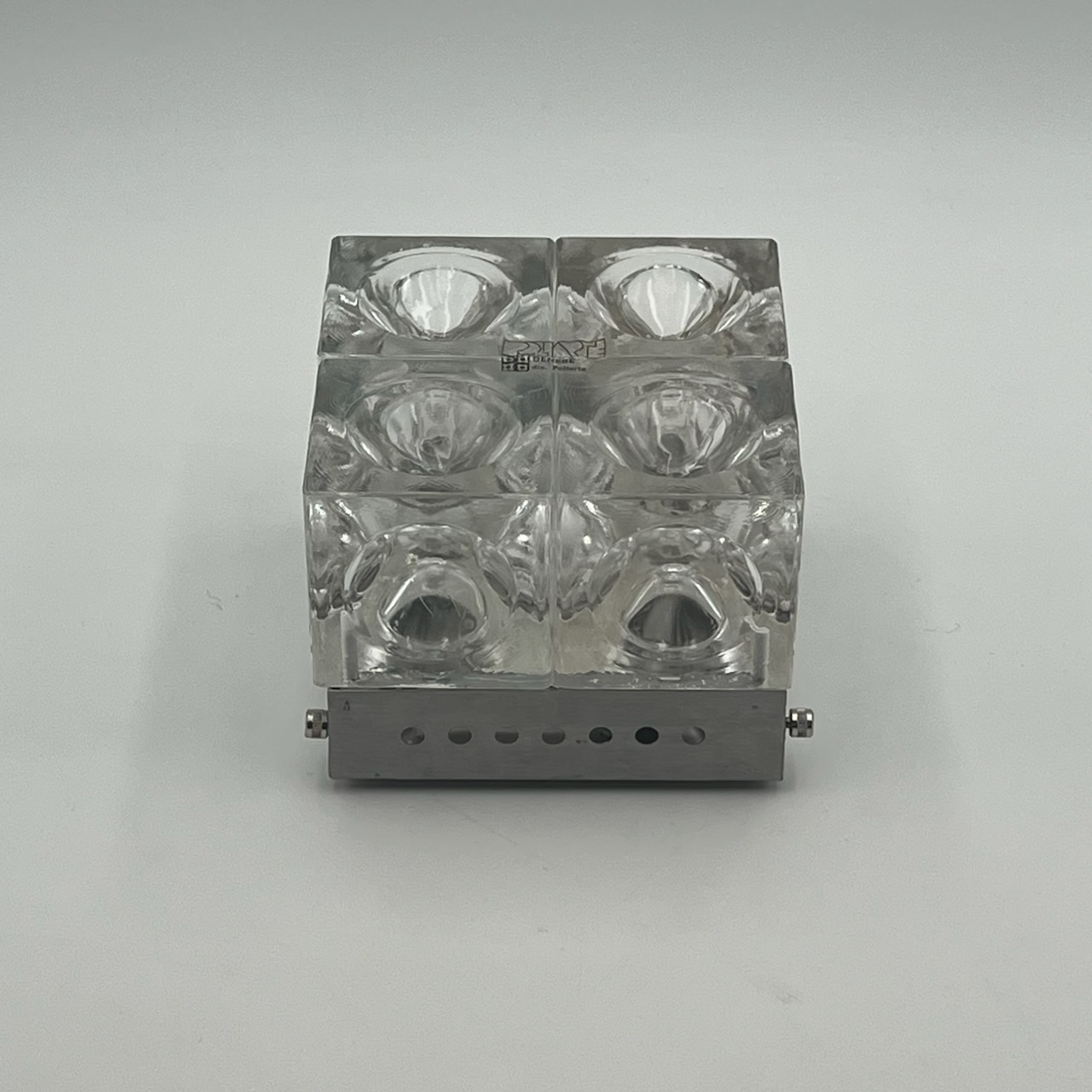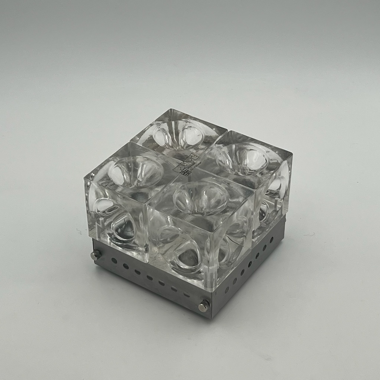 Discover the epitome of 1970s design with the iconic and rare Poliarte lamp, meticulously crafted by master Albano Poli. This masterpiece features four concave bubble glass cubes set in a metal base with era-specific steel screws. Each piece is a unique original, offering versatile wall or ceiling installation.