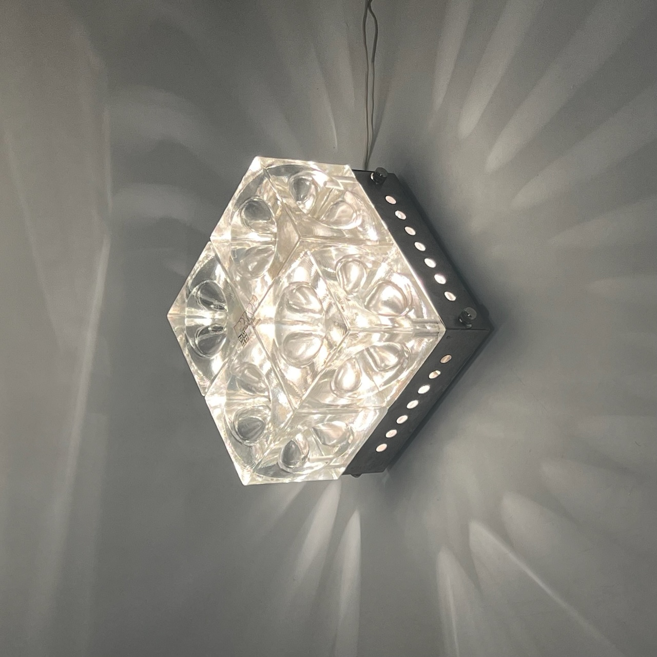 item. wall lamp, ceiling lampdesigner. albano polimaker. poliarteperiod. 1970scountry. italymaterial. glass, metalcolor. clear, silverdimensions (cm). 16.5 x 16.5 x 13 Hcondition. excellent conditionsart. no. 1331